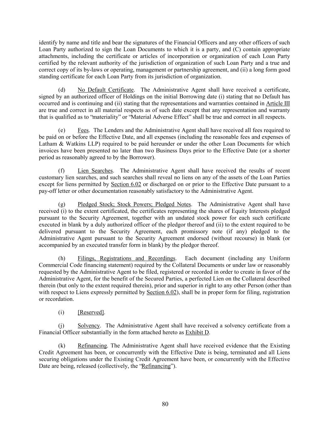 identify by name and title and bear the signatures of the Financial Officers and any other officers of such Loan Party authorized to sign the Loan Documents to which it is a party, and (C) contain appropriate attachments, including the certificate or articles of incorporation or organization of each Loan Party certified by the relevant authority of the jurisdiction of organization of such Loan Party and a true and correct copy of its by-laws or operating, management or partnership agreement, and (ii) a long form good standing certificate for each Loan Party from its jurisdiction of organization. (d) No Default Certificate. The Administrative Agent shall have received a certificate, signed by an authorized officer of Holdings on the initial Borrowing date (i) stating that no Default has occurred and is continuing and (ii) stating that the representations and warranties contained in Article III are true and correct in all material respects as of such date except that any representation and warranty that is qualified as to “materiality” or “Material Adverse Effect” shall be true and correct in all respects. (e) Fees. The Lenders and the Administrative Agent shall have received all fees required to be paid on or before the Effective Date, and all expenses (including the reasonable fees and expenses of Latham & Watkins LLP) required to be paid hereunder or under the other Loan Documents for which invoices have been presented no later than two Business Days prior to the Effective Date (or a shorter period as reasonably agreed to by the Borrower). (f) Lien Searches. The Administrative Agent shall have received the results of recent customary lien searches, and such searches shall reveal no liens on any of the assets of the Loan Parties except for liens permitted by Section 6.02 or discharged on or prior to the Effective Date pursuant to a pay-off letter or other documentation reasonably satisfactory to the Administrative Agent. (g) Pledged Stock; Stock Powers; Pledged Notes. The Administrative Agent shall have received (i) to the extent certificated, the certificates representing the shares of Equity Interests pledged pursuant to the Security Agreement, together with an undated stock power for each such certificate executed in blank by a duly authorized officer of the pledgor thereof and (ii) to the extent required to be delivered pursuant to the Security Agreement, each promissory note (if any) pledged to the Administrative Agent pursuant to the Security Agreement endorsed (without recourse) in blank (or accompanied by an executed transfer form in blank) by the pledgor thereof. (h) Filings, Registrations and Recordings. Each document (including any Uniform Commercial Code financing statement) required by the Collateral Documents or under law or reasonably requested by the Administrative Agent to be filed, registered or recorded in order to create in favor of the Administrative Agent, for the benefit of the Secured Parties, a perfected Lien on the Collateral described therein (but only to the extent required therein), prior and superior in right to any other Person (other than with respect to Liens expressly permitted by Section 6.02), shall be in proper form for filing, registration or recordation. (i) [Reserved]. (j) Solvency. The Administrative Agent shall have received a solvency certificate from a Financial Officer substantially in the form attached hereto as Exhibit D. (k) Refinancing. The Administrative Agent shall have received evidence that the Existing Credit Agreement has been, or concurrently with the Effective Date is being, terminated and all Liens securing obligations under the Existing Credit Agreement have been, or concurrently with the Effective Date are being, released (collectively, the “Refinancing”). 80