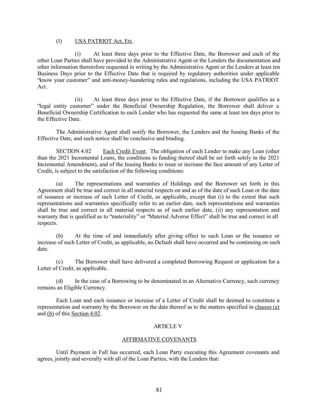 (l) USA PATRIOT Act, Etc. (i) At least three days prior to the Effective Date, the Borrower and each of the other Loan Parties shall have provided to the Administrative Agent or the Lenders the documentation and other information theretofore requested in writing by the Administrative Agent or the Lenders at least ten Business Days prior to the Effective Date that is required by regulatory authorities under applicable “know your customer” and anti-money-laundering rules and regulations, including the USA PATRIOT Act. (ii) At least three days prior to the Effective Date, if the Borrower qualifies as a “legal entity customer” under the Beneficial Ownership Regulation, the Borrower shall deliver a Beneficial Ownership Certification to each Lender who has requested the same at least ten days prior to the Effective Date. The Administrative Agent shall notify the Borrower, the Lenders and the Issuing Banks of the Effective Date, and such notice shall be conclusive and binding. SECTION 4.02 Each Credit Event. The obligation of each Lender to make any Loan (other than the 2021 Incremental Loans, the conditions to funding thereof shall be set forth solely in the 2021 Incremental Amendment), and of the Issuing Banks to issue or increase the face amount of any Letter of Credit, is subject to the satisfaction of the following conditions: (a) The representations and warranties of Holdings and the Borrower set forth in this Agreement shall be true and correct in all material respects on and as of the date of such Loan or the date of issuance or increase of such Letter of Credit, as applicable, except that (i) to the extent that such representations and warranties specifically refer to an earlier date, such representations and warranties shall be true and correct in all material respects as of such earlier date, (ii) any representation and warranty that is qualified as to “materiality” or “Material Adverse Effect” shall be true and correct in all respects. (b) At the time of and immediately after giving effect to such Loan or the issuance or increase of such Letter of Credit, as applicable, no Default shall have occurred and be continuing on such date. (c) The Borrower shall have delivered a completed Borrowing Request or application for a Letter of Credit, as applicable. (d) In the case of a Borrowing to be denominated in an Alternative Currency, such currency remains an Eligible Currency. Each Loan and each issuance or increase of a Letter of Credit shall be deemed to constitute a representation and warranty by the Borrower on the date thereof as to the matters specified in clauses (a) and (b) of this Section 4.02. ARTICLE V AFFIRMATIVE COVENANTS Until Payment in Full has occurred, each Loan Party executing this Agreement covenants and agrees, jointly and severally with all of the Loan Parties, with the Lenders that: 81