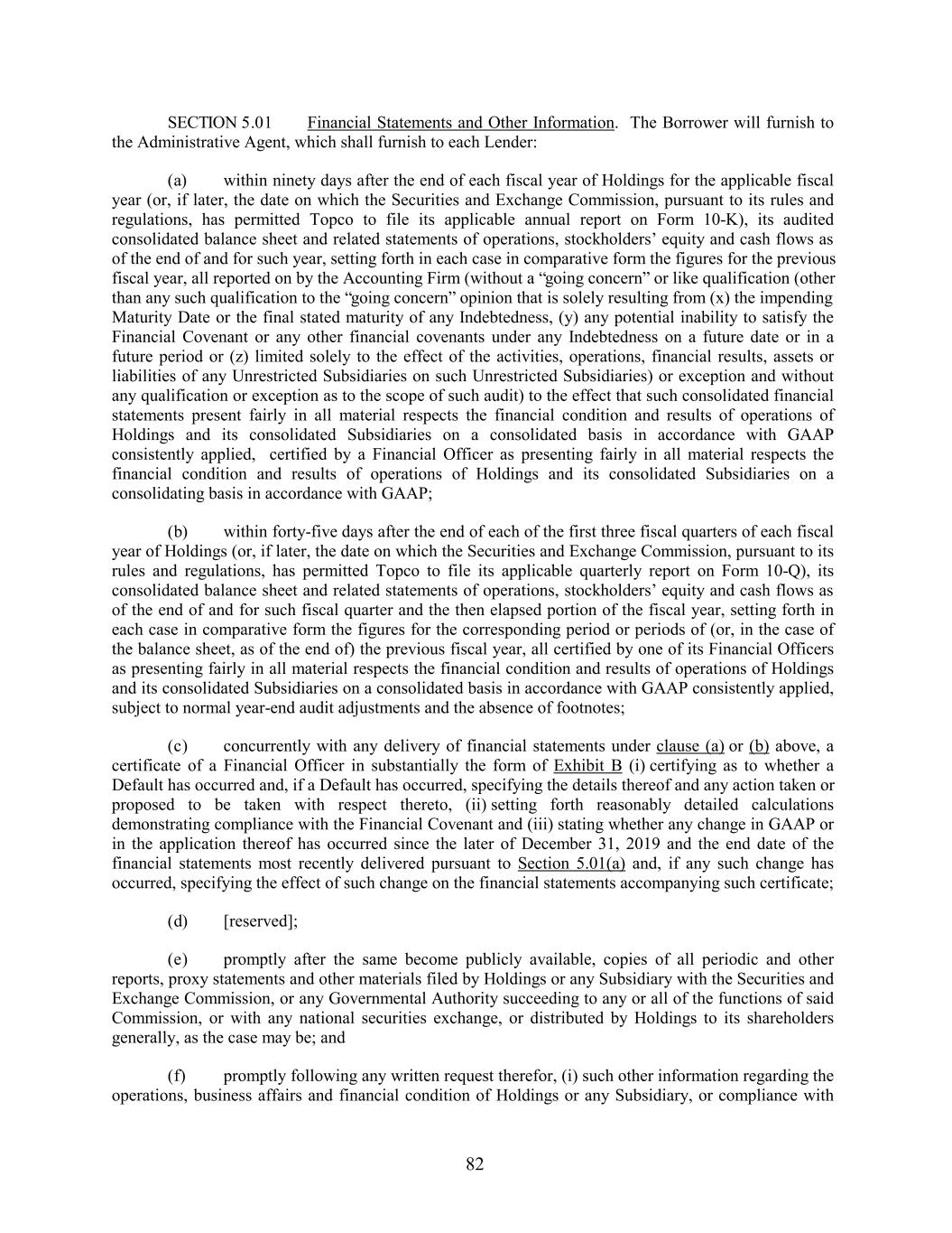 SECTION 5.01 Financial Statements and Other Information. The Borrower will furnish to the Administrative Agent, which shall furnish to each Lender: (a) within ninety days after the end of each fiscal year of Holdings for the applicable fiscal year (or, if later, the date on which the Securities and Exchange Commission, pursuant to its rules and regulations, has permitted Topco to file its applicable annual report on Form 10-K), its audited consolidated balance sheet and related statements of operations, stockholders’ equity and cash flows as of the end of and for such year, setting forth in each case in comparative form the figures for the previous fiscal year, all reported on by the Accounting Firm (without a “going concern” or like qualification (other than any such qualification to the “going concern” opinion that is solely resulting from (x) the impending Maturity Date or the final stated maturity of any Indebtedness, (y) any potential inability to satisfy the Financial Covenant or any other financial covenants under any Indebtedness on a future date or in a future period or (z) limited solely to the effect of the activities, operations, financial results, assets or liabilities of any Unrestricted Subsidiaries on such Unrestricted Subsidiaries) or exception and without any qualification or exception as to the scope of such audit) to the effect that such consolidated financial statements present fairly in all material respects the financial condition and results of operations of Holdings and its consolidated Subsidiaries on a consolidated basis in accordance with GAAP consistently applied, certified by a Financial Officer as presenting fairly in all material respects the financial condition and results of operations of Holdings and its consolidated Subsidiaries on a consolidating basis in accordance with GAAP; (b) within forty-five days after the end of each of the first three fiscal quarters of each fiscal year of Holdings (or, if later, the date on which the Securities and Exchange Commission, pursuant to its rules and regulations, has permitted Topco to file its applicable quarterly report on Form 10-Q), its consolidated balance sheet and related statements of operations, stockholders’ equity and cash flows as of the end of and for such fiscal quarter and the then elapsed portion of the fiscal year, setting forth in each case in comparative form the figures for the corresponding period or periods of (or, in the case of the balance sheet, as of the end of) the previous fiscal year, all certified by one of its Financial Officers as presenting fairly in all material respects the financial condition and results of operations of Holdings and its consolidated Subsidiaries on a consolidated basis in accordance with GAAP consistently applied, subject to normal year-end audit adjustments and the absence of footnotes; (c) concurrently with any delivery of financial statements under clause (a) or (b) above, a certificate of a Financial Officer in substantially the form of Exhibit B (i) certifying as to whether a Default has occurred and, if a Default has occurred, specifying the details thereof and any action taken or proposed to be taken with respect thereto, (ii) setting forth reasonably detailed calculations demonstrating compliance with the Financial Covenant and (iii) stating whether any change in GAAP or in the application thereof has occurred since the later of December 31, 2019 and the end date of the financial statements most recently delivered pursuant to Section 5.01(a) and, if any such change has occurred, specifying the effect of such change on the financial statements accompanying such certificate; (d) [reserved]; (e) promptly after the same become publicly available, copies of all periodic and other reports, proxy statements and other materials filed by Holdings or any Subsidiary with the Securities and Exchange Commission, or any Governmental Authority succeeding to any or all of the functions of said Commission, or with any national securities exchange, or distributed by Holdings to its shareholders generally, as the case may be; and (f) promptly following any written request therefor, (i) such other information regarding the operations, business affairs and financial condition of Holdings or any Subsidiary, or compliance with 82