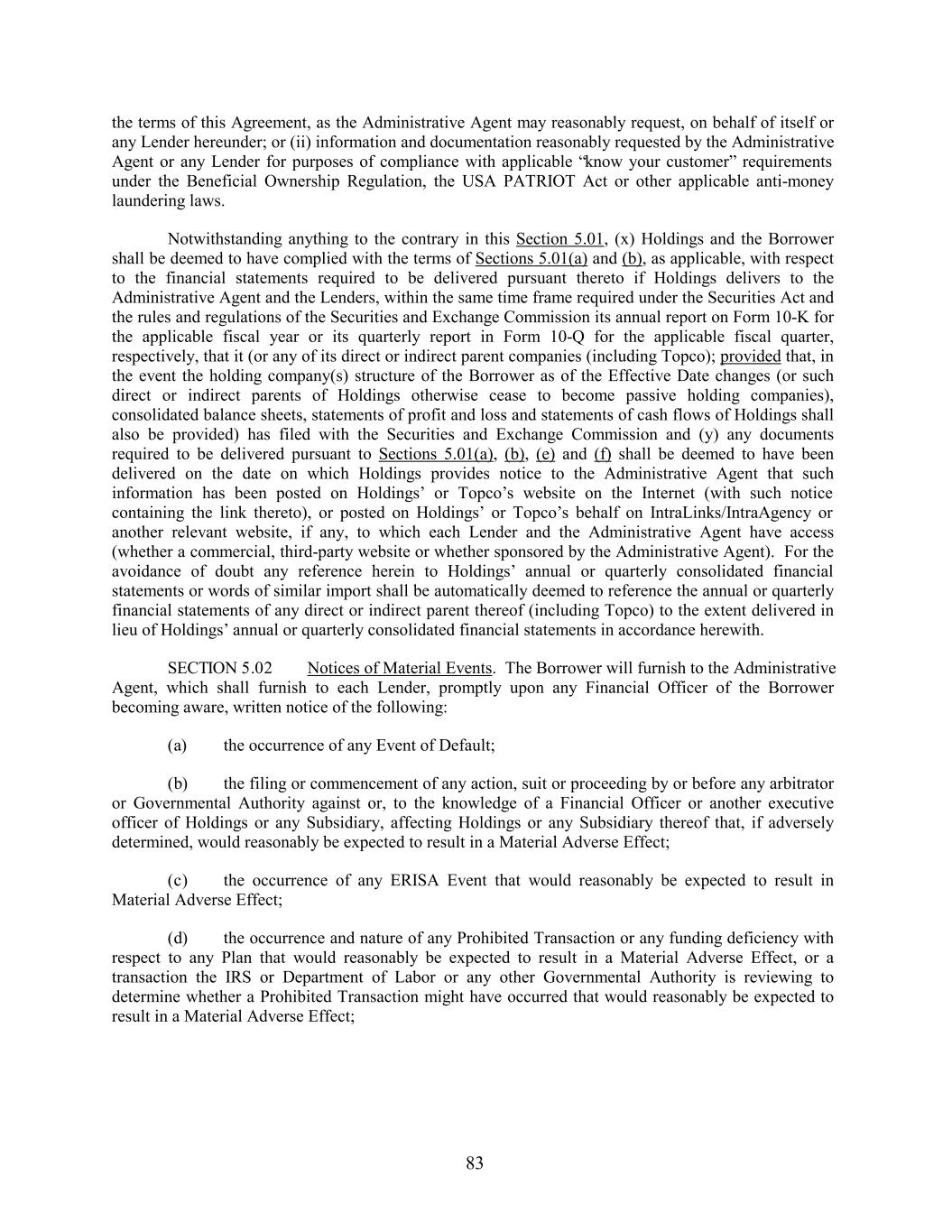 the terms of this Agreement, as the Administrative Agent may reasonably request, on behalf of itself or any Lender hereunder; or (ii) information and documentation reasonably requested by the Administrative Agent or any Lender for purposes of compliance with applicable “know your customer” requirements under the Beneficial Ownership Regulation, the USA PATRIOT Act or other applicable anti-money laundering laws. Notwithstanding anything to the contrary in this Section 5.01, (x) Holdings and the Borrower shall be deemed to have complied with the terms of Sections 5.01(a) and (b), as applicable, with respect to the financial statements required to be delivered pursuant thereto if Holdings delivers to the Administrative Agent and the Lenders, within the same time frame required under the Securities Act and the rules and regulations of the Securities and Exchange Commission its annual report on Form 10-K for the applicable fiscal year or its quarterly report in Form 10-Q for the applicable fiscal quarter, respectively, that it (or any of its direct or indirect parent companies (including Topco); provided that, in the event the holding company(s) structure of the Borrower as of the Effective Date changes (or such direct or indirect parents of Holdings otherwise cease to become passive holding companies), consolidated balance sheets, statements of profit and loss and statements of cash flows of Holdings shall also be provided) has filed with the Securities and Exchange Commission and (y) any documents required to be delivered pursuant to Sections 5.01(a), (b), (e) and (f) shall be deemed to have been delivered on the date on which Holdings provides notice to the Administrative Agent that such information has been posted on Holdings’ or Topco’s website on the Internet (with such notice containing the link thereto), or posted on Holdings’ or Topco’s behalf on IntraLinks/IntraAgency or another relevant website, if any, to which each Lender and the Administrative Agent have access (whether a commercial, third-party website or whether sponsored by the Administrative Agent). For the avoidance of doubt any reference herein to Holdings’ annual or quarterly consolidated financial statements or words of similar import shall be automatically deemed to reference the annual or quarterly financial statements of any direct or indirect parent thereof (including Topco) to the extent delivered in lieu of Holdings’ annual or quarterly consolidated financial statements in accordance herewith. SECTION 5.02 Notices of Material Events. The Borrower will furnish to the Administrative Agent, which shall furnish to each Lender, promptly upon any Financial Officer of the Borrower becoming aware, written notice of the following: (a) the occurrence of any Event of Default; (b) the filing or commencement of any action, suit or proceeding by or before any arbitrator or Governmental Authority against or, to the knowledge of a Financial Officer or another executive officer of Holdings or any Subsidiary, affecting Holdings or any Subsidiary thereof that, if adversely determined, would reasonably be expected to result in a Material Adverse Effect; (c) the occurrence of any ERISA Event that would reasonably be expected to result in Material Adverse Effect; (d) the occurrence and nature of any Prohibited Transaction or any funding deficiency with respect to any Plan that would reasonably be expected to result in a Material Adverse Effect, or a transaction the IRS or Department of Labor or any other Governmental Authority is reviewing to determine whether a Prohibited Transaction might have occurred that would reasonably be expected to result in a Material Adverse Effect; 83