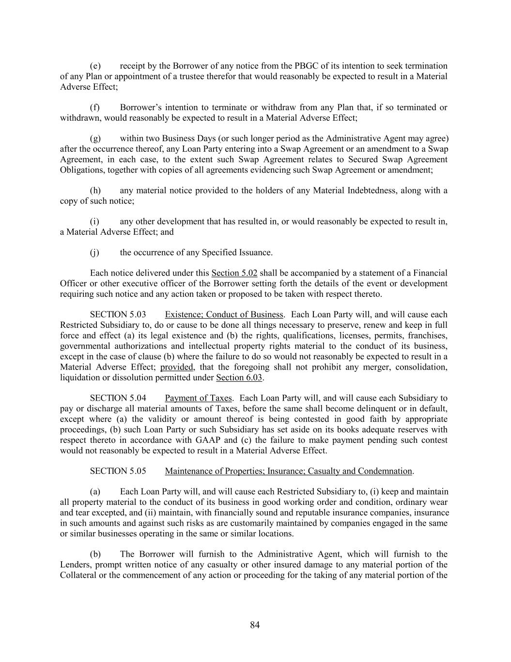 (e) receipt by the Borrower of any notice from the PBGC of its intention to seek termination of any Plan or appointment of a trustee therefor that would reasonably be expected to result in a Material Adverse Effect; (f) Borrower’s intention to terminate or withdraw from any Plan that, if so terminated or withdrawn, would reasonably be expected to result in a Material Adverse Effect; (g) within two Business Days (or such longer period as the Administrative Agent may agree) after the occurrence thereof, any Loan Party entering into a Swap Agreement or an amendment to a Swap Agreement, in each case, to the extent such Swap Agreement relates to Secured Swap Agreement Obligations, together with copies of all agreements evidencing such Swap Agreement or amendment; (h) any material notice provided to the holders of any Material Indebtedness, along with a copy of such notice; (i) any other development that has resulted in, or would reasonably be expected to result in, a Material Adverse Effect; and (j) the occurrence of any Specified Issuance. Each notice delivered under this Section 5.02 shall be accompanied by a statement of a Financial Officer or other executive officer of the Borrower setting forth the details of the event or development requiring such notice and any action taken or proposed to be taken with respect thereto. SECTION 5.03 Existence; Conduct of Business. Each Loan Party will, and will cause each Restricted Subsidiary to, do or cause to be done all things necessary to preserve, renew and keep in full force and effect (a) its legal existence and (b) the rights, qualifications, licenses, permits, franchises, governmental authorizations and intellectual property rights material to the conduct of its business, except in the case of clause (b) where the failure to do so would not reasonably be expected to result in a Material Adverse Effect; provided, that the foregoing shall not prohibit any merger, consolidation, liquidation or dissolution permitted under Section 6.03. SECTION 5.04 Payment of Taxes. Each Loan Party will, and will cause each Subsidiary to pay or discharge all material amounts of Taxes, before the same shall become delinquent or in default, except where (a) the validity or amount thereof is being contested in good faith by appropriate proceedings, (b) such Loan Party or such Subsidiary has set aside on its books adequate reserves with respect thereto in accordance with GAAP and (c) the failure to make payment pending such contest would not reasonably be expected to result in a Material Adverse Effect. SECTION 5.05 Maintenance of Properties; Insurance; Casualty and Condemnation. (a) Each Loan Party will, and will cause each Restricted Subsidiary to, (i) keep and maintain all property material to the conduct of its business in good working order and condition, ordinary wear and tear excepted, and (ii) maintain, with financially sound and reputable insurance companies, insurance in such amounts and against such risks as are customarily maintained by companies engaged in the same or similar businesses operating in the same or similar locations. (b) The Borrower will furnish to the Administrative Agent, which will furnish to the Lenders, prompt written notice of any casualty or other insured damage to any material portion of the Collateral or the commencement of any action or proceeding for the taking of any material portion of the 84