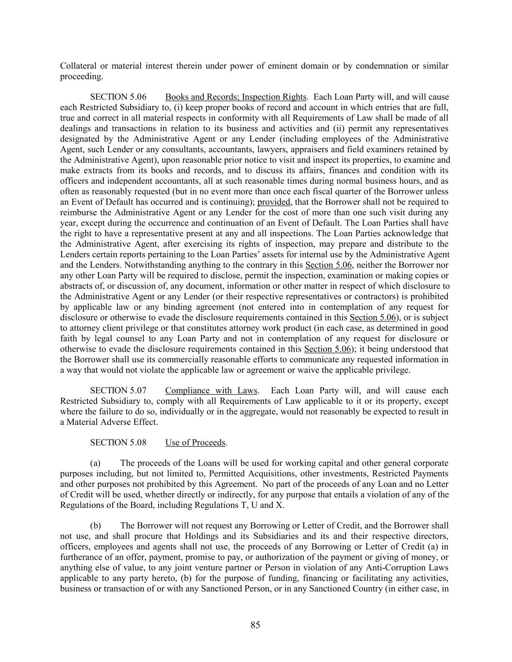 Collateral or material interest therein under power of eminent domain or by condemnation or similar proceeding. SECTION 5.06 Books and Records; Inspection Rights. Each Loan Party will, and will cause each Restricted Subsidiary to, (i) keep proper books of record and account in which entries that are full, true and correct in all material respects in conformity with all Requirements of Law shall be made of all dealings and transactions in relation to its business and activities and (ii) permit any representatives designated by the Administrative Agent or any Lender (including employees of the Administrative Agent, such Lender or any consultants, accountants, lawyers, appraisers and field examiners retained by the Administrative Agent), upon reasonable prior notice to visit and inspect its properties, to examine and make extracts from its books and records, and to discuss its affairs, finances and condition with its officers and independent accountants, all at such reasonable times during normal business hours, and as often as reasonably requested (but in no event more than once each fiscal quarter of the Borrower unless an Event of Default has occurred and is continuing); provided, that the Borrower shall not be required to reimburse the Administrative Agent or any Lender for the cost of more than one such visit during any year, except during the occurrence and continuation of an Event of Default. The Loan Parties shall have the right to have a representative present at any and all inspections. The Loan Parties acknowledge that the Administrative Agent, after exercising its rights of inspection, may prepare and distribute to the Lenders certain reports pertaining to the Loan Parties’ assets for internal use by the Administrative Agent and the Lenders. Notwithstanding anything to the contrary in this Section 5.06, neither the Borrower nor any other Loan Party will be required to disclose, permit the inspection, examination or making copies or abstracts of, or discussion of, any document, information or other matter in respect of which disclosure to the Administrative Agent or any Lender (or their respective representatives or contractors) is prohibited by applicable law or any binding agreement (not entered into in contemplation of any request for disclosure or otherwise to evade the disclosure requirements contained in this Section 5.06), or is subject to attorney client privilege or that constitutes attorney work product (in each case, as determined in good faith by legal counsel to any Loan Party and not in contemplation of any request for disclosure or otherwise to evade the disclosure requirements contained in this Section 5.06); it being understood that the Borrower shall use its commercially reasonable efforts to communicate any requested information in a way that would not violate the applicable law or agreement or waive the applicable privilege. SECTION 5.07 Compliance with Laws. Each Loan Party will, and will cause each Restricted Subsidiary to, comply with all Requirements of Law applicable to it or its property, except where the failure to do so, individually or in the aggregate, would not reasonably be expected to result in a Material Adverse Effect. SECTION 5.08 Use of Proceeds. (a) The proceeds of the Loans will be used for working capital and other general corporate purposes including, but not limited to, Permitted Acquisitions, other investments, Restricted Payments and other purposes not prohibited by this Agreement. No part of the proceeds of any Loan and no Letter of Credit will be used, whether directly or indirectly, for any purpose that entails a violation of any of the Regulations of the Board, including Regulations T, U and X. (b) The Borrower will not request any Borrowing or Letter of Credit, and the Borrower shall not use, and shall procure that Holdings and its Subsidiaries and its and their respective directors, officers, employees and agents shall not use, the proceeds of any Borrowing or Letter of Credit (a) in furtherance of an offer, payment, promise to pay, or authorization of the payment or giving of money, or anything else of value, to any joint venture partner or Person in violation of any Anti-Corruption Laws applicable to any party hereto, (b) for the purpose of funding, financing or facilitating any activities, business or transaction of or with any Sanctioned Person, or in any Sanctioned Country (in either case, in 85