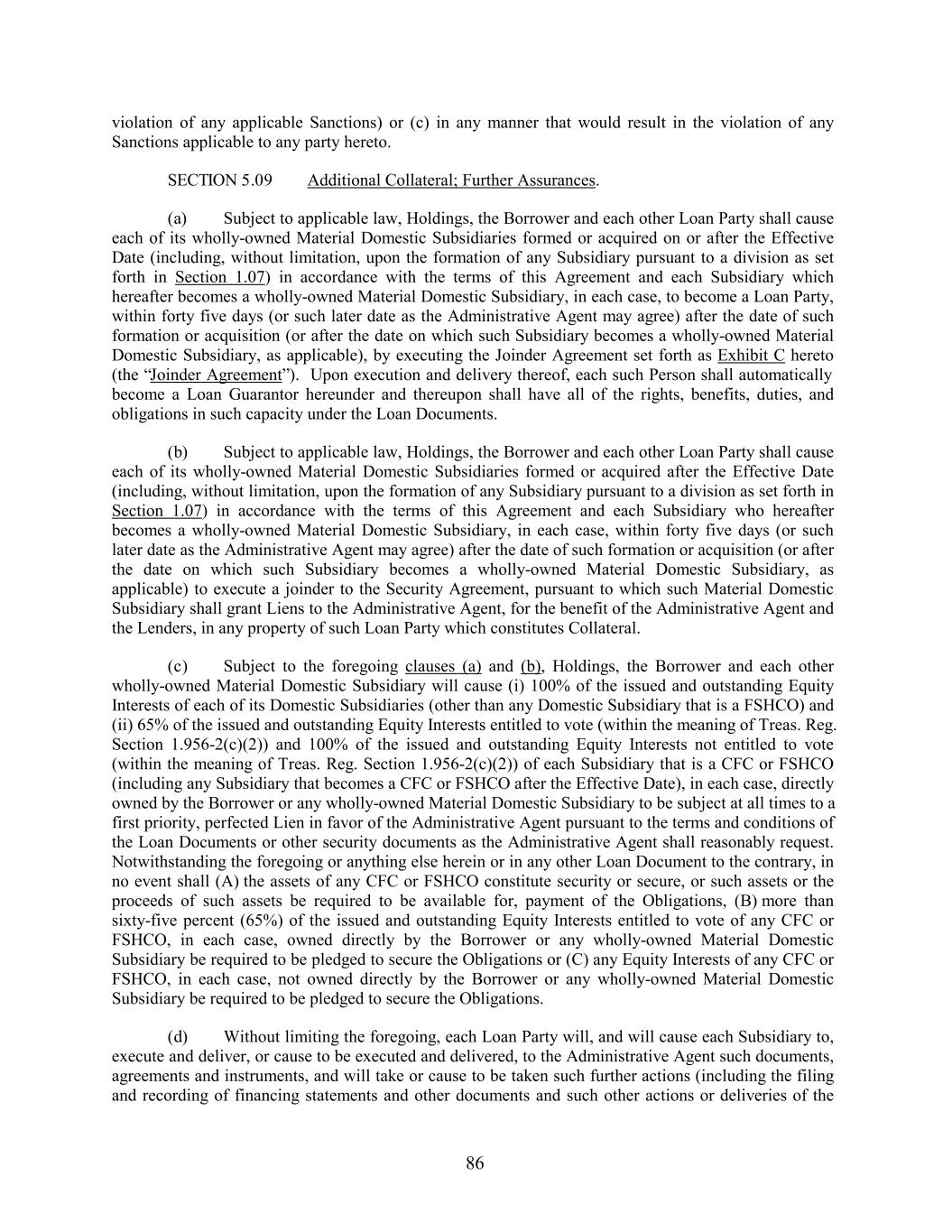 violation of any applicable Sanctions) or (c) in any manner that would result in the violation of any Sanctions applicable to any party hereto. SECTION 5.09 Additional Collateral; Further Assurances. (a) Subject to applicable law, Holdings, the Borrower and each other Loan Party shall cause each of its wholly-owned Material Domestic Subsidiaries formed or acquired on or after the Effective Date (including, without limitation, upon the formation of any Subsidiary pursuant to a division as set forth in Section 1.07) in accordance with the terms of this Agreement and each Subsidiary which hereafter becomes a wholly-owned Material Domestic Subsidiary, in each case, to become a Loan Party, within forty five days (or such later date as the Administrative Agent may agree) after the date of such formation or acquisition (or after the date on which such Subsidiary becomes a wholly-owned Material Domestic Subsidiary, as applicable), by executing the Joinder Agreement set forth as Exhibit C hereto (the “Joinder Agreement”). Upon execution and delivery thereof, each such Person shall automatically become a Loan Guarantor hereunder and thereupon shall have all of the rights, benefits, duties, and obligations in such capacity under the Loan Documents. (b) Subject to applicable law, Holdings, the Borrower and each other Loan Party shall cause each of its wholly-owned Material Domestic Subsidiaries formed or acquired after the Effective Date (including, without limitation, upon the formation of any Subsidiary pursuant to a division as set forth in Section 1.07) in accordance with the terms of this Agreement and each Subsidiary who hereafter becomes a wholly-owned Material Domestic Subsidiary, in each case, within forty five days (or such later date as the Administrative Agent may agree) after the date of such formation or acquisition (or after the date on which such Subsidiary becomes a wholly-owned Material Domestic Subsidiary, as applicable) to execute a joinder to the Security Agreement, pursuant to which such Material Domestic Subsidiary shall grant Liens to the Administrative Agent, for the benefit of the Administrative Agent and the Lenders, in any property of such Loan Party which constitutes Collateral. (c) Subject to the foregoing clauses (a) and (b), Holdings, the Borrower and each other wholly-owned Material Domestic Subsidiary will cause (i) 100% of the issued and outstanding Equity Interests of each of its Domestic Subsidiaries (other than any Domestic Subsidiary that is a FSHCO) and (ii) 65% of the issued and outstanding Equity Interests entitled to vote (within the meaning of Treas. Reg. Section 1.956-2(c)(2)) and 100% of the issued and outstanding Equity Interests not entitled to vote (within the meaning of Treas. Reg. Section 1.956-2(c)(2)) of each Subsidiary that is a CFC or FSHCO (including any Subsidiary that becomes a CFC or FSHCO after the Effective Date), in each case, directly owned by the Borrower or any wholly-owned Material Domestic Subsidiary to be subject at all times to a first priority, perfected Lien in favor of the Administrative Agent pursuant to the terms and conditions of the Loan Documents or other security documents as the Administrative Agent shall reasonably request. Notwithstanding the foregoing or anything else herein or in any other Loan Document to the contrary, in no event shall (A) the assets of any CFC or FSHCO constitute security or secure, or such assets or the proceeds of such assets be required to be available for, payment of the Obligations, (B) more than sixty-five percent (65%) of the issued and outstanding Equity Interests entitled to vote of any CFC or FSHCO, in each case, owned directly by the Borrower or any wholly-owned Material Domestic Subsidiary be required to be pledged to secure the Obligations or (C) any Equity Interests of any CFC or FSHCO, in each case, not owned directly by the Borrower or any wholly-owned Material Domestic Subsidiary be required to be pledged to secure the Obligations. (d) Without limiting the foregoing, each Loan Party will, and will cause each Subsidiary to, execute and deliver, or cause to be executed and delivered, to the Administrative Agent such documents, agreements and instruments, and will take or cause to be taken such further actions (including the filing and recording of financing statements and other documents and such other actions or deliveries of the 86