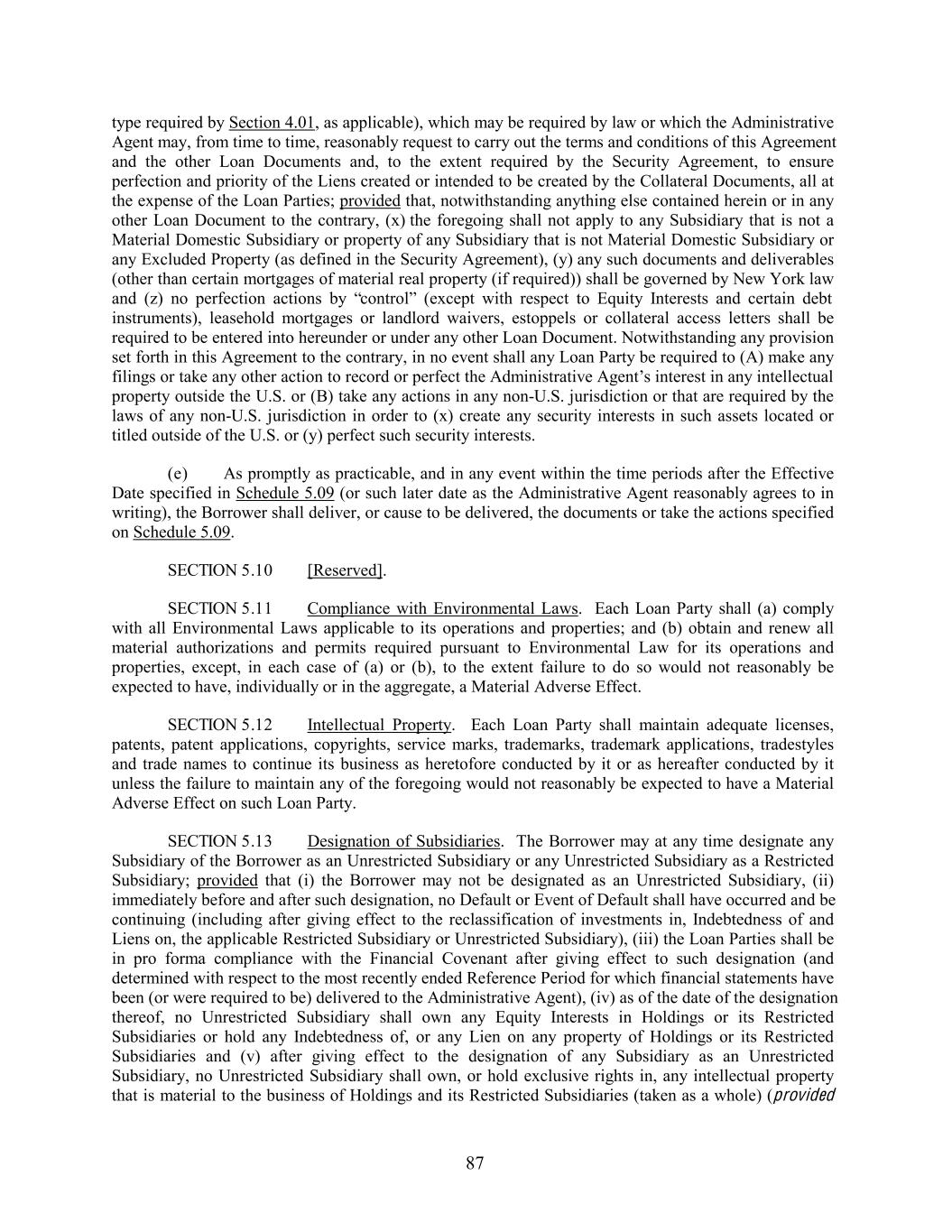 type required by Section 4.01, as applicable), which may be required by law or which the Administrative Agent may, from time to time, reasonably request to carry out the terms and conditions of this Agreement and the other Loan Documents and, to the extent required by the Security Agreement, to ensure perfection and priority of the Liens created or intended to be created by the Collateral Documents, all at the expense of the Loan Parties; provided that, notwithstanding anything else contained herein or in any other Loan Document to the contrary, (x) the foregoing shall not apply to any Subsidiary that is not a Material Domestic Subsidiary or property of any Subsidiary that is not Material Domestic Subsidiary or any Excluded Property (as defined in the Security Agreement), (y) any such documents and deliverables (other than certain mortgages of material real property (if required)) shall be governed by New York law and (z) no perfection actions by “control” (except with respect to Equity Interests and certain debt instruments), leasehold mortgages or landlord waivers, estoppels or collateral access letters shall be required to be entered into hereunder or under any other Loan Document. Notwithstanding any provision set forth in this Agreement to the contrary, in no event shall any Loan Party be required to (A) make any filings or take any other action to record or perfect the Administrative Agent’s interest in any intellectual property outside the U.S. or (B) take any actions in any non-U.S. jurisdiction or that are required by the laws of any non-U.S. jurisdiction in order to (x) create any security interests in such assets located or titled outside of the U.S. or (y) perfect such security interests. (e) As promptly as practicable, and in any event within the time periods after the Effective Date specified in Schedule 5.09 (or such later date as the Administrative Agent reasonably agrees to in writing), the Borrower shall deliver, or cause to be delivered, the documents or take the actions specified on Schedule 5.09. SECTION 5.10 [Reserved]. SECTION 5.11 Compliance with Environmental Laws. Each Loan Party shall (a) comply with all Environmental Laws applicable to its operations and properties; and (b) obtain and renew all material authorizations and permits required pursuant to Environmental Law for its operations and properties, except, in each case of (a) or (b), to the extent failure to do so would not reasonably be expected to have, individually or in the aggregate, a Material Adverse Effect. SECTION 5.12 Intellectual Property. Each Loan Party shall maintain adequate licenses, patents, patent applications, copyrights, service marks, trademarks, trademark applications, tradestyles and trade names to continue its business as heretofore conducted by it or as hereafter conducted by it unless the failure to maintain any of the foregoing would not reasonably be expected to have a Material Adverse Effect on such Loan Party. SECTION 5.13 Designation of Subsidiaries. The Borrower may at any time designate any Subsidiary of the Borrower as an Unrestricted Subsidiary or any Unrestricted Subsidiary as a Restricted Subsidiary; provided that (i) the Borrower may not be designated as an Unrestricted Subsidiary, (ii) immediately before and after such designation, no Default or Event of Default shall have occurred and be continuing (including after giving effect to the reclassification of investments in, Indebtedness of and Liens on, the applicable Restricted Subsidiary or Unrestricted Subsidiary), (iii) the Loan Parties shall be in pro forma compliance with the Financial Covenant after giving effect to such designation (and determined with respect to the most recently ended Reference Period for which financial statements have been (or were required to be) delivered to the Administrative Agent), (iv) as of the date of the designation thereof, no Unrestricted Subsidiary shall own any Equity Interests in Holdings or its Restricted Subsidiaries or hold any Indebtedness of, or any Lien on any property of Holdings or its Restricted Subsidiaries and (v) after giving effect to the designation of any Subsidiary as an Unrestricted Subsidiary, no Unrestricted Subsidiary shall own, or hold exclusive rights in, any intellectual property that is material to the business of Holdings and its Restricted Subsidiaries (taken as a whole) (provided 87