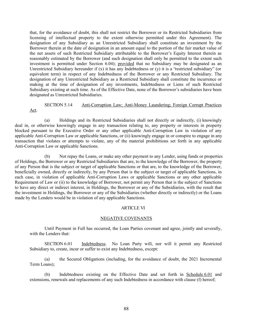 that, for the avoidance of doubt, this shall not restrict the Borrower or its Restricted Subsidiaries from licensing of intellectual property to the extent otherwise permitted under this Agreement). The designation of any Subsidiary as an Unrestricted Subsidiary shall constitute an investment by the Borrower therein at the date of designation in an amount equal to the portion of the fair market value of the net assets of such Restricted Subsidiary attributable to the Borrower’s Equity Interest therein as reasonably estimated by the Borrower (and such designation shall only be permitted to the extent such investment is permitted under Section 6.04); provided that no Subsidiary may be designated as an Unrestricted Subsidiary hereunder if (x) it has any Indebtedness or (y) it is a “restricted subsidiary” (or equivalent term) in respect of any Indebtedness of the Borrower or any Restricted Subsidiary. The designation of any Unrestricted Subsidiary as a Restricted Subsidiary shall constitute the incurrence or making at the time of designation of any investments, Indebtedness or Liens of such Restricted Subsidiary existing at such time. As of the Effective Date, none of the Borrower’s subsidiaries have been designated as Unrestricted Subsidiaries. SECTION 5.14 Anti-Corruption Law; Anti-Money Laundering; Foreign Corrupt Practices Act. (a) Holdings and its Restricted Subsidiaries shall not directly or indirectly, (i) knowingly deal in, or otherwise knowingly engage in any transaction relating to, any property or interests in property blocked pursuant to the Executive Order or any other applicable Anti-Corruption Law in violation of any applicable Anti-Corruption Law or applicable Sanctions, or (ii) knowingly engage in or conspire to engage in any transaction that violates or attempts to violate, any of the material prohibitions set forth in any applicable Anti-Corruption Law or applicable Sanctions. (b) Not repay the Loans, or make any other payment to any Lender, using funds or properties of Holdings, the Borrower or any Restricted Subsidiaries that are, to the knowledge of the Borrower, the property of any Person that is the subject or target of applicable Sanctions or that are, to the knowledge of the Borrower, beneficially owned, directly or indirectly, by any Person that is the subject or target of applicable Sanctions, in each case, in violation of applicable Anti-Corruption Laws or applicable Sanctions or any other applicable Requirement of Law or (ii) to the knowledge of Borrower, not permit any Person that is the subject of Sanctions to have any direct or indirect interest, in Holdings, the Borrower or any of the Subsidiaries, with the result that the investment in Holdings, the Borrower or any of the Subsidiaries (whether directly or indirectly) or the Loans made by the Lenders would be in violation of any applicable Sanctions. ARTICLE VI NEGATIVE COVENANTS Until Payment in Full has occurred, the Loan Parties covenant and agree, jointly and severally, with the Lenders that: SECTION 6.01 Indebtedness. No Loan Party will, nor will it permit any Restricted Subsidiary to, create, incur or suffer to exist any Indebtedness, except: (a) the Secured Obligations (including, for the avoidance of doubt, the 2021 Incremental Term Loans); (b) Indebtedness existing on the Effective Date and set forth in Schedule 6.01 and extensions, renewals and replacements of any such Indebtedness in accordance with clause (f) hereof; 88