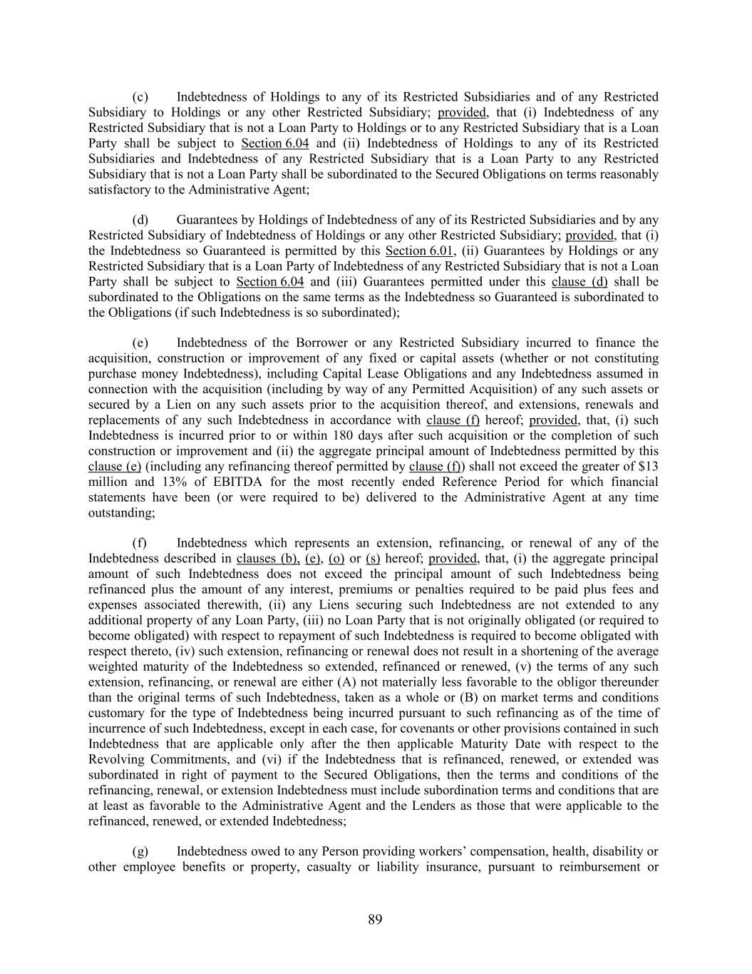 (c) Indebtedness of Holdings to any of its Restricted Subsidiaries and of any Restricted Subsidiary to Holdings or any other Restricted Subsidiary; provided, that (i) Indebtedness of any Restricted Subsidiary that is not a Loan Party to Holdings or to any Restricted Subsidiary that is a Loan Party shall be subject to Section 6.04 and (ii) Indebtedness of Holdings to any of its Restricted Subsidiaries and Indebtedness of any Restricted Subsidiary that is a Loan Party to any Restricted Subsidiary that is not a Loan Party shall be subordinated to the Secured Obligations on terms reasonably satisfactory to the Administrative Agent; (d) Guarantees by Holdings of Indebtedness of any of its Restricted Subsidiaries and by any Restricted Subsidiary of Indebtedness of Holdings or any other Restricted Subsidiary; provided, that (i) the Indebtedness so Guaranteed is permitted by this Section 6.01, (ii) Guarantees by Holdings or any Restricted Subsidiary that is a Loan Party of Indebtedness of any Restricted Subsidiary that is not a Loan Party shall be subject to Section 6.04 and (iii) Guarantees permitted under this clause (d) shall be subordinated to the Obligations on the same terms as the Indebtedness so Guaranteed is subordinated to the Obligations (if such Indebtedness is so subordinated); (e) Indebtedness of the Borrower or any Restricted Subsidiary incurred to finance the acquisition, construction or improvement of any fixed or capital assets (whether or not constituting purchase money Indebtedness), including Capital Lease Obligations and any Indebtedness assumed in connection with the acquisition (including by way of any Permitted Acquisition) of any such assets or secured by a Lien on any such assets prior to the acquisition thereof, and extensions, renewals and replacements of any such Indebtedness in accordance with clause (f) hereof; provided, that, (i) such Indebtedness is incurred prior to or within 180 days after such acquisition or the completion of such construction or improvement and (ii) the aggregate principal amount of Indebtedness permitted by this clause (e) (including any refinancing thereof permitted by clause (f)) shall not exceed the greater of $13 million and 13% of EBITDA for the most recently ended Reference Period for which financial statements have been (or were required to be) delivered to the Administrative Agent at any time outstanding; (f) Indebtedness which represents an extension, refinancing, or renewal of any of the Indebtedness described in clauses (b), (e), (o) or (s) hereof; provided, that, (i) the aggregate principal amount of such Indebtedness does not exceed the principal amount of such Indebtedness being refinanced plus the amount of any interest, premiums or penalties required to be paid plus fees and expenses associated therewith, (ii) any Liens securing such Indebtedness are not extended to any additional property of any Loan Party, (iii) no Loan Party that is not originally obligated (or required to become obligated) with respect to repayment of such Indebtedness is required to become obligated with respect thereto, (iv) such extension, refinancing or renewal does not result in a shortening of the average weighted maturity of the Indebtedness so extended, refinanced or renewed, (v) the terms of any such extension, refinancing, or renewal are either (A) not materially less favorable to the obligor thereunder than the original terms of such Indebtedness, taken as a whole or (B) on market terms and conditions customary for the type of Indebtedness being incurred pursuant to such refinancing as of the time of incurrence of such Indebtedness, except in each case, for covenants or other provisions contained in such Indebtedness that are applicable only after the then applicable Maturity Date with respect to the Revolving Commitments, and (vi) if the Indebtedness that is refinanced, renewed, or extended was subordinated in right of payment to the Secured Obligations, then the terms and conditions of the refinancing, renewal, or extension Indebtedness must include subordination terms and conditions that are at least as favorable to the Administrative Agent and the Lenders as those that were applicable to the refinanced, renewed, or extended Indebtedness; (g) Indebtedness owed to any Person providing workers’ compensation, health, disability or other employee benefits or property, casualty or liability insurance, pursuant to reimbursement or 89