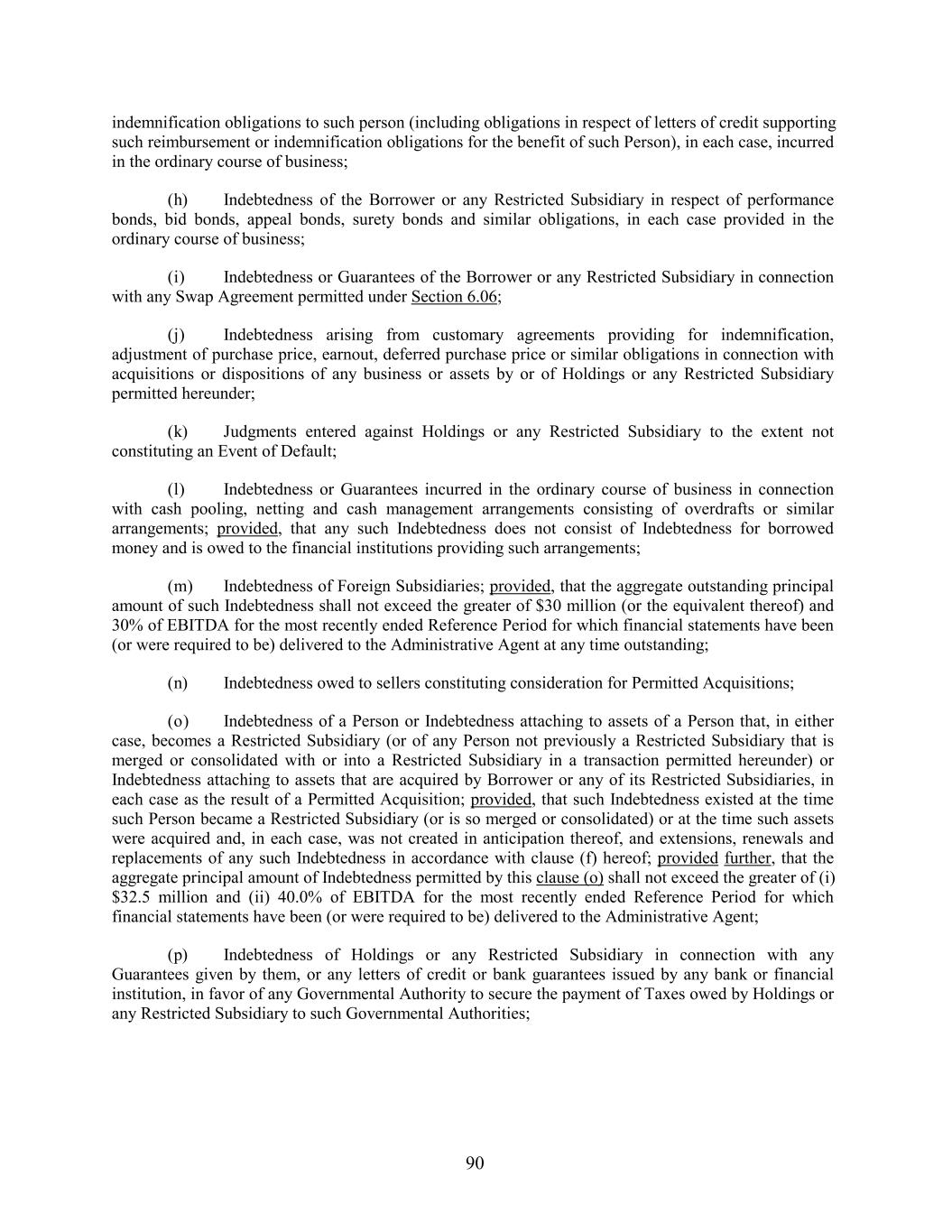 indemnification obligations to such person (including obligations in respect of letters of credit supporting such reimbursement or indemnification obligations for the benefit of such Person), in each case, incurred in the ordinary course of business; (h) Indebtedness of the Borrower or any Restricted Subsidiary in respect of performance bonds, bid bonds, appeal bonds, surety bonds and similar obligations, in each case provided in the ordinary course of business; (i) Indebtedness or Guarantees of the Borrower or any Restricted Subsidiary in connection with any Swap Agreement permitted under Section 6.06; (j) Indebtedness arising from customary agreements providing for indemnification, adjustment of purchase price, earnout, deferred purchase price or similar obligations in connection with acquisitions or dispositions of any business or assets by or of Holdings or any Restricted Subsidiary permitted hereunder; (k) Judgments entered against Holdings or any Restricted Subsidiary to the extent not constituting an Event of Default; (l) Indebtedness or Guarantees incurred in the ordinary course of business in connection with cash pooling, netting and cash management arrangements consisting of overdrafts or similar arrangements; provided, that any such Indebtedness does not consist of Indebtedness for borrowed money and is owed to the financial institutions providing such arrangements; (m) Indebtedness of Foreign Subsidiaries; provided, that the aggregate outstanding principal amount of such Indebtedness shall not exceed the greater of $30 million (or the equivalent thereof) and 30% of EBITDA for the most recently ended Reference Period for which financial statements have been (or were required to be) delivered to the Administrative Agent at any time outstanding; (n) Indebtedness owed to sellers constituting consideration for Permitted Acquisitions; (o) Indebtedness of a Person or Indebtedness attaching to assets of a Person that, in either case, becomes a Restricted Subsidiary (or of any Person not previously a Restricted Subsidiary that is merged or consolidated with or into a Restricted Subsidiary in a transaction permitted hereunder) or Indebtedness attaching to assets that are acquired by Borrower or any of its Restricted Subsidiaries, in each case as the result of a Permitted Acquisition; provided, that such Indebtedness existed at the time such Person became a Restricted Subsidiary (or is so merged or consolidated) or at the time such assets were acquired and, in each case, was not created in anticipation thereof, and extensions, renewals and replacements of any such Indebtedness in accordance with clause (f) hereof; provided further, that the aggregate principal amount of Indebtedness permitted by this clause (o) shall not exceed the greater of (i) $32.5 million and (ii) 40.0% of EBITDA for the most recently ended Reference Period for which financial statements have been (or were required to be) delivered to the Administrative Agent; (p) Indebtedness of Holdings or any Restricted Subsidiary in connection with any Guarantees given by them, or any letters of credit or bank guarantees issued by any bank or financial institution, in favor of any Governmental Authority to secure the payment of Taxes owed by Holdings or any Restricted Subsidiary to such Governmental Authorities; 90