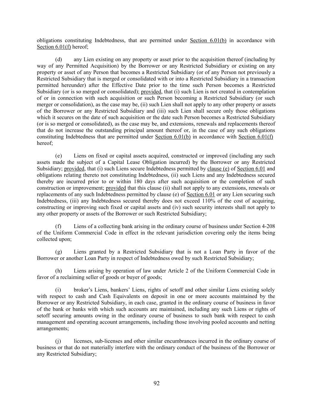 obligations constituting Indebtedness, that are permitted under Section 6.01(b) in accordance with Section 6.01(f) hereof; (d) any Lien existing on any property or asset prior to the acquisition thereof (including by way of any Permitted Acquisition) by the Borrower or any Restricted Subsidiary or existing on any property or asset of any Person that becomes a Restricted Subsidiary (or of any Person not previously a Restricted Subsidiary that is merged or consolidated with or into a Restricted Subsidiary in a transaction permitted hereunder) after the Effective Date prior to the time such Person becomes a Restricted Subsidiary (or is so merged or consolidated); provided, that (i) such Lien is not created in contemplation of or in connection with such acquisition or such Person becoming a Restricted Subsidiary (or such merger or consolidation), as the case may be, (ii) such Lien shall not apply to any other property or assets of the Borrower or any Restricted Subsidiary and (iii) such Lien shall secure only those obligations which it secures on the date of such acquisition or the date such Person becomes a Restricted Subsidiary (or is so merged or consolidated), as the case may be, and extensions, renewals and replacements thereof that do not increase the outstanding principal amount thereof or, in the case of any such obligations constituting Indebtedness that are permitted under Section 6.01(b) in accordance with Section 6.01(f) hereof; (e) Liens on fixed or capital assets acquired, constructed or improved (including any such assets made the subject of a Capital Lease Obligation incurred) by the Borrower or any Restricted Subsidiary; provided, that (i) such Liens secure Indebtedness permitted by clause (e) of Section 6.01 and obligations relating thereto not constituting Indebtedness, (ii) such Liens and any Indebtedness secured thereby are incurred prior to or within 180 days after such acquisition or the completion of such construction or improvement; provided that this clause (ii) shall not apply to any extensions, renewals or replacements of any such Indebtedness permitted by clause (e) of Section 6.01 or any Lien securing such Indebtedness, (iii) any Indebtedness secured thereby does not exceed 110% of the cost of acquiring, constructing or improving such fixed or capital assets and (iv) such security interests shall not apply to any other property or assets of the Borrower or such Restricted Subsidiary; (f) Liens of a collecting bank arising in the ordinary course of business under Section 4-208 of the Uniform Commercial Code in effect in the relevant jurisdiction covering only the items being collected upon; (g) Liens granted by a Restricted Subsidiary that is not a Loan Party in favor of the Borrower or another Loan Party in respect of Indebtedness owed by such Restricted Subsidiary; (h) Liens arising by operation of law under Article 2 of the Uniform Commercial Code in favor of a reclaiming seller of goods or buyer of goods; (i) broker’s Liens, bankers’ Liens, rights of setoff and other similar Liens existing solely with respect to cash and Cash Equivalents on deposit in one or more accounts maintained by the Borrower or any Restricted Subsidiary, in each case, granted in the ordinary course of business in favor of the bank or banks with which such accounts are maintained, including any such Liens or rights of setoff securing amounts owing in the ordinary course of business to such bank with respect to cash management and operating account arrangements, including those involving pooled accounts and netting arrangements; (j) licenses, sub-licenses and other similar encumbrances incurred in the ordinary course of business or that do not materially interfere with the ordinary conduct of the business of the Borrower or any Restricted Subsidiary; 92