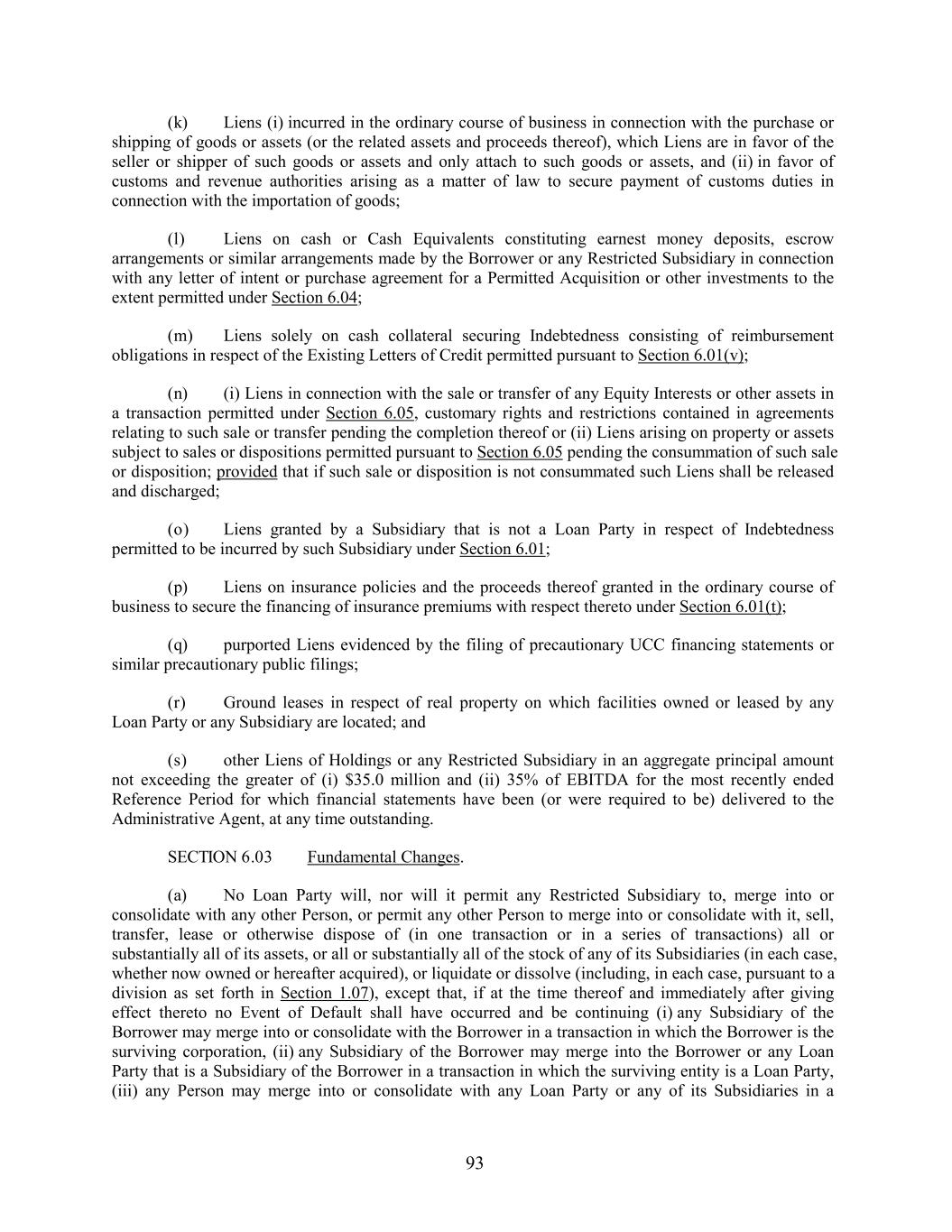 (k) Liens (i) incurred in the ordinary course of business in connection with the purchase or shipping of goods or assets (or the related assets and proceeds thereof), which Liens are in favor of the seller or shipper of such goods or assets and only attach to such goods or assets, and (ii) in favor of customs and revenue authorities arising as a matter of law to secure payment of customs duties in connection with the importation of goods; (l) Liens on cash or Cash Equivalents constituting earnest money deposits, escrow arrangements or similar arrangements made by the Borrower or any Restricted Subsidiary in connection with any letter of intent or purchase agreement for a Permitted Acquisition or other investments to the extent permitted under Section 6.04; (m) Liens solely on cash collateral securing Indebtedness consisting of reimbursement obligations in respect of the Existing Letters of Credit permitted pursuant to Section 6.01(v); (n) (i) Liens in connection with the sale or transfer of any Equity Interests or other assets in a transaction permitted under Section 6.05, customary rights and restrictions contained in agreements relating to such sale or transfer pending the completion thereof or (ii) Liens arising on property or assets subject to sales or dispositions permitted pursuant to Section 6.05 pending the consummation of such sale or disposition; provided that if such sale or disposition is not consummated such Liens shall be released and discharged; (o) Liens granted by a Subsidiary that is not a Loan Party in respect of Indebtedness permitted to be incurred by such Subsidiary under Section 6.01; (p) Liens on insurance policies and the proceeds thereof granted in the ordinary course of business to secure the financing of insurance premiums with respect thereto under Section 6.01(t); (q) purported Liens evidenced by the filing of precautionary UCC financing statements or similar precautionary public filings; (r) Ground leases in respect of real property on which facilities owned or leased by any Loan Party or any Subsidiary are located; and (s) other Liens of Holdings or any Restricted Subsidiary in an aggregate principal amount not exceeding the greater of (i) $35.0 million and (ii) 35% of EBITDA for the most recently ended Reference Period for which financial statements have been (or were required to be) delivered to the Administrative Agent, at any time outstanding. SECTION 6.03 Fundamental Changes. (a) No Loan Party will, nor will it permit any Restricted Subsidiary to, merge into or consolidate with any other Person, or permit any other Person to merge into or consolidate with it, sell, transfer, lease or otherwise dispose of (in one transaction or in a series of transactions) all or substantially all of its assets, or all or substantially all of the stock of any of its Subsidiaries (in each case, whether now owned or hereafter acquired), or liquidate or dissolve (including, in each case, pursuant to a division as set forth in Section 1.07), except that, if at the time thereof and immediately after giving effect thereto no Event of Default shall have occurred and be continuing (i) any Subsidiary of the Borrower may merge into or consolidate with the Borrower in a transaction in which the Borrower is the surviving corporation, (ii) any Subsidiary of the Borrower may merge into the Borrower or any Loan Party that is a Subsidiary of the Borrower in a transaction in which the surviving entity is a Loan Party, (iii) any Person may merge into or consolidate with any Loan Party or any of its Subsidiaries in a 93