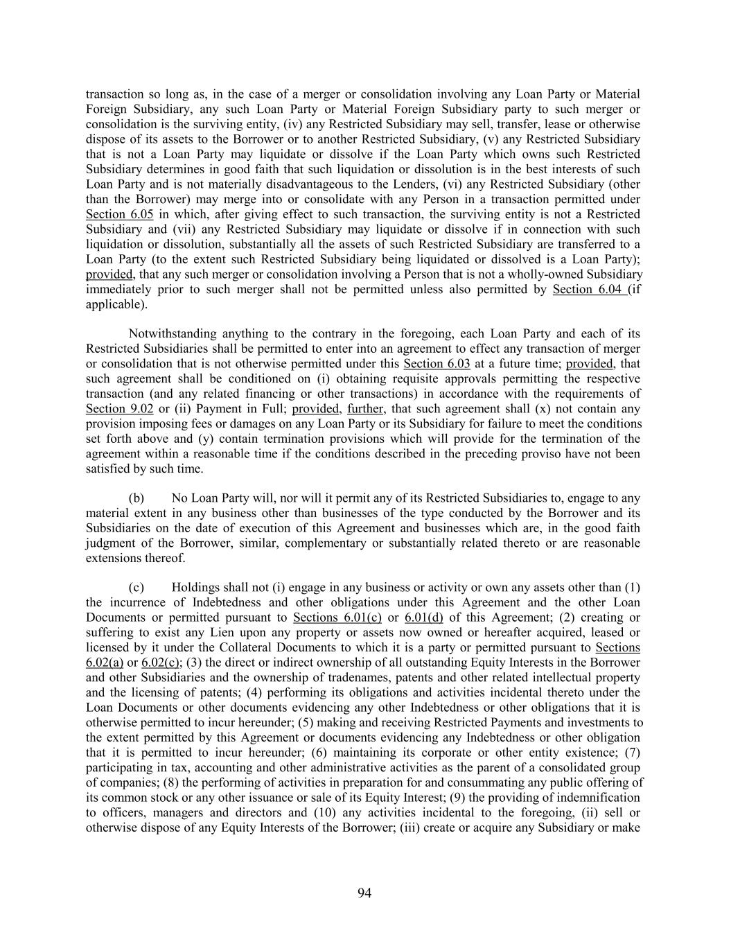 transaction so long as, in the case of a merger or consolidation involving any Loan Party or Material Foreign Subsidiary, any such Loan Party or Material Foreign Subsidiary party to such merger or consolidation is the surviving entity, (iv) any Restricted Subsidiary may sell, transfer, lease or otherwise dispose of its assets to the Borrower or to another Restricted Subsidiary, (v) any Restricted Subsidiary that is not a Loan Party may liquidate or dissolve if the Loan Party which owns such Restricted Subsidiary determines in good faith that such liquidation or dissolution is in the best interests of such Loan Party and is not materially disadvantageous to the Lenders, (vi) any Restricted Subsidiary (other than the Borrower) may merge into or consolidate with any Person in a transaction permitted under Section 6.05 in which, after giving effect to such transaction, the surviving entity is not a Restricted Subsidiary and (vii) any Restricted Subsidiary may liquidate or dissolve if in connection with such liquidation or dissolution, substantially all the assets of such Restricted Subsidiary are transferred to a Loan Party (to the extent such Restricted Subsidiary being liquidated or dissolved is a Loan Party); provided, that any such merger or consolidation involving a Person that is not a wholly-owned Subsidiary immediately prior to such merger shall not be permitted unless also permitted by Section 6.04 (if applicable). Notwithstanding anything to the contrary in the foregoing, each Loan Party and each of its Restricted Subsidiaries shall be permitted to enter into an agreement to effect any transaction of merger or consolidation that is not otherwise permitted under this Section 6.03 at a future time; provided, that such agreement shall be conditioned on (i) obtaining requisite approvals permitting the respective transaction (and any related financing or other transactions) in accordance with the requirements of Section 9.02 or (ii) Payment in Full; provided, further, that such agreement shall (x) not contain any provision imposing fees or damages on any Loan Party or its Subsidiary for failure to meet the conditions set forth above and (y) contain termination provisions which will provide for the termination of the agreement within a reasonable time if the conditions described in the preceding proviso have not been satisfied by such time. (b) No Loan Party will, nor will it permit any of its Restricted Subsidiaries to, engage to any material extent in any business other than businesses of the type conducted by the Borrower and its Subsidiaries on the date of execution of this Agreement and businesses which are, in the good faith judgment of the Borrower, similar, complementary or substantially related thereto or are reasonable extensions thereof. (c) Holdings shall not (i) engage in any business or activity or own any assets other than (1) the incurrence of Indebtedness and other obligations under this Agreement and the other Loan Documents or permitted pursuant to Sections 6.01(c) or 6.01(d) of this Agreement; (2) creating or suffering to exist any Lien upon any property or assets now owned or hereafter acquired, leased or licensed by it under the Collateral Documents to which it is a party or permitted pursuant to Sections 6.02(a) or 6.02(c); (3) the direct or indirect ownership of all outstanding Equity Interests in the Borrower and other Subsidiaries and the ownership of tradenames, patents and other related intellectual property and the licensing of patents; (4) performing its obligations and activities incidental thereto under the Loan Documents or other documents evidencing any other Indebtedness or other obligations that it is otherwise permitted to incur hereunder; (5) making and receiving Restricted Payments and investments to the extent permitted by this Agreement or documents evidencing any Indebtedness or other obligation that it is permitted to incur hereunder; (6) maintaining its corporate or other entity existence; (7) participating in tax, accounting and other administrative activities as the parent of a consolidated group of companies; (8) the performing of activities in preparation for and consummating any public offering of its common stock or any other issuance or sale of its Equity Interest; (9) the providing of indemnification to officers, managers and directors and (10) any activities incidental to the foregoing, (ii) sell or otherwise dispose of any Equity Interests of the Borrower; (iii) create or acquire any Subsidiary or make 94