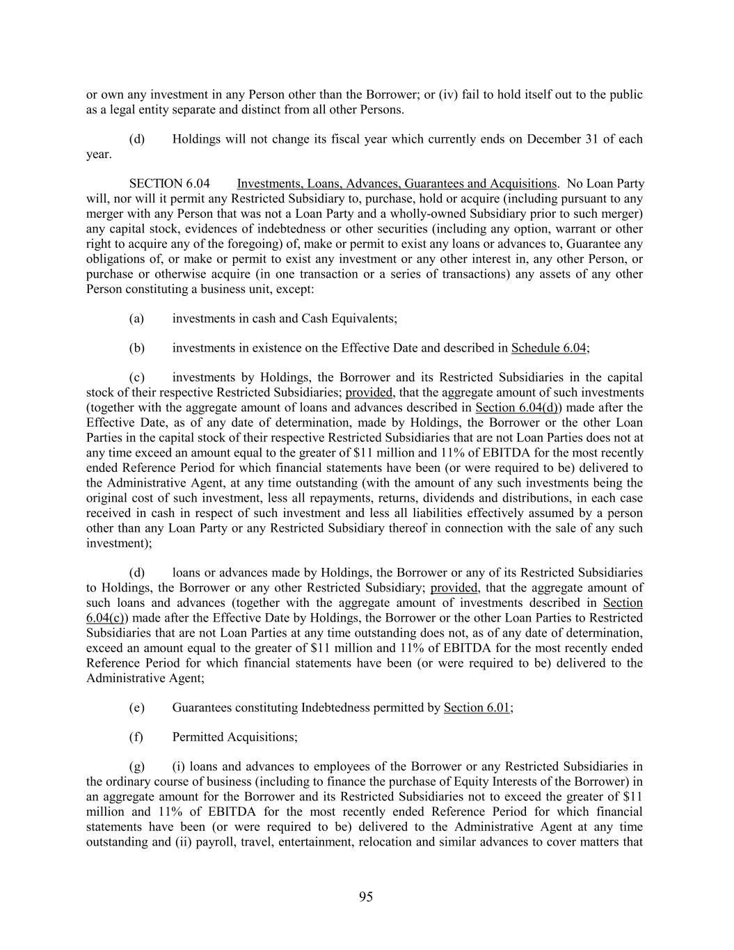 or own any investment in any Person other than the Borrower; or (iv) fail to hold itself out to the public as a legal entity separate and distinct from all other Persons. (d) Holdings will not change its fiscal year which currently ends on December 31 of each year. SECTION 6.04 Investments, Loans, Advances, Guarantees and Acquisitions. No Loan Party will, nor will it permit any Restricted Subsidiary to, purchase, hold or acquire (including pursuant to any merger with any Person that was not a Loan Party and a wholly-owned Subsidiary prior to such merger) any capital stock, evidences of indebtedness or other securities (including any option, warrant or other right to acquire any of the foregoing) of, make or permit to exist any loans or advances to, Guarantee any obligations of, or make or permit to exist any investment or any other interest in, any other Person, or purchase or otherwise acquire (in one transaction or a series of transactions) any assets of any other Person constituting a business unit, except: (a) investments in cash and Cash Equivalents; (b) investments in existence on the Effective Date and described in Schedule 6.04; (c) investments by Holdings, the Borrower and its Restricted Subsidiaries in the capital stock of their respective Restricted Subsidiaries; provided, that the aggregate amount of such investments (together with the aggregate amount of loans and advances described in Section 6.04(d)) made after the Effective Date, as of any date of determination, made by Holdings, the Borrower or the other Loan Parties in the capital stock of their respective Restricted Subsidiaries that are not Loan Parties does not at any time exceed an amount equal to the greater of $11 million and 11% of EBITDA for the most recently ended Reference Period for which financial statements have been (or were required to be) delivered to the Administrative Agent, at any time outstanding (with the amount of any such investments being the original cost of such investment, less all repayments, returns, dividends and distributions, in each case received in cash in respect of such investment and less all liabilities effectively assumed by a person other than any Loan Party or any Restricted Subsidiary thereof in connection with the sale of any such investment); (d) loans or advances made by Holdings, the Borrower or any of its Restricted Subsidiaries to Holdings, the Borrower or any other Restricted Subsidiary; provided, that the aggregate amount of such loans and advances (together with the aggregate amount of investments described in Section 6.04(c)) made after the Effective Date by Holdings, the Borrower or the other Loan Parties to Restricted Subsidiaries that are not Loan Parties at any time outstanding does not, as of any date of determination, exceed an amount equal to the greater of $11 million and 11% of EBITDA for the most recently ended Reference Period for which financial statements have been (or were required to be) delivered to the Administrative Agent; (e) Guarantees constituting Indebtedness permitted by Section 6.01; (f) Permitted Acquisitions; (g) (i) loans and advances to employees of the Borrower or any Restricted Subsidiaries in the ordinary course of business (including to finance the purchase of Equity Interests of the Borrower) in an aggregate amount for the Borrower and its Restricted Subsidiaries not to exceed the greater of $11 million and 11% of EBITDA for the most recently ended Reference Period for which financial statements have been (or were required to be) delivered to the Administrative Agent at any time outstanding and (ii) payroll, travel, entertainment, relocation and similar advances to cover matters that 95