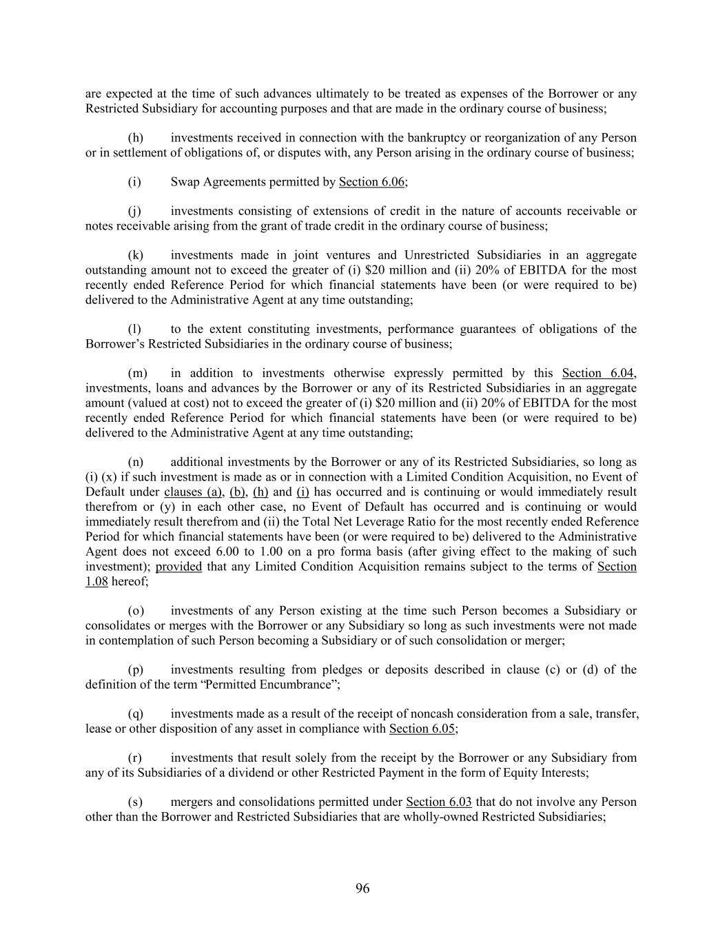 are expected at the time of such advances ultimately to be treated as expenses of the Borrower or any Restricted Subsidiary for accounting purposes and that are made in the ordinary course of business; (h) investments received in connection with the bankruptcy or reorganization of any Person or in settlement of obligations of, or disputes with, any Person arising in the ordinary course of business; (i) Swap Agreements permitted by Section 6.06; (j) investments consisting of extensions of credit in the nature of accounts receivable or notes receivable arising from the grant of trade credit in the ordinary course of business; (k) investments made in joint ventures and Unrestricted Subsidiaries in an aggregate outstanding amount not to exceed the greater of (i) $20 million and (ii) 20% of EBITDA for the most recently ended Reference Period for which financial statements have been (or were required to be) delivered to the Administrative Agent at any time outstanding; (l) to the extent constituting investments, performance guarantees of obligations of the Borrower’s Restricted Subsidiaries in the ordinary course of business; (m) in addition to investments otherwise expressly permitted by this Section 6.04, investments, loans and advances by the Borrower or any of its Restricted Subsidiaries in an aggregate amount (valued at cost) not to exceed the greater of (i) $20 million and (ii) 20% of EBITDA for the most recently ended Reference Period for which financial statements have been (or were required to be) delivered to the Administrative Agent at any time outstanding; (n) additional investments by the Borrower or any of its Restricted Subsidiaries, so long as (i) (x) if such investment is made as or in connection with a Limited Condition Acquisition, no Event of Default under clauses (a), (b), (h) and (i) has occurred and is continuing or would immediately result therefrom or (y) in each other case, no Event of Default has occurred and is continuing or would immediately result therefrom and (ii) the Total Net Leverage Ratio for the most recently ended Reference Period for which financial statements have been (or were required to be) delivered to the Administrative Agent does not exceed 6.00 to 1.00 on a pro forma basis (after giving effect to the making of such investment); provided that any Limited Condition Acquisition remains subject to the terms of Section 1.08 hereof; (o) investments of any Person existing at the time such Person becomes a Subsidiary or consolidates or merges with the Borrower or any Subsidiary so long as such investments were not made in contemplation of such Person becoming a Subsidiary or of such consolidation or merger; (p) investments resulting from pledges or deposits described in clause (c) or (d) of the definition of the term “Permitted Encumbrance”; (q) investments made as a result of the receipt of noncash consideration from a sale, transfer, lease or other disposition of any asset in compliance with Section 6.05; (r) investments that result solely from the receipt by the Borrower or any Subsidiary from any of its Subsidiaries of a dividend or other Restricted Payment in the form of Equity Interests; (s) mergers and consolidations permitted under Section 6.03 that do not involve any Person other than the Borrower and Restricted Subsidiaries that are wholly-owned Restricted Subsidiaries; 96