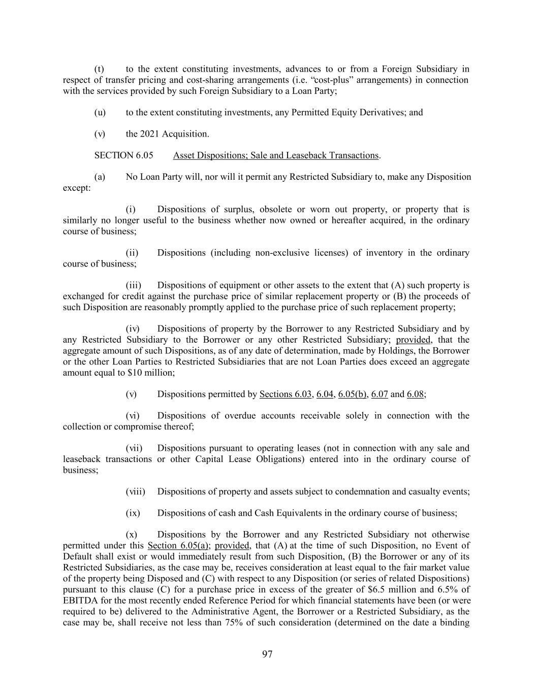 (t) to the extent constituting investments, advances to or from a Foreign Subsidiary in respect of transfer pricing and cost-sharing arrangements (i.e. “cost-plus” arrangements) in connection with the services provided by such Foreign Subsidiary to a Loan Party; (u) to the extent constituting investments, any Permitted Equity Derivatives; and (v) the 2021 Acquisition. SECTION 6.05 Asset Dispositions; Sale and Leaseback Transactions. (a) No Loan Party will, nor will it permit any Restricted Subsidiary to, make any Disposition except: (i) Dispositions of surplus, obsolete or worn out property, or property that is similarly no longer useful to the business whether now owned or hereafter acquired, in the ordinary course of business; (ii) Dispositions (including non-exclusive licenses) of inventory in the ordinary course of business; (iii) Dispositions of equipment or other assets to the extent that (A) such property is exchanged for credit against the purchase price of similar replacement property or (B) the proceeds of such Disposition are reasonably promptly applied to the purchase price of such replacement property; (iv) Dispositions of property by the Borrower to any Restricted Subsidiary and by any Restricted Subsidiary to the Borrower or any other Restricted Subsidiary; provided, that the aggregate amount of such Dispositions, as of any date of determination, made by Holdings, the Borrower or the other Loan Parties to Restricted Subsidiaries that are not Loan Parties does exceed an aggregate amount equal to $10 million; (v) Dispositions permitted by Sections 6.03, 6.04, 6.05(b), 6.07 and 6.08; (vi) Dispositions of overdue accounts receivable solely in connection with the collection or compromise thereof; (vii) Dispositions pursuant to operating leases (not in connection with any sale and leaseback transactions or other Capital Lease Obligations) entered into in the ordinary course of business; (viii) Dispositions of property and assets subject to condemnation and casualty events; (ix) Dispositions of cash and Cash Equivalents in the ordinary course of business; (x) Dispositions by the Borrower and any Restricted Subsidiary not otherwise permitted under this Section 6.05(a); provided, that (A) at the time of such Disposition, no Event of Default shall exist or would immediately result from such Disposition, (B) the Borrower or any of its Restricted Subsidiaries, as the case may be, receives consideration at least equal to the fair market value of the property being Disposed and (C) with respect to any Disposition (or series of related Dispositions) pursuant to this clause (C) for a purchase price in excess of the greater of $6.5 million and 6.5% of EBITDA for the most recently ended Reference Period for which financial statements have been (or were required to be) delivered to the Administrative Agent, the Borrower or a Restricted Subsidiary, as the case may be, shall receive not less than 75% of such consideration (determined on the date a binding 97