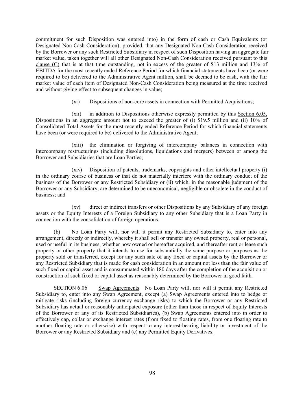 commitment for such Disposition was entered into) in the form of cash or Cash Equivalents (or Designated Non-Cash Consideration); provided, that any Designated Non-Cash Consideration received by the Borrower or any such Restricted Subsidiary in respect of such Disposition having an aggregate fair market value, taken together will all other Designated Non-Cash Consideration received pursuant to this clause (C) that is at that time outstanding, not in excess of the greater of $13 million and 13% of EBITDA for the most recently ended Reference Period for which financial statements have been (or were required to be) delivered to the Administrative Agent million, shall be deemed to be cash, with the fair market value of each item of Designated Non-Cash Consideration being measured at the time received and without giving effect to subsequent changes in value; (xi) Dispositions of non-core assets in connection with Permitted Acquisitions; (xii) in addition to Dispositions otherwise expressly permitted by this Section 6.05, Dispositions in an aggregate amount not to exceed the greater of (i) $19.5 million and (ii) 10% of Consolidated Total Assets for the most recently ended Reference Period for which financial statements have been (or were required to be) delivered to the Administrative Agent; (xiii) the elimination or forgiving of intercompany balances in connection with intercompany restructurings (including dissolutions, liquidations and mergers) between or among the Borrower and Subsidiaries that are Loan Parties; (xiv) Disposition of patents, trademarks, copyrights and other intellectual property (i) in the ordinary course of business or that do not materially interfere with the ordinary conduct of the business of the Borrower or any Restricted Subsidiary or (ii) which, in the reasonable judgment of the Borrower or any Subsidiary, are determined to be uneconomical, negligible or obsolete in the conduct of business; and (xv) direct or indirect transfers or other Dispositions by any Subsidiary of any foreign assets or the Equity Interests of a Foreign Subsidiary to any other Subsidiary that is a Loan Party in connection with the consolidation of foreign operations. (b) No Loan Party will, nor will it permit any Restricted Subsidiary to, enter into any arrangement, directly or indirectly, whereby it shall sell or transfer any owned property, real or personal, used or useful in its business, whether now owned or hereafter acquired, and thereafter rent or lease such property or other property that it intends to use for substantially the same purpose or purposes as the property sold or transferred, except for any such sale of any fixed or capital assets by the Borrower or any Restricted Subsidiary that is made for cash consideration in an amount not less than the fair value of such fixed or capital asset and is consummated within 180 days after the completion of the acquisition or construction of such fixed or capital asset as reasonably determined by the Borrower in good faith. SECTION 6.06 Swap Agreements. No Loan Party will, nor will it permit any Restricted Subsidiary to, enter into any Swap Agreement, except (a) Swap Agreements entered into to hedge or mitigate risks (including foreign currency exchange risks) to which the Borrower or any Restricted Subsidiary has actual or reasonably anticipated exposure (other than those in respect of Equity Interests of the Borrower or any of its Restricted Subsidiaries), (b) Swap Agreements entered into in order to effectively cap, collar or exchange interest rates (from fixed to floating rates, from one floating rate to another floating rate or otherwise) with respect to any interest-bearing liability or investment of the Borrower or any Restricted Subsidiary and (c) any Permitted Equity Derivatives. 98