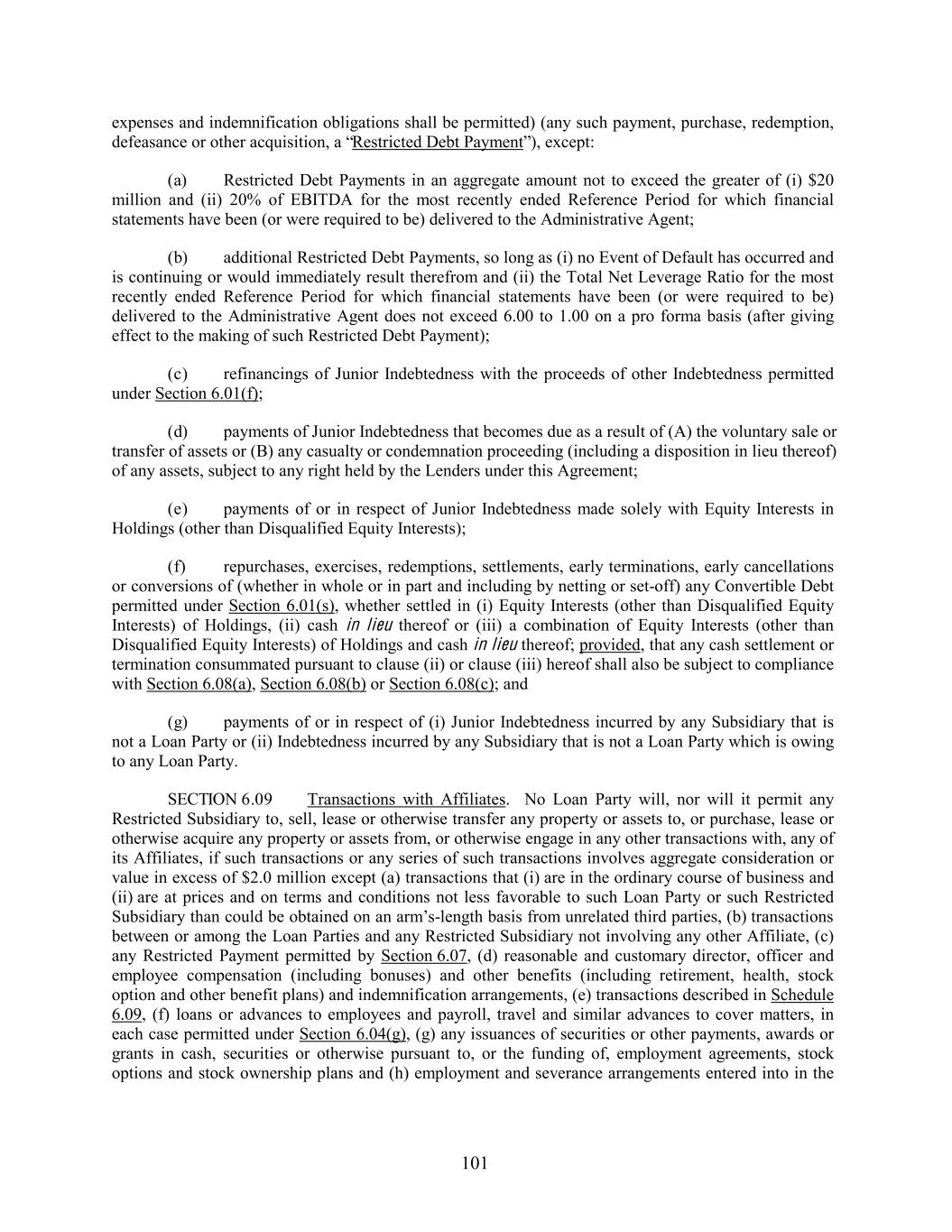 expenses and indemnification obligations shall be permitted) (any such payment, purchase, redemption, defeasance or other acquisition, a “Restricted Debt Payment”), except: (a) Restricted Debt Payments in an aggregate amount not to exceed the greater of (i) $20 million and (ii) 20% of EBITDA for the most recently ended Reference Period for which financial statements have been (or were required to be) delivered to the Administrative Agent; (b) additional Restricted Debt Payments, so long as (i) no Event of Default has occurred and is continuing or would immediately result therefrom and (ii) the Total Net Leverage Ratio for the most recently ended Reference Period for which financial statements have been (or were required to be) delivered to the Administrative Agent does not exceed 6.00 to 1.00 on a pro forma basis (after giving effect to the making of such Restricted Debt Payment); (c) refinancings of Junior Indebtedness with the proceeds of other Indebtedness permitted under Section 6.01(f); (d) payments of Junior Indebtedness that becomes due as a result of (A) the voluntary sale or transfer of assets or (B) any casualty or condemnation proceeding (including a disposition in lieu thereof) of any assets, subject to any right held by the Lenders under this Agreement; (e) payments of or in respect of Junior Indebtedness made solely with Equity Interests in Holdings (other than Disqualified Equity Interests); (f) repurchases, exercises, redemptions, settlements, early terminations, early cancellations or conversions of (whether in whole or in part and including by netting or set-off) any Convertible Debt permitted under Section 6.01(s), whether settled in (i) Equity Interests (other than Disqualified Equity Interests) of Holdings, (ii) cash in lieu thereof or (iii) a combination of Equity Interests (other than Disqualified Equity Interests) of Holdings and cash in lieu thereof; provided, that any cash settlement or termination consummated pursuant to clause (ii) or clause (iii) hereof shall also be subject to compliance with Section 6.08(a), Section 6.08(b) or Section 6.08(c); and (g) payments of or in respect of (i) Junior Indebtedness incurred by any Subsidiary that is not a Loan Party or (ii) Indebtedness incurred by any Subsidiary that is not a Loan Party which is owing to any Loan Party. SECTION 6.09 Transactions with Affiliates. No Loan Party will, nor will it permit any Restricted Subsidiary to, sell, lease or otherwise transfer any property or assets to, or purchase, lease or otherwise acquire any property or assets from, or otherwise engage in any other transactions with, any of its Affiliates, if such transactions or any series of such transactions involves aggregate consideration or value in excess of $2.0 million except (a) transactions that (i) are in the ordinary course of business and (ii) are at prices and on terms and conditions not less favorable to such Loan Party or such Restricted Subsidiary than could be obtained on an arm’s-length basis from unrelated third parties, (b) transactions between or among the Loan Parties and any Restricted Subsidiary not involving any other Affiliate, (c) any Restricted Payment permitted by Section 6.07, (d) reasonable and customary director, officer and employee compensation (including bonuses) and other benefits (including retirement, health, stock option and other benefit plans) and indemnification arrangements, (e) transactions described in Schedule 6.09, (f) loans or advances to employees and payroll, travel and similar advances to cover matters, in each case permitted under Section 6.04(g), (g) any issuances of securities or other payments, awards or grants in cash, securities or otherwise pursuant to, or the funding of, employment agreements, stock options and stock ownership plans and (h) employment and severance arrangements entered into in the 101
