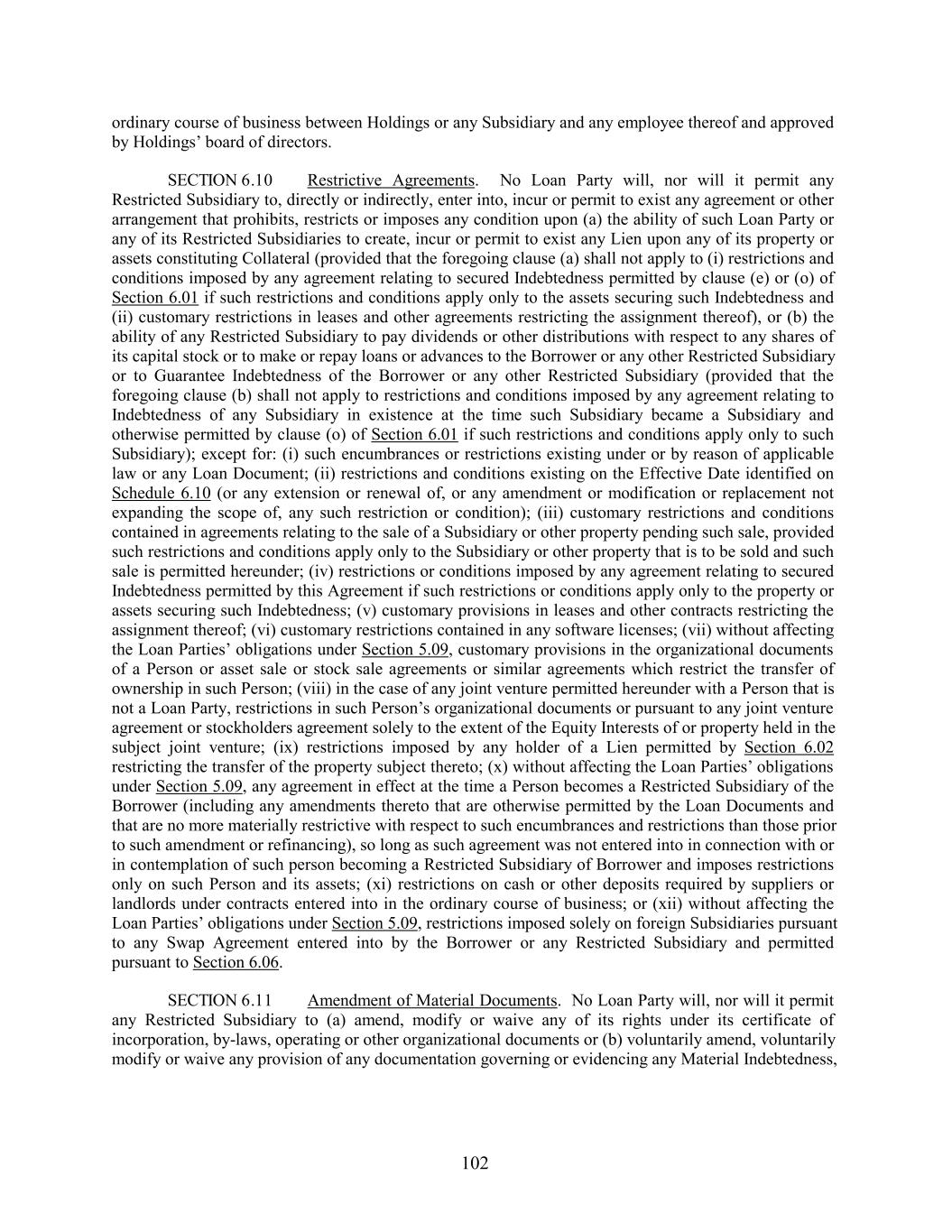 ordinary course of business between Holdings or any Subsidiary and any employee thereof and approved by Holdings’ board of directors. SECTION 6.10 Restrictive Agreements. No Loan Party will, nor will it permit any Restricted Subsidiary to, directly or indirectly, enter into, incur or permit to exist any agreement or other arrangement that prohibits, restricts or imposes any condition upon (a) the ability of such Loan Party or any of its Restricted Subsidiaries to create, incur or permit to exist any Lien upon any of its property or assets constituting Collateral (provided that the foregoing clause (a) shall not apply to (i) restrictions and conditions imposed by any agreement relating to secured Indebtedness permitted by clause (e) or (o) of Section 6.01 if such restrictions and conditions apply only to the assets securing such Indebtedness and (ii) customary restrictions in leases and other agreements restricting the assignment thereof), or (b) the ability of any Restricted Subsidiary to pay dividends or other distributions with respect to any shares of its capital stock or to make or repay loans or advances to the Borrower or any other Restricted Subsidiary or to Guarantee Indebtedness of the Borrower or any other Restricted Subsidiary (provided that the foregoing clause (b) shall not apply to restrictions and conditions imposed by any agreement relating to Indebtedness of any Subsidiary in existence at the time such Subsidiary became a Subsidiary and otherwise permitted by clause (o) of Section 6.01 if such restrictions and conditions apply only to such Subsidiary); except for: (i) such encumbrances or restrictions existing under or by reason of applicable law or any Loan Document; (ii) restrictions and conditions existing on the Effective Date identified on Schedule 6.10 (or any extension or renewal of, or any amendment or modification or replacement not expanding the scope of, any such restriction or condition); (iii) customary restrictions and conditions contained in agreements relating to the sale of a Subsidiary or other property pending such sale, provided such restrictions and conditions apply only to the Subsidiary or other property that is to be sold and such sale is permitted hereunder; (iv) restrictions or conditions imposed by any agreement relating to secured Indebtedness permitted by this Agreement if such restrictions or conditions apply only to the property or assets securing such Indebtedness; (v) customary provisions in leases and other contracts restricting the assignment thereof; (vi) customary restrictions contained in any software licenses; (vii) without affecting the Loan Parties’ obligations under Section 5.09, customary provisions in the organizational documents of a Person or asset sale or stock sale agreements or similar agreements which restrict the transfer of ownership in such Person; (viii) in the case of any joint venture permitted hereunder with a Person that is not a Loan Party, restrictions in such Person’s organizational documents or pursuant to any joint venture agreement or stockholders agreement solely to the extent of the Equity Interests of or property held in the subject joint venture; (ix) restrictions imposed by any holder of a Lien permitted by Section 6.02 restricting the transfer of the property subject thereto; (x) without affecting the Loan Parties’ obligations under Section 5.09, any agreement in effect at the time a Person becomes a Restricted Subsidiary of the Borrower (including any amendments thereto that are otherwise permitted by the Loan Documents and that are no more materially restrictive with respect to such encumbrances and restrictions than those prior to such amendment or refinancing), so long as such agreement was not entered into in connection with or in contemplation of such person becoming a Restricted Subsidiary of Borrower and imposes restrictions only on such Person and its assets; (xi) restrictions on cash or other deposits required by suppliers or landlords under contracts entered into in the ordinary course of business; or (xii) without affecting the Loan Parties’ obligations under Section 5.09, restrictions imposed solely on foreign Subsidiaries pursuant to any Swap Agreement entered into by the Borrower or any Restricted Subsidiary and permitted pursuant to Section 6.06. SECTION 6.11 Amendment of Material Documents. No Loan Party will, nor will it permit any Restricted Subsidiary to (a) amend, modify or waive any of its rights under its certificate of incorporation, by-laws, operating or other organizational documents or (b) voluntarily amend, voluntarily modify or waive any provision of any documentation governing or evidencing any Material Indebtedness, 102