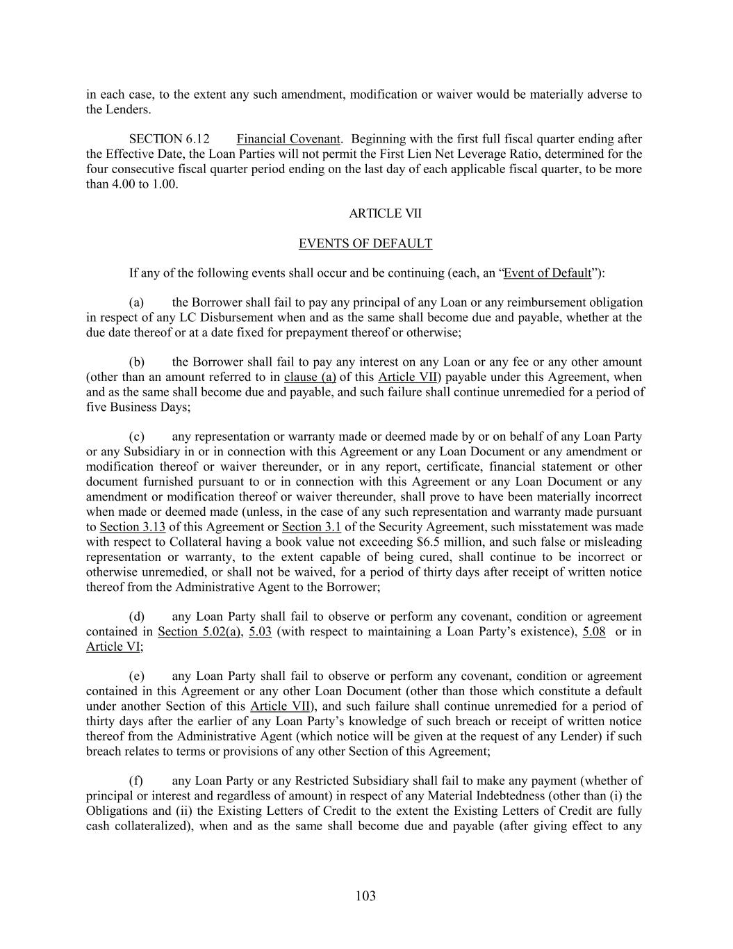 in each case, to the extent any such amendment, modification or waiver would be materially adverse to the Lenders. SECTION 6.12 Financial Covenant. Beginning with the first full fiscal quarter ending after the Effective Date, the Loan Parties will not permit the First Lien Net Leverage Ratio, determined for the four consecutive fiscal quarter period ending on the last day of each applicable fiscal quarter, to be more than 4.00 to 1.00. ARTICLE VII EVENTS OF DEFAULT If any of the following events shall occur and be continuing (each, an “Event of Default”): (a) the Borrower shall fail to pay any principal of any Loan or any reimbursement obligation in respect of any LC Disbursement when and as the same shall become due and payable, whether at the due date thereof or at a date fixed for prepayment thereof or otherwise; (b) the Borrower shall fail to pay any interest on any Loan or any fee or any other amount (other than an amount referred to in clause (a) of this Article VII) payable under this Agreement, when and as the same shall become due and payable, and such failure shall continue unremedied for a period of five Business Days; (c) any representation or warranty made or deemed made by or on behalf of any Loan Party or any Subsidiary in or in connection with this Agreement or any Loan Document or any amendment or modification thereof or waiver thereunder, or in any report, certificate, financial statement or other document furnished pursuant to or in connection with this Agreement or any Loan Document or any amendment or modification thereof or waiver thereunder, shall prove to have been materially incorrect when made or deemed made (unless, in the case of any such representation and warranty made pursuant to Section 3.13 of this Agreement or Section 3.1 of the Security Agreement, such misstatement was made with respect to Collateral having a book value not exceeding $6.5 million, and such false or misleading representation or warranty, to the extent capable of being cured, shall continue to be incorrect or otherwise unremedied, or shall not be waived, for a period of thirty days after receipt of written notice thereof from the Administrative Agent to the Borrower; (d) any Loan Party shall fail to observe or perform any covenant, condition or agreement contained in Section 5.02(a), 5.03 (with respect to maintaining a Loan Party’s existence), 5.08 or in Article VI; (e) any Loan Party shall fail to observe or perform any covenant, condition or agreement contained in this Agreement or any other Loan Document (other than those which constitute a default under another Section of this Article VII), and such failure shall continue unremedied for a period of thirty days after the earlier of any Loan Party’s knowledge of such breach or receipt of written notice thereof from the Administrative Agent (which notice will be given at the request of any Lender) if such breach relates to terms or provisions of any other Section of this Agreement; (f) any Loan Party or any Restricted Subsidiary shall fail to make any payment (whether of principal or interest and regardless of amount) in respect of any Material Indebtedness (other than (i) the Obligations and (ii) the Existing Letters of Credit to the extent the Existing Letters of Credit are fully cash collateralized), when and as the same shall become due and payable (after giving effect to any 103