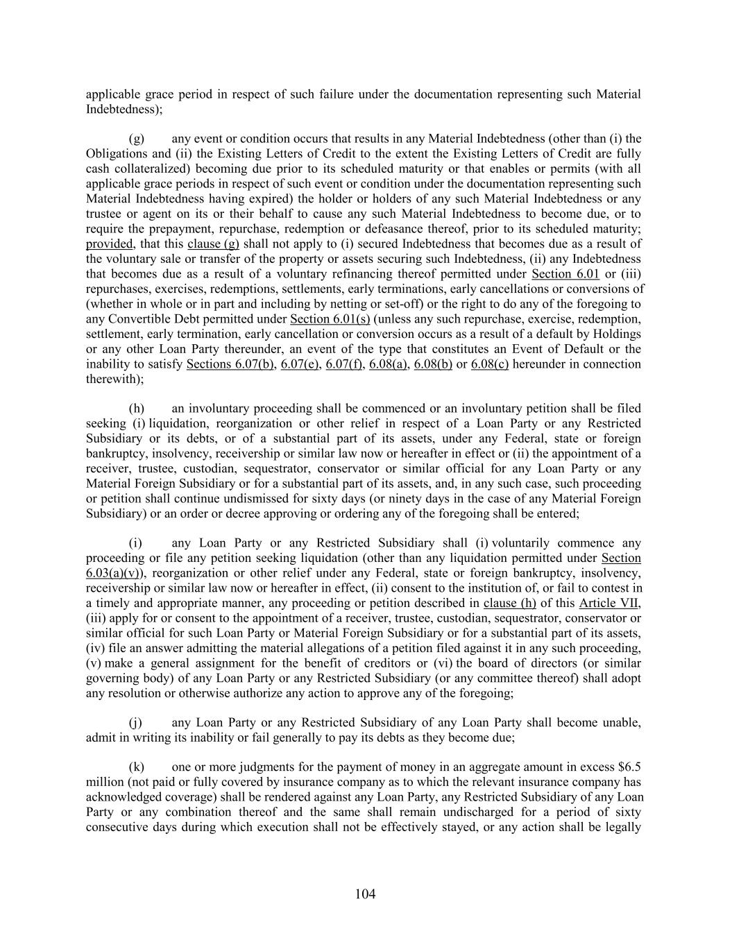 applicable grace period in respect of such failure under the documentation representing such Material Indebtedness); (g) any event or condition occurs that results in any Material Indebtedness (other than (i) the Obligations and (ii) the Existing Letters of Credit to the extent the Existing Letters of Credit are fully cash collateralized) becoming due prior to its scheduled maturity or that enables or permits (with all applicable grace periods in respect of such event or condition under the documentation representing such Material Indebtedness having expired) the holder or holders of any such Material Indebtedness or any trustee or agent on its or their behalf to cause any such Material Indebtedness to become due, or to require the prepayment, repurchase, redemption or defeasance thereof, prior to its scheduled maturity; provided, that this clause (g) shall not apply to (i) secured Indebtedness that becomes due as a result of the voluntary sale or transfer of the property or assets securing such Indebtedness, (ii) any Indebtedness that becomes due as a result of a voluntary refinancing thereof permitted under Section 6.01 or (iii) repurchases, exercises, redemptions, settlements, early terminations, early cancellations or conversions of (whether in whole or in part and including by netting or set-off) or the right to do any of the foregoing to any Convertible Debt permitted under Section 6.01(s) (unless any such repurchase, exercise, redemption, settlement, early termination, early cancellation or conversion occurs as a result of a default by Holdings or any other Loan Party thereunder, an event of the type that constitutes an Event of Default or the inability to satisfy Sections 6.07(b), 6.07(e), 6.07(f), 6.08(a), 6.08(b) or 6.08(c) hereunder in connection therewith); (h) an involuntary proceeding shall be commenced or an involuntary petition shall be filed seeking (i) liquidation, reorganization or other relief in respect of a Loan Party or any Restricted Subsidiary or its debts, or of a substantial part of its assets, under any Federal, state or foreign bankruptcy, insolvency, receivership or similar law now or hereafter in effect or (ii) the appointment of a receiver, trustee, custodian, sequestrator, conservator or similar official for any Loan Party or any Material Foreign Subsidiary or for a substantial part of its assets, and, in any such case, such proceeding or petition shall continue undismissed for sixty days (or ninety days in the case of any Material Foreign Subsidiary) or an order or decree approving or ordering any of the foregoing shall be entered; (i) any Loan Party or any Restricted Subsidiary shall (i) voluntarily commence any proceeding or file any petition seeking liquidation (other than any liquidation permitted under Section 6.03(a)(v)), reorganization or other relief under any Federal, state or foreign bankruptcy, insolvency, receivership or similar law now or hereafter in effect, (ii) consent to the institution of, or fail to contest in a timely and appropriate manner, any proceeding or petition described in clause (h) of this Article VII, (iii) apply for or consent to the appointment of a receiver, trustee, custodian, sequestrator, conservator or similar official for such Loan Party or Material Foreign Subsidiary or for a substantial part of its assets, (iv) file an answer admitting the material allegations of a petition filed against it in any such proceeding, (v) make a general assignment for the benefit of creditors or (vi) the board of directors (or similar governing body) of any Loan Party or any Restricted Subsidiary (or any committee thereof) shall adopt any resolution or otherwise authorize any action to approve any of the foregoing; (j) any Loan Party or any Restricted Subsidiary of any Loan Party shall become unable, admit in writing its inability or fail generally to pay its debts as they become due; (k) one or more judgments for the payment of money in an aggregate amount in excess $6.5 million (not paid or fully covered by insurance company as to which the relevant insurance company has acknowledged coverage) shall be rendered against any Loan Party, any Restricted Subsidiary of any Loan Party or any combination thereof and the same shall remain undischarged for a period of sixty consecutive days during which execution shall not be effectively stayed, or any action shall be legally 104