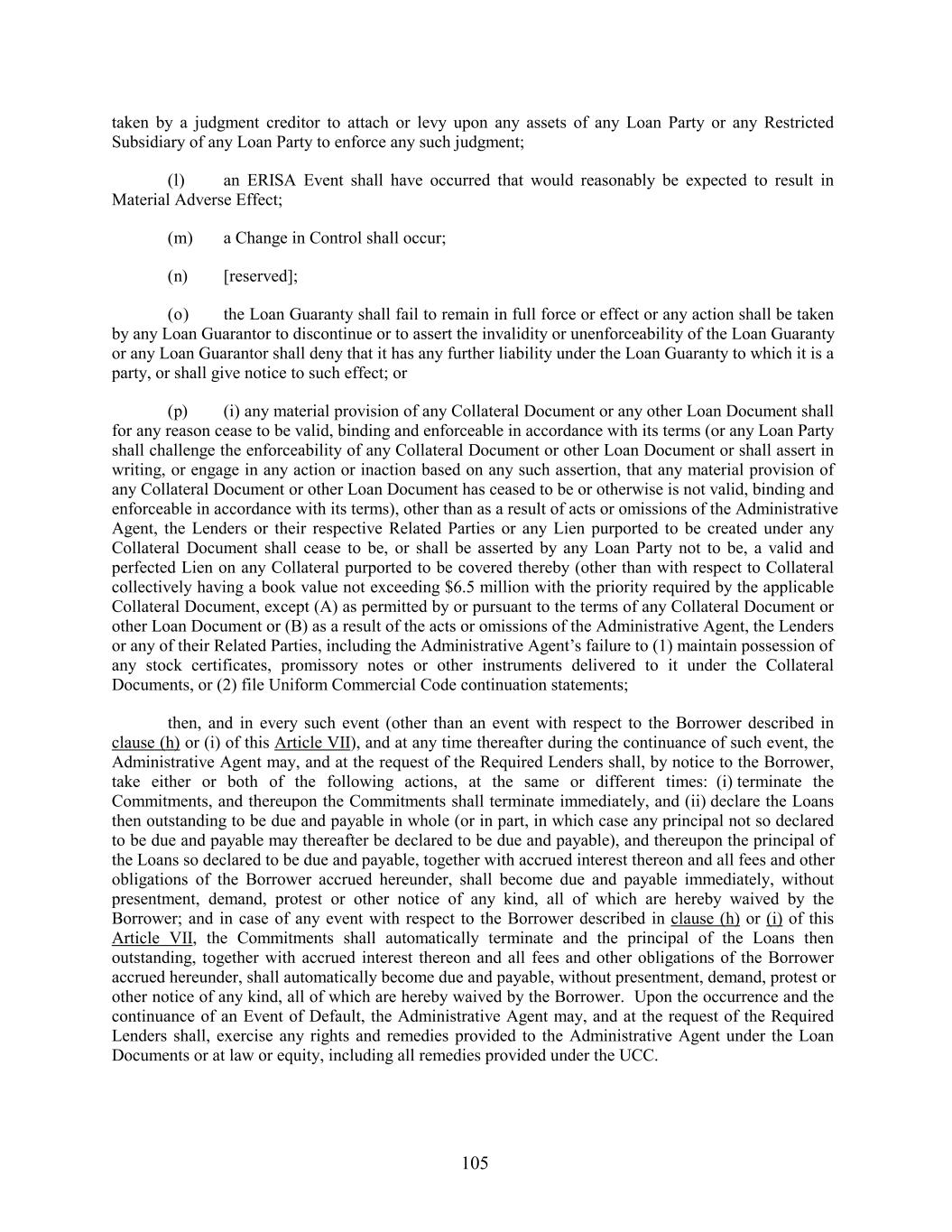 taken by a judgment creditor to attach or levy upon any assets of any Loan Party or any Restricted Subsidiary of any Loan Party to enforce any such judgment; (l) an ERISA Event shall have occurred that would reasonably be expected to result in Material Adverse Effect; (m) a Change in Control shall occur; (n) [reserved]; (o) the Loan Guaranty shall fail to remain in full force or effect or any action shall be taken by any Loan Guarantor to discontinue or to assert the invalidity or unenforceability of the Loan Guaranty or any Loan Guarantor shall deny that it has any further liability under the Loan Guaranty to which it is a party, or shall give notice to such effect; or (p) (i) any material provision of any Collateral Document or any other Loan Document shall for any reason cease to be valid, binding and enforceable in accordance with its terms (or any Loan Party shall challenge the enforceability of any Collateral Document or other Loan Document or shall assert in writing, or engage in any action or inaction based on any such assertion, that any material provision of any Collateral Document or other Loan Document has ceased to be or otherwise is not valid, binding and enforceable in accordance with its terms), other than as a result of acts or omissions of the Administrative Agent, the Lenders or their respective Related Parties or any Lien purported to be created under any Collateral Document shall cease to be, or shall be asserted by any Loan Party not to be, a valid and perfected Lien on any Collateral purported to be covered thereby (other than with respect to Collateral collectively having a book value not exceeding $6.5 million with the priority required by the applicable Collateral Document, except (A) as permitted by or pursuant to the terms of any Collateral Document or other Loan Document or (B) as a result of the acts or omissions of the Administrative Agent, the Lenders or any of their Related Parties, including the Administrative Agent’s failure to (1) maintain possession of any stock certificates, promissory notes or other instruments delivered to it under the Collateral Documents, or (2) file Uniform Commercial Code continuation statements; then, and in every such event (other than an event with respect to the Borrower described in clause (h) or (i) of this Article VII), and at any time thereafter during the continuance of such event, the Administrative Agent may, and at the request of the Required Lenders shall, by notice to the Borrower, take either or both of the following actions, at the same or different times: (i) terminate the Commitments, and thereupon the Commitments shall terminate immediately, and (ii) declare the Loans then outstanding to be due and payable in whole (or in part, in which case any principal not so declared to be due and payable may thereafter be declared to be due and payable), and thereupon the principal of the Loans so declared to be due and payable, together with accrued interest thereon and all fees and other obligations of the Borrower accrued hereunder, shall become due and payable immediately, without presentment, demand, protest or other notice of any kind, all of which are hereby waived by the Borrower; and in case of any event with respect to the Borrower described in clause (h) or (i) of this Article VII, the Commitments shall automatically terminate and the principal of the Loans then outstanding, together with accrued interest thereon and all fees and other obligations of the Borrower accrued hereunder, shall automatically become due and payable, without presentment, demand, protest or other notice of any kind, all of which are hereby waived by the Borrower. Upon the occurrence and the continuance of an Event of Default, the Administrative Agent may, and at the request of the Required Lenders shall, exercise any rights and remedies provided to the Administrative Agent under the Loan Documents or at law or equity, including all remedies provided under the UCC. 105