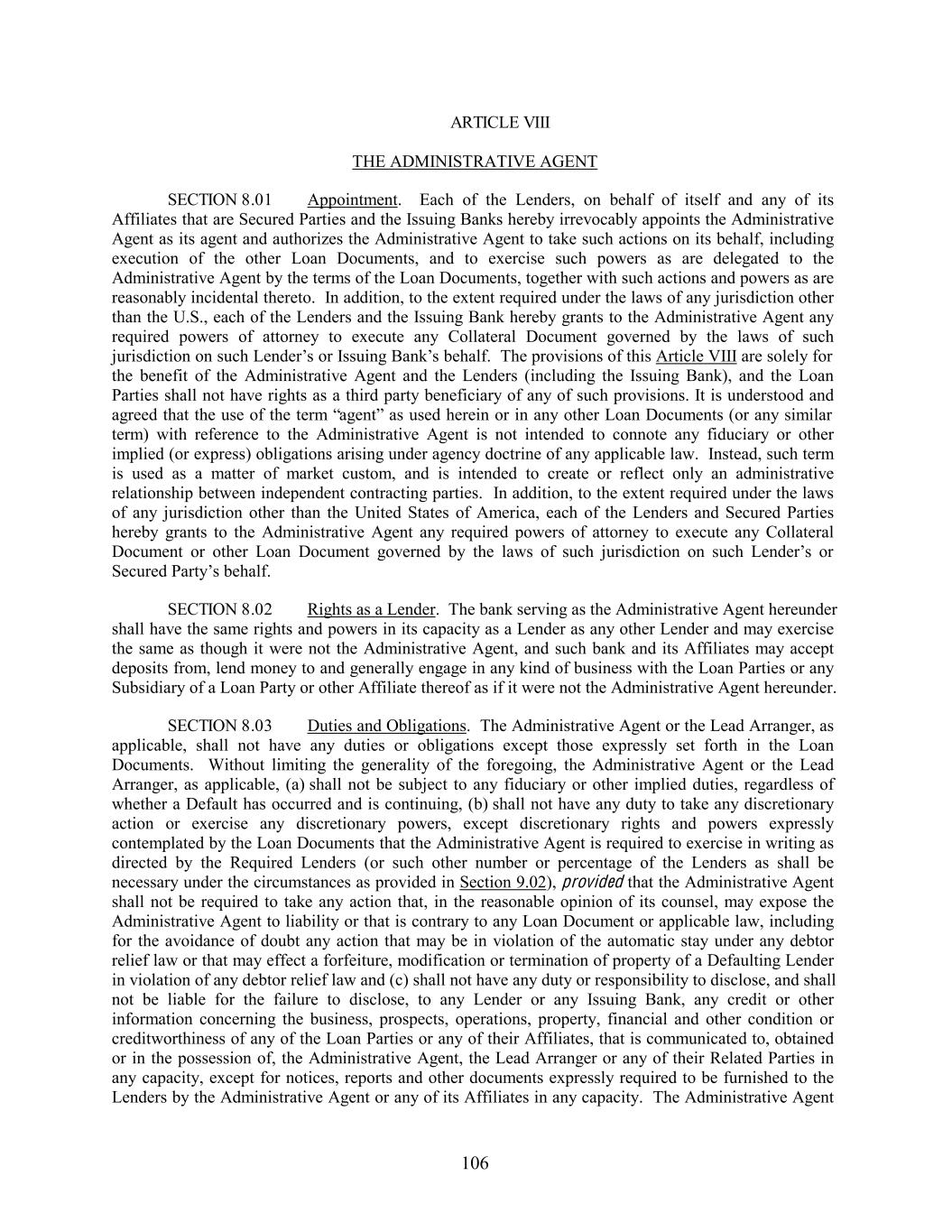 ARTICLE VIII THE ADMINISTRATIVE AGENT SECTION 8.01 Appointment. Each of the Lenders, on behalf of itself and any of its Affiliates that are Secured Parties and the Issuing Banks hereby irrevocably appoints the Administrative Agent as its agent and authorizes the Administrative Agent to take such actions on its behalf, including execution of the other Loan Documents, and to exercise such powers as are delegated to the Administrative Agent by the terms of the Loan Documents, together with such actions and powers as are reasonably incidental thereto. In addition, to the extent required under the laws of any jurisdiction other than the U.S., each of the Lenders and the Issuing Bank hereby grants to the Administrative Agent any required powers of attorney to execute any Collateral Document governed by the laws of such jurisdiction on such Lender’s or Issuing Bank’s behalf. The provisions of this Article VIII are solely for the benefit of the Administrative Agent and the Lenders (including the Issuing Bank), and the Loan Parties shall not have rights as a third party beneficiary of any of such provisions. It is understood and agreed that the use of the term “agent” as used herein or in any other Loan Documents (or any similar term) with reference to the Administrative Agent is not intended to connote any fiduciary or other implied (or express) obligations arising under agency doctrine of any applicable law. Instead, such term is used as a matter of market custom, and is intended to create or reflect only an administrative relationship between independent contracting parties. In addition, to the extent required under the laws of any jurisdiction other than the United States of America, each of the Lenders and Secured Parties hereby grants to the Administrative Agent any required powers of attorney to execute any Collateral Document or other Loan Document governed by the laws of such jurisdiction on such Lender’s or Secured Party’s behalf. SECTION 8.02 Rights as a Lender. The bank serving as the Administrative Agent hereunder shall have the same rights and powers in its capacity as a Lender as any other Lender and may exercise the same as though it were not the Administrative Agent, and such bank and its Affiliates may accept deposits from, lend money to and generally engage in any kind of business with the Loan Parties or any Subsidiary of a Loan Party or other Affiliate thereof as if it were not the Administrative Agent hereunder. SECTION 8.03 Duties and Obligations. The Administrative Agent or the Lead Arranger, as applicable, shall not have any duties or obligations except those expressly set forth in the Loan Documents. Without limiting the generality of the foregoing, the Administrative Agent or the Lead Arranger, as applicable, (a) shall not be subject to any fiduciary or other implied duties, regardless of whether a Default has occurred and is continuing, (b) shall not have any duty to take any discretionary action or exercise any discretionary powers, except discretionary rights and powers expressly contemplated by the Loan Documents that the Administrative Agent is required to exercise in writing as directed by the Required Lenders (or such other number or percentage of the Lenders as shall be necessary under the circumstances as provided in Section 9.02), provided that the Administrative Agent shall not be required to take any action that, in the reasonable opinion of its counsel, may expose the Administrative Agent to liability or that is contrary to any Loan Document or applicable law, including for the avoidance of doubt any action that may be in violation of the automatic stay under any debtor relief law or that may effect a forfeiture, modification or termination of property of a Defaulting Lender in violation of any debtor relief law and (c) shall not have any duty or responsibility to disclose, and shall not be liable for the failure to disclose, to any Lender or any Issuing Bank, any credit or other information concerning the business, prospects, operations, property, financial and other condition or creditworthiness of any of the Loan Parties or any of their Affiliates, that is communicated to, obtained or in the possession of, the Administrative Agent, the Lead Arranger or any of their Related Parties in any capacity, except for notices, reports and other documents expressly required to be furnished to the Lenders by the Administrative Agent or any of its Affiliates in any capacity. The Administrative Agent 106