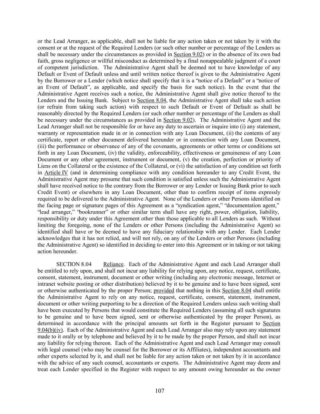 or the Lead Arranger, as applicable, shall not be liable for any action taken or not taken by it with the consent or at the request of the Required Lenders (or such other number or percentage of the Lenders as shall be necessary under the circumstances as provided in Section 9.02) or in the absence of its own bad faith, gross negligence or willful misconduct as determined by a final nonappealable judgment of a court of competent jurisdiction. The Administrative Agent shall be deemed not to have knowledge of any Default or Event of Default unless and until written notice thereof is given to the Administrative Agent by the Borrower or a Lender (which notice shall specify that it is a “notice of a Default” or a “notice of an Event of Default”, as applicable, and specify the basis for such notice). In the event that the Administrative Agent receives such a notice, the Administrative Agent shall give notice thereof to the Lenders and the Issuing Bank. Subject to Section 8.04, the Administrative Agent shall take such action (or refrain from taking such action) with respect to such Default or Event of Default as shall be reasonably directed by the Required Lenders (or such other number or percentage of the Lenders as shall be necessary under the circumstances as provided in Section 9.02). The Administrative Agent and the Lead Arranger shall not be responsible for or have any duty to ascertain or inquire into (i) any statement, warranty or representation made in or in connection with any Loan Document, (ii) the contents of any certificate, report or other document delivered hereunder or in connection with any Loan Document, (iii) the performance or observance of any of the covenants, agreements or other terms or conditions set forth in any Loan Document, (iv) the validity, enforceability, effectiveness or genuineness of any Loan Document or any other agreement, instrument or document, (v) the creation, perfection or priority of Liens on the Collateral or the existence of the Collateral, or (vi) the satisfaction of any condition set forth in Article IV (and in determining compliance with any condition hereunder to any Credit Event, the Administrative Agent may presume that such condition is satisfied unless such the Administrative Agent shall have received notice to the contrary from the Borrower or any Lender or Issuing Bank prior to such Credit Event) or elsewhere in any Loan Document, other than to confirm receipt of items expressly required to be delivered to the Administrative Agent. None of the Lenders or other Persons identified on the facing page or signature pages of this Agreement as a “syndication agent,” “documentation agent,” “lead arranger,” “bookrunner” or other similar term shall have any right, power, obligation, liability, responsibility or duty under this Agreement other than those applicable to all Lenders as such. Without limiting the foregoing, none of the Lenders or other Persons (including the Administrative Agent) so identified shall have or be deemed to have any fiduciary relationship with any Lender. Each Lender acknowledges that it has not relied, and will not rely, on any of the Lenders or other Persons (including the Administrative Agent) so identified in deciding to enter into this Agreement or in taking or not taking action hereunder. SECTION 8.04 Reliance. Each of the Administrative Agent and each Lead Arranger shall be entitled to rely upon, and shall not incur any liability for relying upon, any notice, request, certificate, consent, statement, instrument, document or other writing (including any electronic message, Internet or intranet website posting or other distribution) believed by it to be genuine and to have been signed, sent or otherwise authenticated by the proper Person; provided that nothing in this Section 8.04 shall entitle the Administrative Agent to rely on any notice, request, certificate, consent, statement, instrument, document or other writing purporting to be a direction of the Required Lenders unless such writing shall have been executed by Persons that would constitute the Required Lenders (assuming all such signatures to be genuine and to have been signed, sent or otherwise authenticated by the proper Person), as determined in accordance with the principal amounts set forth in the Register pursuant to Section 9.04(b)(iv). Each of the Administrative Agent and each Lead Arranger also may rely upon any statement made to it orally or by telephone and believed by it to be made by the proper Person, and shall not incur any liability for relying thereon. Each of the Administrative Agent and each Lead Arranger may consult with legal counsel (who may be counsel for the Borrower or its Affiliates), independent accountants and other experts selected by it, and shall not be liable for any action taken or not taken by it in accordance with the advice of any such counsel, accountants or experts. The Administrative Agent may deem and treat each Lender specified in the Register with respect to any amount owing hereunder as the owner 107