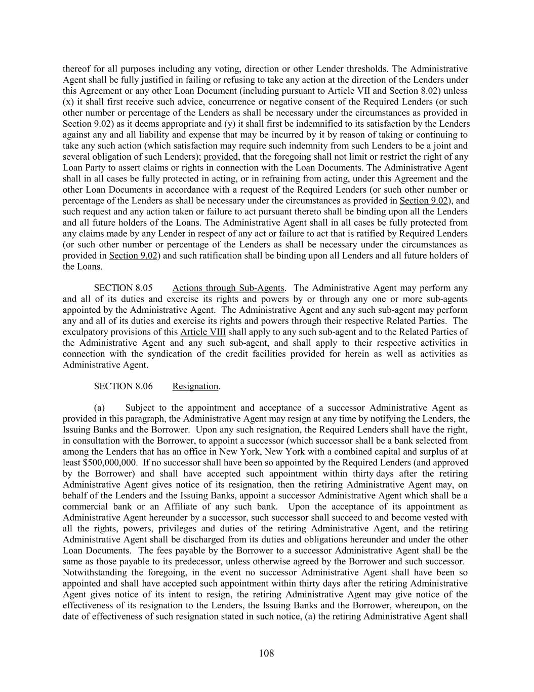 thereof for all purposes including any voting, direction or other Lender thresholds. The Administrative Agent shall be fully justified in failing or refusing to take any action at the direction of the Lenders under this Agreement or any other Loan Document (including pursuant to Article VII and Section 8.02) unless (x) it shall first receive such advice, concurrence or negative consent of the Required Lenders (or such other number or percentage of the Lenders as shall be necessary under the circumstances as provided in Section 9.02) as it deems appropriate and (y) it shall first be indemnified to its satisfaction by the Lenders against any and all liability and expense that may be incurred by it by reason of taking or continuing to take any such action (which satisfaction may require such indemnity from such Lenders to be a joint and several obligation of such Lenders); provided, that the foregoing shall not limit or restrict the right of any Loan Party to assert claims or rights in connection with the Loan Documents. The Administrative Agent shall in all cases be fully protected in acting, or in refraining from acting, under this Agreement and the other Loan Documents in accordance with a request of the Required Lenders (or such other number or percentage of the Lenders as shall be necessary under the circumstances as provided in Section 9.02), and such request and any action taken or failure to act pursuant thereto shall be binding upon all the Lenders and all future holders of the Loans. The Administrative Agent shall in all cases be fully protected from any claims made by any Lender in respect of any act or failure to act that is ratified by Required Lenders (or such other number or percentage of the Lenders as shall be necessary under the circumstances as provided in Section 9.02) and such ratification shall be binding upon all Lenders and all future holders of the Loans. SECTION 8.05 Actions through Sub-Agents. The Administrative Agent may perform any and all of its duties and exercise its rights and powers by or through any one or more sub-agents appointed by the Administrative Agent. The Administrative Agent and any such sub-agent may perform any and all of its duties and exercise its rights and powers through their respective Related Parties. The exculpatory provisions of this Article VIII shall apply to any such sub-agent and to the Related Parties of the Administrative Agent and any such sub-agent, and shall apply to their respective activities in connection with the syndication of the credit facilities provided for herein as well as activities as Administrative Agent. SECTION 8.06 Resignation. (a) Subject to the appointment and acceptance of a successor Administrative Agent as provided in this paragraph, the Administrative Agent may resign at any time by notifying the Lenders, the Issuing Banks and the Borrower. Upon any such resignation, the Required Lenders shall have the right, in consultation with the Borrower, to appoint a successor (which successor shall be a bank selected from among the Lenders that has an office in New York, New York with a combined capital and surplus of at least $500,000,000. If no successor shall have been so appointed by the Required Lenders (and approved by the Borrower) and shall have accepted such appointment within thirty days after the retiring Administrative Agent gives notice of its resignation, then the retiring Administrative Agent may, on behalf of the Lenders and the Issuing Banks, appoint a successor Administrative Agent which shall be a commercial bank or an Affiliate of any such bank. Upon the acceptance of its appointment as Administrative Agent hereunder by a successor, such successor shall succeed to and become vested with all the rights, powers, privileges and duties of the retiring Administrative Agent, and the retiring Administrative Agent shall be discharged from its duties and obligations hereunder and under the other Loan Documents. The fees payable by the Borrower to a successor Administrative Agent shall be the same as those payable to its predecessor, unless otherwise agreed by the Borrower and such successor. Notwithstanding the foregoing, in the event no successor Administrative Agent shall have been so appointed and shall have accepted such appointment within thirty days after the retiring Administrative Agent gives notice of its intent to resign, the retiring Administrative Agent may give notice of the effectiveness of its resignation to the Lenders, the Issuing Banks and the Borrower, whereupon, on the date of effectiveness of such resignation stated in such notice, (a) the retiring Administrative Agent shall 108