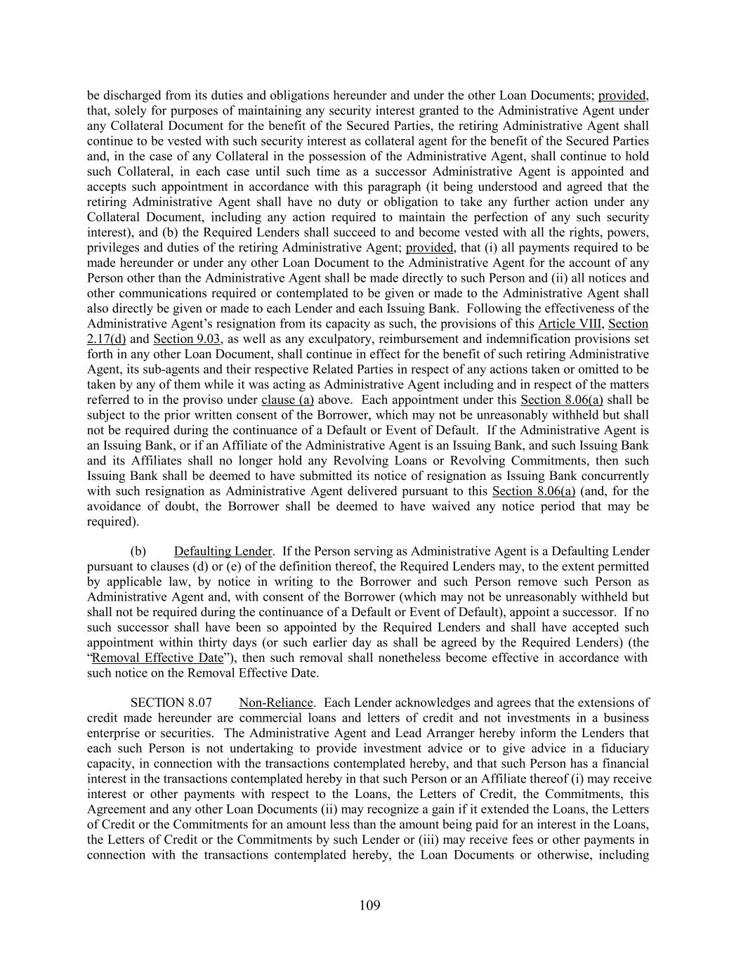 be discharged from its duties and obligations hereunder and under the other Loan Documents; provided, that, solely for purposes of maintaining any security interest granted to the Administrative Agent under any Collateral Document for the benefit of the Secured Parties, the retiring Administrative Agent shall continue to be vested with such security interest as collateral agent for the benefit of the Secured Parties and, in the case of any Collateral in the possession of the Administrative Agent, shall continue to hold such Collateral, in each case until such time as a successor Administrative Agent is appointed and accepts such appointment in accordance with this paragraph (it being understood and agreed that the retiring Administrative Agent shall have no duty or obligation to take any further action under any Collateral Document, including any action required to maintain the perfection of any such security interest), and (b) the Required Lenders shall succeed to and become vested with all the rights, powers, privileges and duties of the retiring Administrative Agent; provided, that (i) all payments required to be made hereunder or under any other Loan Document to the Administrative Agent for the account of any Person other than the Administrative Agent shall be made directly to such Person and (ii) all notices and other communications required or contemplated to be given or made to the Administrative Agent shall also directly be given or made to each Lender and each Issuing Bank. Following the effectiveness of the Administrative Agent’s resignation from its capacity as such, the provisions of this Article VIII, Section 2.17(d) and Section 9.03, as well as any exculpatory, reimbursement and indemnification provisions set forth in any other Loan Document, shall continue in effect for the benefit of such retiring Administrative Agent, its sub-agents and their respective Related Parties in respect of any actions taken or omitted to be taken by any of them while it was acting as Administrative Agent including and in respect of the matters referred to in the proviso under clause (a) above. Each appointment under this Section 8.06(a) shall be subject to the prior written consent of the Borrower, which may not be unreasonably withheld but shall not be required during the continuance of a Default or Event of Default. If the Administrative Agent is an Issuing Bank, or if an Affiliate of the Administrative Agent is an Issuing Bank, and such Issuing Bank and its Affiliates shall no longer hold any Revolving Loans or Revolving Commitments, then such Issuing Bank shall be deemed to have submitted its notice of resignation as Issuing Bank concurrently with such resignation as Administrative Agent delivered pursuant to this Section 8.06(a) (and, for the avoidance of doubt, the Borrower shall be deemed to have waived any notice period that may be required). (b) Defaulting Lender. If the Person serving as Administrative Agent is a Defaulting Lender pursuant to clauses (d) or (e) of the definition thereof, the Required Lenders may, to the extent permitted by applicable law, by notice in writing to the Borrower and such Person remove such Person as Administrative Agent and, with consent of the Borrower (which may not be unreasonably withheld but shall not be required during the continuance of a Default or Event of Default), appoint a successor. If no such successor shall have been so appointed by the Required Lenders and shall have accepted such appointment within thirty days (or such earlier day as shall be agreed by the Required Lenders) (the “Removal Effective Date”), then such removal shall nonetheless become effective in accordance with such notice on the Removal Effective Date. SECTION 8.07 Non-Reliance. Each Lender acknowledges and agrees that the extensions of credit made hereunder are commercial loans and letters of credit and not investments in a business enterprise or securities. The Administrative Agent and Lead Arranger hereby inform the Lenders that each such Person is not undertaking to provide investment advice or to give advice in a fiduciary capacity, in connection with the transactions contemplated hereby, and that such Person has a financial interest in the transactions contemplated hereby in that such Person or an Affiliate thereof (i) may receive interest or other payments with respect to the Loans, the Letters of Credit, the Commitments, this Agreement and any other Loan Documents (ii) may recognize a gain if it extended the Loans, the Letters of Credit or the Commitments for an amount less than the amount being paid for an interest in the Loans, the Letters of Credit or the Commitments by such Lender or (iii) may receive fees or other payments in connection with the transactions contemplated hereby, the Loan Documents or otherwise, including 109