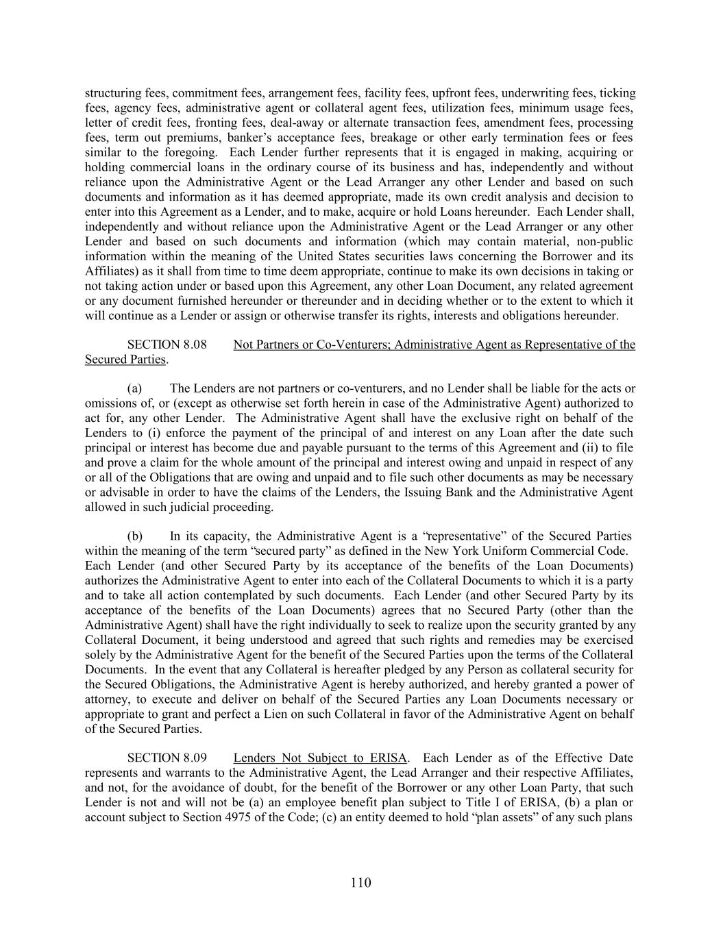 structuring fees, commitment fees, arrangement fees, facility fees, upfront fees, underwriting fees, ticking fees, agency fees, administrative agent or collateral agent fees, utilization fees, minimum usage fees, letter of credit fees, fronting fees, deal-away or alternate transaction fees, amendment fees, processing fees, term out premiums, banker’s acceptance fees, breakage or other early termination fees or fees similar to the foregoing. Each Lender further represents that it is engaged in making, acquiring or holding commercial loans in the ordinary course of its business and has, independently and without reliance upon the Administrative Agent or the Lead Arranger any other Lender and based on such documents and information as it has deemed appropriate, made its own credit analysis and decision to enter into this Agreement as a Lender, and to make, acquire or hold Loans hereunder. Each Lender shall, independently and without reliance upon the Administrative Agent or the Lead Arranger or any other Lender and based on such documents and information (which may contain material, non-public information within the meaning of the United States securities laws concerning the Borrower and its Affiliates) as it shall from time to time deem appropriate, continue to make its own decisions in taking or not taking action under or based upon this Agreement, any other Loan Document, any related agreement or any document furnished hereunder or thereunder and in deciding whether or to the extent to which it will continue as a Lender or assign or otherwise transfer its rights, interests and obligations hereunder. SECTION 8.08 Not Partners or Co-Venturers; Administrative Agent as Representative of the Secured Parties. (a) The Lenders are not partners or co-venturers, and no Lender shall be liable for the acts or omissions of, or (except as otherwise set forth herein in case of the Administrative Agent) authorized to act for, any other Lender. The Administrative Agent shall have the exclusive right on behalf of the Lenders to (i) enforce the payment of the principal of and interest on any Loan after the date such principal or interest has become due and payable pursuant to the terms of this Agreement and (ii) to file and prove a claim for the whole amount of the principal and interest owing and unpaid in respect of any or all of the Obligations that are owing and unpaid and to file such other documents as may be necessary or advisable in order to have the claims of the Lenders, the Issuing Bank and the Administrative Agent allowed in such judicial proceeding. (b) In its capacity, the Administrative Agent is a “representative” of the Secured Parties within the meaning of the term “secured party” as defined in the New York Uniform Commercial Code. Each Lender (and other Secured Party by its acceptance of the benefits of the Loan Documents) authorizes the Administrative Agent to enter into each of the Collateral Documents to which it is a party and to take all action contemplated by such documents. Each Lender (and other Secured Party by its acceptance of the benefits of the Loan Documents) agrees that no Secured Party (other than the Administrative Agent) shall have the right individually to seek to realize upon the security granted by any Collateral Document, it being understood and agreed that such rights and remedies may be exercised solely by the Administrative Agent for the benefit of the Secured Parties upon the terms of the Collateral Documents. In the event that any Collateral is hereafter pledged by any Person as collateral security for the Secured Obligations, the Administrative Agent is hereby authorized, and hereby granted a power of attorney, to execute and deliver on behalf of the Secured Parties any Loan Documents necessary or appropriate to grant and perfect a Lien on such Collateral in favor of the Administrative Agent on behalf of the Secured Parties. SECTION 8.09 Lenders Not Subject to ERISA. Each Lender as of the Effective Date represents and warrants to the Administrative Agent, the Lead Arranger and their respective Affiliates, and not, for the avoidance of doubt, for the benefit of the Borrower or any other Loan Party, that such Lender is not and will not be (a) an employee benefit plan subject to Title I of ERISA, (b) a plan or account subject to Section 4975 of the Code; (c) an entity deemed to hold “plan assets” of any such plans 110