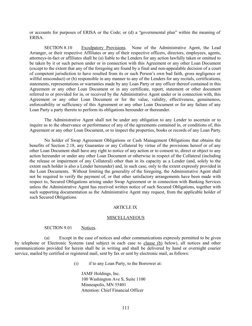or accounts for purposes of ERISA or the Code; or (d) a “governmental plan” within the meaning of ERISA. SECTION 8.10 Exculpatory Provisions. None of the Administrative Agent, the Lead Arranger, or their respective Affiliates or any of their respective officers, directors, employees, agents, attorneys-in-fact or affiliates shall be (a) liable to the Lenders for any action lawfully taken or omitted to be taken by it or such person under or in connection with this Agreement or any other Loan Document (except to the extent that any of the foregoing are found by a final and non-appealable decision of a court of competent jurisdiction to have resulted from its or such Person’s own bad faith, gross negligence or willful misconduct) or (b) responsible in any manner to any of the Lenders for any recitals, certifications, statements, representations or warranties made by any Loan Party or any officer thereof contained in this Agreement or any other Loan Document or in any certificate, report, statement or other document referred to or provided for in, or received by the Administrative Agent under or in connection with, this Agreement or any other Loan Document or for the value, validity, effectiveness, genuineness, enforceability or sufficiency of this Agreement or any other Loan Document or for any failure of any Loan Party a party thereto to perform its obligations hereunder or thereunder. The Administrative Agent shall not be under any obligation to any Lender to ascertain or to inquire as to the observance or performance of any of the agreements contained in, or conditions of, this Agreement or any other Loan Document, or to inspect the properties, books or records of any Loan Party. No holder of Swap Agreement Obligations or Cash Management Obligations that obtains the benefits of Section 2.18, any Guarantee or any Collateral by virtue of the provisions hereof or of any other Loan Document shall have any right to notice of any action or to consent to, direct or object to any action hereunder or under any other Loan Document or otherwise in respect of the Collateral (including the release or impairment of any Collateral) other than in its capacity as a Lender (and, solely to the extent such holder is also a Lender hereunder) and, in such case, only to the extent expressly provided in the Loan Documents. Without limiting the generality of the foregoing, the Administrative Agent shall not be required to verify the payment of, or that other satisfactory arrangements have been made with respect to, Secured Obligations arising under Swap Agreement or in connection with Banking Services unless the Administrative Agent has received written notice of such Secured Obligations, together with such supporting documentation as the Administrative Agent may request, from the applicable holder of such Secured Obligations. ARTICLE IX MISCELLANEOUS SECTION 9.01 Notices. (a) Except in the case of notices and other communications expressly permitted to be given by telephone or Electronic Systems (and subject in each case to clause (b) below), all notices and other communications provided for herein shall be in writing and shall be delivered by hand or overnight courier service, mailed by certified or registered mail, sent by fax or sent by electronic mail, as follows: (i) if to any Loan Party, to the Borrower at: JAMF Holdings, Inc. 100 Washington Ave S, Suite 1100 Minneapolis, MN 55401 Attention: Chief Financial Officer 111
