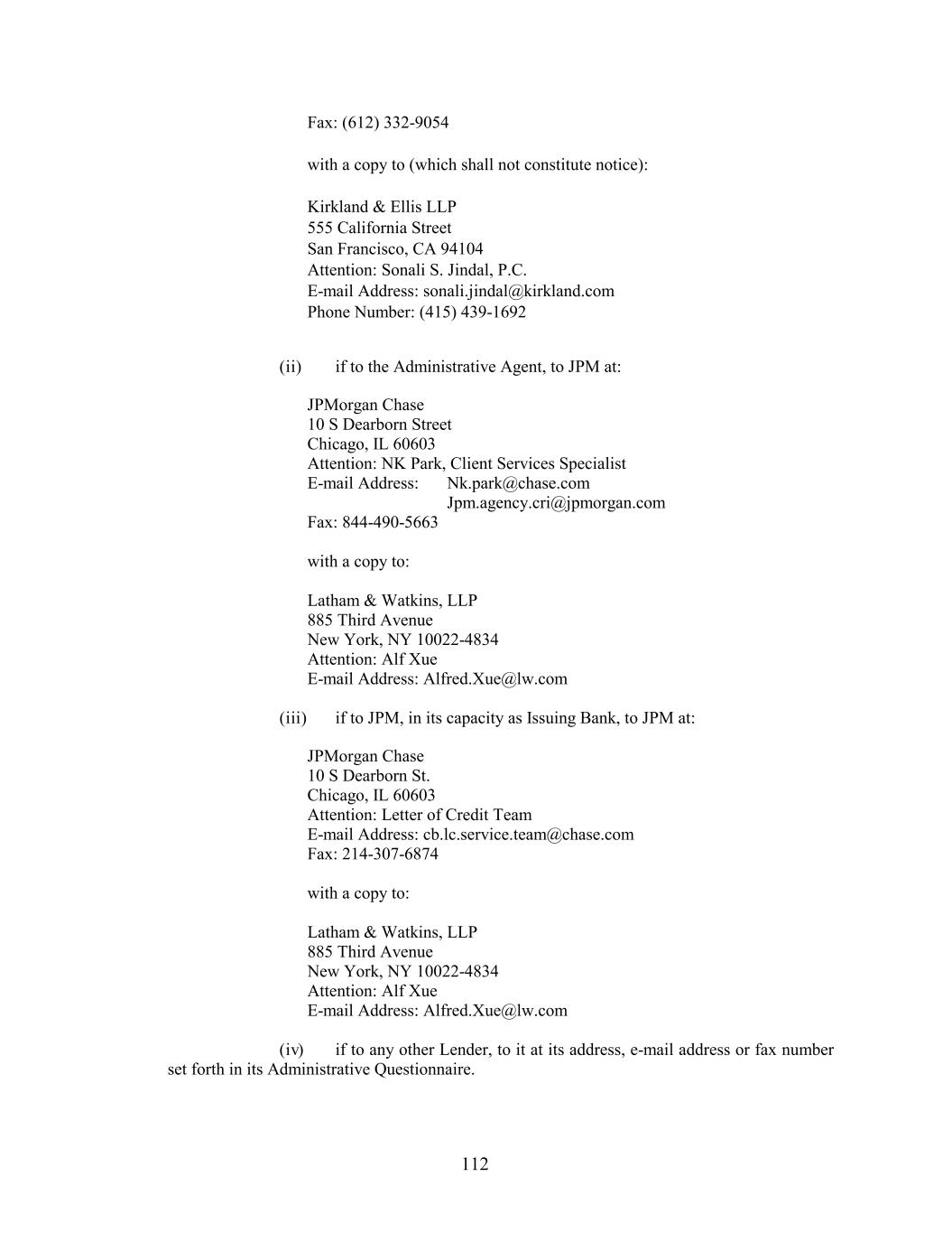 Fax: (612) 332-9054 with a copy to (which shall not constitute notice): Kirkland & Ellis LLP 555 California Street San Francisco, CA 94104 Attention: Sonali S. Jindal, P.C. E-mail Address: sonali.jindal@kirkland.com Phone Number: (415) 439-1692 (ii) if to the Administrative Agent, to JPM at: JPMorgan Chase 10 S Dearborn Street Chicago, IL 60603 Attention: NK Park, Client Services Specialist E-mail Address: Nk.park@chase.com Jpm.agency.cri@jpmorgan.com Fax: 844-490-5663 with a copy to: Latham & Watkins, LLP 885 Third Avenue New York, NY 10022-4834 Attention: Alf Xue E-mail Address: Alfred.Xue@lw.com (iii) if to JPM, in its capacity as Issuing Bank, to JPM at: JPMorgan Chase 10 S Dearborn St. Chicago, IL 60603 Attention: Letter of Credit Team E-mail Address: cb.lc.service.team@chase.com Fax: 214-307-6874 with a copy to: Latham & Watkins, LLP 885 Third Avenue New York, NY 10022-4834 Attention: Alf Xue E-mail Address: Alfred.Xue@lw.com (iv) if to any other Lender, to it at its address, e-mail address or fax number set forth in its Administrative Questionnaire. 112