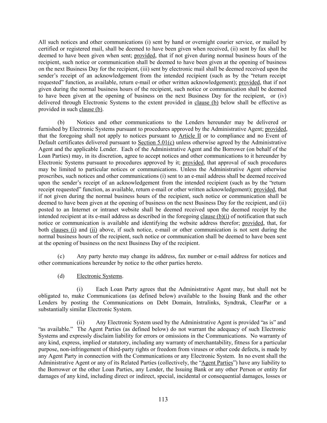 All such notices and other communications (i) sent by hand or overnight courier service, or mailed by certified or registered mail, shall be deemed to have been given when received, (ii) sent by fax shall be deemed to have been given when sent; provided, that if not given during normal business hours of the recipient, such notice or communication shall be deemed to have been given at the opening of business on the next Business Day for the recipient, (iii) sent by electronic mail shall be deemed received upon the sender’s receipt of an acknowledgement from the intended recipient (such as by the “return receipt requested” function, as available, return e-mail or other written acknowledgement); provided, that if not given during the normal business hours of the recipient, such notice or communication shall be deemed to have been given at the opening of business on the next Business Day for the recipient, or (iv) delivered through Electronic Systems to the extent provided in clause (b) below shall be effective as provided in such clause (b). (b) Notices and other communications to the Lenders hereunder may be delivered or furnished by Electronic Systems pursuant to procedures approved by the Administrative Agent; provided, that the foregoing shall not apply to notices pursuant to Article II or to compliance and no Event of Default certificates delivered pursuant to Section 5.01(c) unless otherwise agreed by the Administrative Agent and the applicable Lender. Each of the Administrative Agent and the Borrower (on behalf of the Loan Parties) may, in its discretion, agree to accept notices and other communications to it hereunder by Electronic Systems pursuant to procedures approved by it; provided, that approval of such procedures may be limited to particular notices or communications. Unless the Administrative Agent otherwise proscribes, such notices and other communications (i) sent to an e-mail address shall be deemed received upon the sender’s receipt of an acknowledgement from the intended recipient (such as by the “return receipt requested” function, as available, return e-mail or other written acknowledgement); provided, that if not given during the normal business hours of the recipient, such notice or communication shall be deemed to have been given at the opening of business on the next Business Day for the recipient, and (ii) posted to an Internet or intranet website shall be deemed received upon the deemed receipt by the intended recipient at its e-mail address as described in the foregoing clause (b)(i) of notification that such notice or communication is available and identifying the website address therefor; provided, that, for both clauses (i) and (ii) above, if such notice, e-mail or other communication is not sent during the normal business hours of the recipient, such notice or communication shall be deemed to have been sent at the opening of business on the next Business Day of the recipient. (c) Any party hereto may change its address, fax number or e-mail address for notices and other communications hereunder by notice to the other parties hereto. (d) Electronic Systems. (i) Each Loan Party agrees that the Administrative Agent may, but shall not be obligated to, make Communications (as defined below) available to the Issuing Bank and the other Lenders by posting the Communications on Debt Domain, Intralinks, Syndtrak, ClearPar or a substantially similar Electronic System. (ii) Any Electronic System used by the Administrative Agent is provided “as is” and “as available.” The Agent Parties (as defined below) do not warrant the adequacy of such Electronic Systems and expressly disclaim liability for errors or omissions in the Communications. No warranty of any kind, express, implied or statutory, including any warranty of merchantability, fitness for a particular purpose, non-infringement of third-party rights or freedom from viruses or other code defects, is made by any Agent Party in connection with the Communications or any Electronic System. In no event shall the Administrative Agent or any of its Related Parties (collectively, the “Agent Parties”) have any liability to the Borrower or the other Loan Parties, any Lender, the Issuing Bank or any other Person or entity for damages of any kind, including direct or indirect, special, incidental or consequential damages, losses or 113