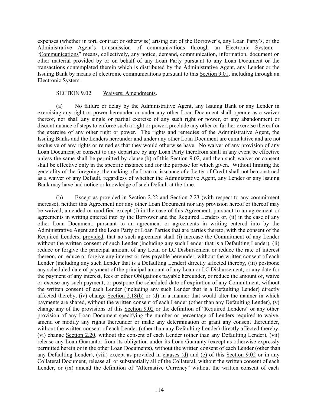 expenses (whether in tort, contract or otherwise) arising out of the Borrower’s, any Loan Party’s, or the Administrative Agent’s transmission of communications through an Electronic System. “Communications” means, collectively, any notice, demand, communication, information, document or other material provided by or on behalf of any Loan Party pursuant to any Loan Document or the transactions contemplated therein which is distributed by the Administrative Agent, any Lender or the Issuing Bank by means of electronic communications pursuant to this Section 9.01, including through an Electronic System. SECTION 9.02 Waivers; Amendments. (a) No failure or delay by the Administrative Agent, any Issuing Bank or any Lender in exercising any right or power hereunder or under any other Loan Document shall operate as a waiver thereof, nor shall any single or partial exercise of any such right or power, or any abandonment or discontinuance of steps to enforce such a right or power, preclude any other or further exercise thereof or the exercise of any other right or power. The rights and remedies of the Administrative Agent, the Issuing Banks and the Lenders hereunder and under any other Loan Document are cumulative and are not exclusive of any rights or remedies that they would otherwise have. No waiver of any provision of any Loan Document or consent to any departure by any Loan Party therefrom shall in any event be effective unless the same shall be permitted by clause (b) of this Section 9.02, and then such waiver or consent shall be effective only in the specific instance and for the purpose for which given. Without limiting the generality of the foregoing, the making of a Loan or issuance of a Letter of Credit shall not be construed as a waiver of any Default, regardless of whether the Administrative Agent, any Lender or any Issuing Bank may have had notice or knowledge of such Default at the time. (b) Except as provided in Section 2.22 and Section 2.23 (with respect to any commitment increase), neither this Agreement nor any other Loan Document nor any provision hereof or thereof may be waived, amended or modified except (i) in the case of this Agreement, pursuant to an agreement or agreements in writing entered into by the Borrower and the Required Lenders or, (ii) in the case of any other Loan Document, pursuant to an agreement or agreements in writing entered into by the Administrative Agent and the Loan Party or Loan Parties that are parties thereto, with the consent of the Required Lenders; provided, that no such agreement shall (i) increase the Commitment of any Lender without the written consent of such Lender (including any such Lender that is a Defaulting Lender), (ii) reduce or forgive the principal amount of any Loan or LC Disbursement or reduce the rate of interest thereon, or reduce or forgive any interest or fees payable hereunder, without the written consent of each Lender (including any such Lender that is a Defaulting Lender) directly affected thereby, (iii) postpone any scheduled date of payment of the principal amount of any Loan or LC Disbursement, or any date for the payment of any interest, fees or other Obligations payable hereunder, or reduce the amount of, waive or excuse any such payment, or postpone the scheduled date of expiration of any Commitment, without the written consent of each Lender (including any such Lender that is a Defaulting Lender) directly affected thereby, (iv) change Section 2.18(b) or (d) in a manner that would alter the manner in which payments are shared, without the written consent of each Lender (other than any Defaulting Lender), (v) change any of the provisions of this Section 9.02 or the definition of “Required Lenders” or any other provision of any Loan Document specifying the number or percentage of Lenders required to waive, amend or modify any rights thereunder or make any determination or grant any consent thereunder, without the written consent of each Lender (other than any Defaulting Lender) directly affected thereby, (vi) change Section 2.20, without the consent of each Lender (other than any Defaulting Lender), (vii) release any Loan Guarantor from its obligation under its Loan Guaranty (except as otherwise expressly permitted herein or in the other Loan Documents), without the written consent of each Lender (other than any Defaulting Lender), (viii) except as provided in clauses (d) and (e) of this Section 9.02 or in any Collateral Document, release all or substantially all of the Collateral, without the written consent of each Lender, or (ix) amend the definition of “Alternative Currency” without the written consent of each 114