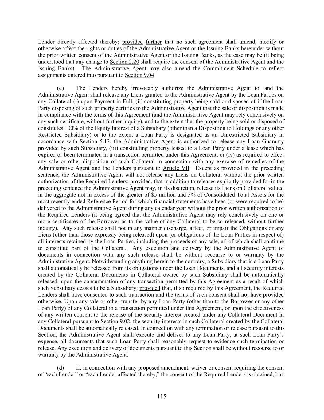 Lender directly affected thereby; provided further that no such agreement shall amend, modify or otherwise affect the rights or duties of the Administrative Agent or the Issuing Banks hereunder without the prior written consent of the Administrative Agent or the Issuing Banks, as the case may be (it being understood that any change to Section 2.20 shall require the consent of the Administrative Agent and the Issuing Banks). The Administrative Agent may also amend the Commitment Schedule to reflect assignments entered into pursuant to Section 9.04 (c) The Lenders hereby irrevocably authorize the Administrative Agent to, and the Administrative Agent shall release any Liens granted to the Administrative Agent by the Loan Parties on any Collateral (i) upon Payment in Full, (ii) constituting property being sold or disposed of if the Loan Party disposing of such property certifies to the Administrative Agent that the sale or disposition is made in compliance with the terms of this Agreement (and the Administrative Agent may rely conclusively on any such certificate, without further inquiry), and to the extent that the property being sold or disposed of constitutes 100% of the Equity Interest of a Subsidiary (other than a Disposition to Holdings or any other Restricted Subsidiary) or to the extent a Loan Party is designated as an Unrestricted Subsidiary in accordance with Section 5.13, the Administrative Agent is authorized to release any Loan Guaranty provided by such Subsidiary, (iii) constituting property leased to a Loan Party under a lease which has expired or been terminated in a transaction permitted under this Agreement, or (iv) as required to effect any sale or other disposition of such Collateral in connection with any exercise of remedies of the Administrative Agent and the Lenders pursuant to Article VII. Except as provided in the preceding sentence, the Administrative Agent will not release any Liens on Collateral without the prior written authorization of the Required Lenders; provided, that in addition to releases explicitly provided for in the preceding sentence the Administrative Agent may, in its discretion, release its Liens on Collateral valued in the aggregate not in excess of the greater of $5 million and 5% of Consolidated Total Assets for the most recently ended Reference Period for which financial statements have been (or were required to be) delivered to the Administrative Agent during any calendar year without the prior written authorization of the Required Lenders (it being agreed that the Administrative Agent may rely conclusively on one or more certificates of the Borrower as to the value of any Collateral to be so released, without further inquiry). Any such release shall not in any manner discharge, affect, or impair the Obligations or any Liens (other than those expressly being released) upon (or obligations of the Loan Parties in respect of) all interests retained by the Loan Parties, including the proceeds of any sale, all of which shall continue to constitute part of the Collateral. Any execution and delivery by the Administrative Agent of documents in connection with any such release shall be without recourse to or warranty by the Administrative Agent. Notwithstanding anything herein to the contrary, a Subsidiary that is a Loan Party shall automatically be released from its obligations under the Loan Documents, and all security interests created by the Collateral Documents in Collateral owned by such Subsidiary shall be automatically released, upon the consummation of any transaction permitted by this Agreement as a result of which such Subsidiary ceases to be a Subsidiary; provided that, if so required by this Agreement, the Required Lenders shall have consented to such transaction and the terms of such consent shall not have provided otherwise. Upon any sale or other transfer by any Loan Party (other than to the Borrower or any other Loan Party) of any Collateral in a transaction permitted under this Agreement, or upon the effectiveness of any written consent to the release of the security interest created under any Collateral Document in any Collateral pursuant to Section 9.02, the security interests in such Collateral created by the Collateral Documents shall be automatically released. In connection with any termination or release pursuant to this Section, the Administrative Agent shall execute and deliver to any Loan Party, at such Loan Party’s expense, all documents that such Loan Party shall reasonably request to evidence such termination or release. Any execution and delivery of documents pursuant to this Section shall be without recourse to or warranty by the Administrative Agent. (d) If, in connection with any proposed amendment, waiver or consent requiring the consent of “each Lender” or “each Lender affected thereby,” the consent of the Required Lenders is obtained, but 115