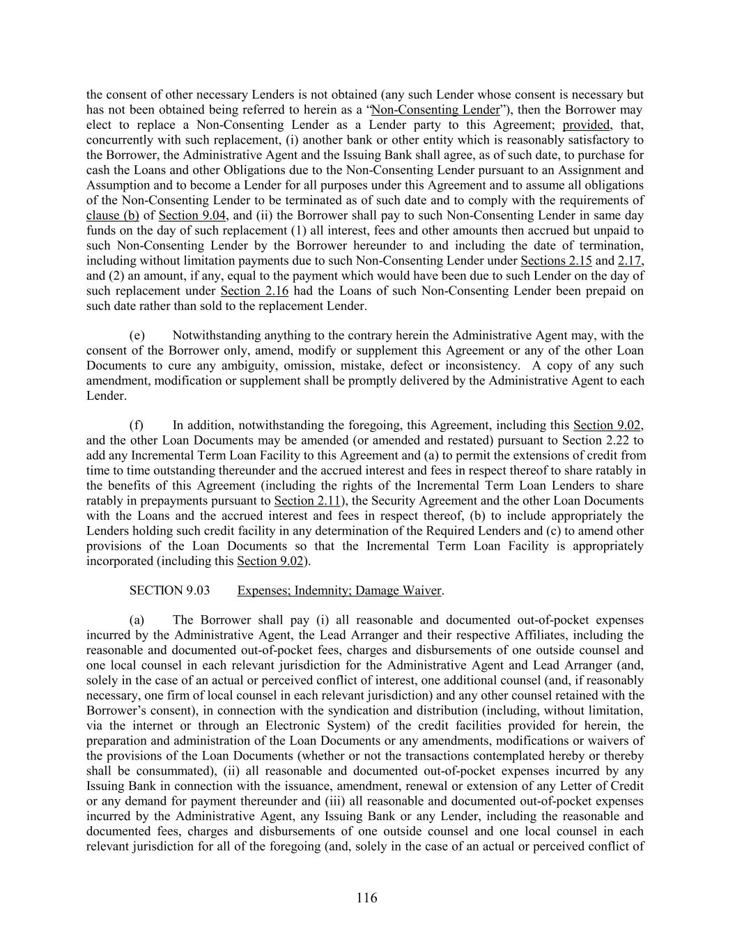 the consent of other necessary Lenders is not obtained (any such Lender whose consent is necessary but has not been obtained being referred to herein as a “Non-Consenting Lender”), then the Borrower may elect to replace a Non-Consenting Lender as a Lender party to this Agreement; provided, that, concurrently with such replacement, (i) another bank or other entity which is reasonably satisfactory to the Borrower, the Administrative Agent and the Issuing Bank shall agree, as of such date, to purchase for cash the Loans and other Obligations due to the Non-Consenting Lender pursuant to an Assignment and Assumption and to become a Lender for all purposes under this Agreement and to assume all obligations of the Non-Consenting Lender to be terminated as of such date and to comply with the requirements of clause (b) of Section 9.04, and (ii) the Borrower shall pay to such Non-Consenting Lender in same day funds on the day of such replacement (1) all interest, fees and other amounts then accrued but unpaid to such Non-Consenting Lender by the Borrower hereunder to and including the date of termination, including without limitation payments due to such Non-Consenting Lender under Sections 2.15 and 2.17, and (2) an amount, if any, equal to the payment which would have been due to such Lender on the day of such replacement under Section 2.16 had the Loans of such Non-Consenting Lender been prepaid on such date rather than sold to the replacement Lender. (e) Notwithstanding anything to the contrary herein the Administrative Agent may, with the consent of the Borrower only, amend, modify or supplement this Agreement or any of the other Loan Documents to cure any ambiguity, omission, mistake, defect or inconsistency. A copy of any such amendment, modification or supplement shall be promptly delivered by the Administrative Agent to each Lender. (f) In addition, notwithstanding the foregoing, this Agreement, including this Section 9.02, and the other Loan Documents may be amended (or amended and restated) pursuant to Section 2.22 to add any Incremental Term Loan Facility to this Agreement and (a) to permit the extensions of credit from time to time outstanding thereunder and the accrued interest and fees in respect thereof to share ratably in the benefits of this Agreement (including the rights of the Incremental Term Loan Lenders to share ratably in prepayments pursuant to Section 2.11), the Security Agreement and the other Loan Documents with the Loans and the accrued interest and fees in respect thereof, (b) to include appropriately the Lenders holding such credit facility in any determination of the Required Lenders and (c) to amend other provisions of the Loan Documents so that the Incremental Term Loan Facility is appropriately incorporated (including this Section 9.02). SECTION 9.03 Expenses; Indemnity; Damage Waiver. (a) The Borrower shall pay (i) all reasonable and documented out-of-pocket expenses incurred by the Administrative Agent, the Lead Arranger and their respective Affiliates, including the reasonable and documented out-of-pocket fees, charges and disbursements of one outside counsel and one local counsel in each relevant jurisdiction for the Administrative Agent and Lead Arranger (and, solely in the case of an actual or perceived conflict of interest, one additional counsel (and, if reasonably necessary, one firm of local counsel in each relevant jurisdiction) and any other counsel retained with the Borrower’s consent), in connection with the syndication and distribution (including, without limitation, via the internet or through an Electronic System) of the credit facilities provided for herein, the preparation and administration of the Loan Documents or any amendments, modifications or waivers of the provisions of the Loan Documents (whether or not the transactions contemplated hereby or thereby shall be consummated), (ii) all reasonable and documented out-of-pocket expenses incurred by any Issuing Bank in connection with the issuance, amendment, renewal or extension of any Letter of Credit or any demand for payment thereunder and (iii) all reasonable and documented out-of-pocket expenses incurred by the Administrative Agent, any Issuing Bank or any Lender, including the reasonable and documented fees, charges and disbursements of one outside counsel and one local counsel in each relevant jurisdiction for all of the foregoing (and, solely in the case of an actual or perceived conflict of 116