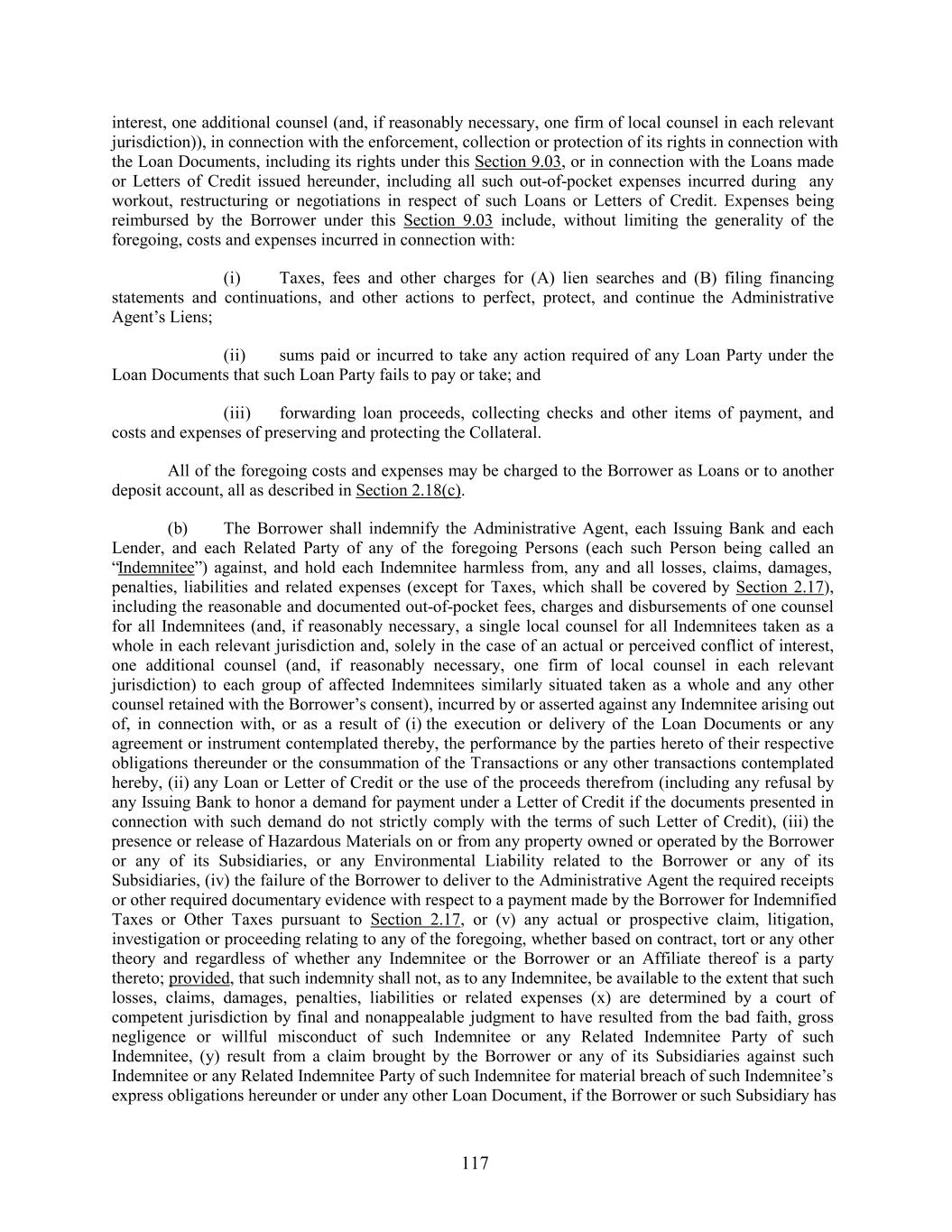 interest, one additional counsel (and, if reasonably necessary, one firm of local counsel in each relevant jurisdiction)), in connection with the enforcement, collection or protection of its rights in connection with the Loan Documents, including its rights under this Section 9.03, or in connection with the Loans made or Letters of Credit issued hereunder, including all such out-of-pocket expenses incurred during any workout, restructuring or negotiations in respect of such Loans or Letters of Credit. Expenses being reimbursed by the Borrower under this Section 9.03 include, without limiting the generality of the foregoing, costs and expenses incurred in connection with: (i) Taxes, fees and other charges for (A) lien searches and (B) filing financing statements and continuations, and other actions to perfect, protect, and continue the Administrative Agent’s Liens; (ii) sums paid or incurred to take any action required of any Loan Party under the Loan Documents that such Loan Party fails to pay or take; and (iii) forwarding loan proceeds, collecting checks and other items of payment, and costs and expenses of preserving and protecting the Collateral. All of the foregoing costs and expenses may be charged to the Borrower as Loans or to another deposit account, all as described in Section 2.18(c). (b) The Borrower shall indemnify the Administrative Agent, each Issuing Bank and each Lender, and each Related Party of any of the foregoing Persons (each such Person being called an “Indemnitee”) against, and hold each Indemnitee harmless from, any and all losses, claims, damages, penalties, liabilities and related expenses (except for Taxes, which shall be covered by Section 2.17), including the reasonable and documented out-of-pocket fees, charges and disbursements of one counsel for all Indemnitees (and, if reasonably necessary, a single local counsel for all Indemnitees taken as a whole in each relevant jurisdiction and, solely in the case of an actual or perceived conflict of interest, one additional counsel (and, if reasonably necessary, one firm of local counsel in each relevant jurisdiction) to each group of affected Indemnitees similarly situated taken as a whole and any other counsel retained with the Borrower’s consent), incurred by or asserted against any Indemnitee arising out of, in connection with, or as a result of (i) the execution or delivery of the Loan Documents or any agreement or instrument contemplated thereby, the performance by the parties hereto of their respective obligations thereunder or the consummation of the Transactions or any other transactions contemplated hereby, (ii) any Loan or Letter of Credit or the use of the proceeds therefrom (including any refusal by any Issuing Bank to honor a demand for payment under a Letter of Credit if the documents presented in connection with such demand do not strictly comply with the terms of such Letter of Credit), (iii) the presence or release of Hazardous Materials on or from any property owned or operated by the Borrower or any of its Subsidiaries, or any Environmental Liability related to the Borrower or any of its Subsidiaries, (iv) the failure of the Borrower to deliver to the Administrative Agent the required receipts or other required documentary evidence with respect to a payment made by the Borrower for Indemnified Taxes or Other Taxes pursuant to Section 2.17, or (v) any actual or prospective claim, litigation, investigation or proceeding relating to any of the foregoing, whether based on contract, tort or any other theory and regardless of whether any Indemnitee or the Borrower or an Affiliate thereof is a party thereto; provided, that such indemnity shall not, as to any Indemnitee, be available to the extent that such losses, claims, damages, penalties, liabilities or related expenses (x) are determined by a court of competent jurisdiction by final and nonappealable judgment to have resulted from the bad faith, gross negligence or willful misconduct of such Indemnitee or any Related Indemnitee Party of such Indemnitee, (y) result from a claim brought by the Borrower or any of its Subsidiaries against such Indemnitee or any Related Indemnitee Party of such Indemnitee for material breach of such Indemnitee’s express obligations hereunder or under any other Loan Document, if the Borrower or such Subsidiary has 117