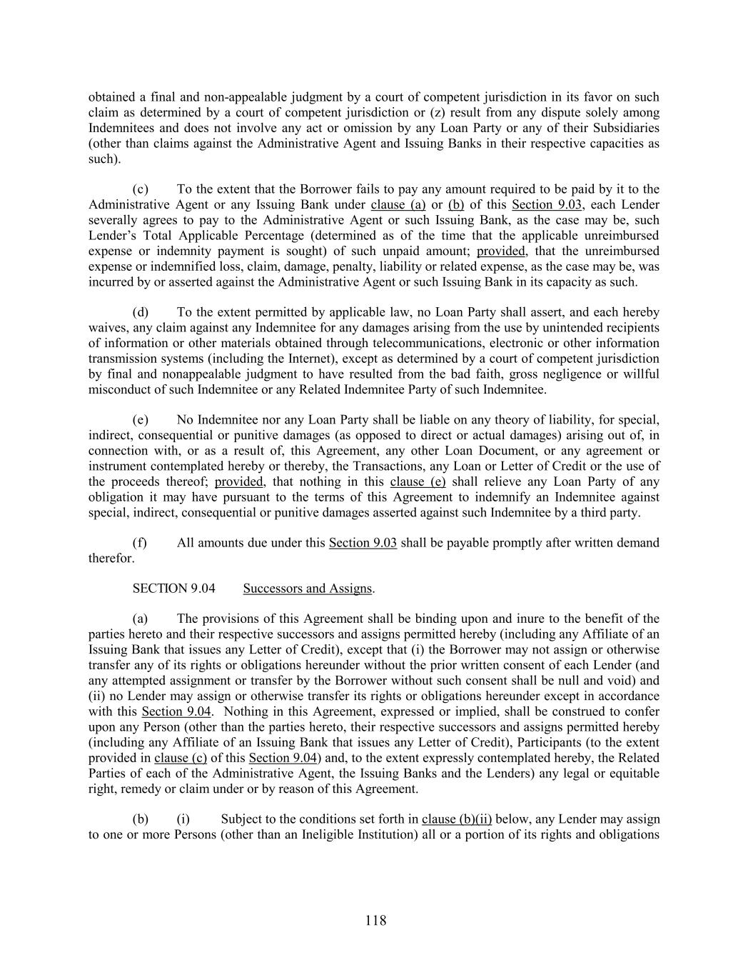 obtained a final and non-appealable judgment by a court of competent jurisdiction in its favor on such claim as determined by a court of competent jurisdiction or (z) result from any dispute solely among Indemnitees and does not involve any act or omission by any Loan Party or any of their Subsidiaries (other than claims against the Administrative Agent and Issuing Banks in their respective capacities as such). (c) To the extent that the Borrower fails to pay any amount required to be paid by it to the Administrative Agent or any Issuing Bank under clause (a) or (b) of this Section 9.03, each Lender severally agrees to pay to the Administrative Agent or such Issuing Bank, as the case may be, such Lender’s Total Applicable Percentage (determined as of the time that the applicable unreimbursed expense or indemnity payment is sought) of such unpaid amount; provided, that the unreimbursed expense or indemnified loss, claim, damage, penalty, liability or related expense, as the case may be, was incurred by or asserted against the Administrative Agent or such Issuing Bank in its capacity as such. (d) To the extent permitted by applicable law, no Loan Party shall assert, and each hereby waives, any claim against any Indemnitee for any damages arising from the use by unintended recipients of information or other materials obtained through telecommunications, electronic or other information transmission systems (including the Internet), except as determined by a court of competent jurisdiction by final and nonappealable judgment to have resulted from the bad faith, gross negligence or willful misconduct of such Indemnitee or any Related Indemnitee Party of such Indemnitee. (e) No Indemnitee nor any Loan Party shall be liable on any theory of liability, for special, indirect, consequential or punitive damages (as opposed to direct or actual damages) arising out of, in connection with, or as a result of, this Agreement, any other Loan Document, or any agreement or instrument contemplated hereby or thereby, the Transactions, any Loan or Letter of Credit or the use of the proceeds thereof; provided, that nothing in this clause (e) shall relieve any Loan Party of any obligation it may have pursuant to the terms of this Agreement to indemnify an Indemnitee against special, indirect, consequential or punitive damages asserted against such Indemnitee by a third party. (f) All amounts due under this Section 9.03 shall be payable promptly after written demand therefor. SECTION 9.04 Successors and Assigns. (a) The provisions of this Agreement shall be binding upon and inure to the benefit of the parties hereto and their respective successors and assigns permitted hereby (including any Affiliate of an Issuing Bank that issues any Letter of Credit), except that (i) the Borrower may not assign or otherwise transfer any of its rights or obligations hereunder without the prior written consent of each Lender (and any attempted assignment or transfer by the Borrower without such consent shall be null and void) and (ii) no Lender may assign or otherwise transfer its rights or obligations hereunder except in accordance with this Section 9.04. Nothing in this Agreement, expressed or implied, shall be construed to confer upon any Person (other than the parties hereto, their respective successors and assigns permitted hereby (including any Affiliate of an Issuing Bank that issues any Letter of Credit), Participants (to the extent provided in clause (c) of this Section 9.04) and, to the extent expressly contemplated hereby, the Related Parties of each of the Administrative Agent, the Issuing Banks and the Lenders) any legal or equitable right, remedy or claim under or by reason of this Agreement. (b) (i) Subject to the conditions set forth in clause (b)(ii) below, any Lender may assign to one or more Persons (other than an Ineligible Institution) all or a portion of its rights and obligations 118