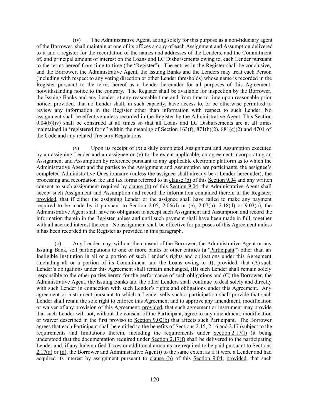 (iv) The Administrative Agent, acting solely for this purpose as a non-fiduciary agent of the Borrower, shall maintain at one of its offices a copy of each Assignment and Assumption delivered to it and a register for the recordation of the names and addresses of the Lenders, and the Commitment of, and principal amount of interest on the Loans and LC Disbursements owing to, each Lender pursuant to the terms hereof from time to time (the “Register”). The entries in the Register shall be conclusive, and the Borrower, the Administrative Agent, the Issuing Banks and the Lenders may treat each Person (including with respect to any voting direction or other Lender thresholds) whose name is recorded in the Register pursuant to the terms hereof as a Lender hereunder for all purposes of this Agreement, notwithstanding notice to the contrary. The Register shall be available for inspection by the Borrower, the Issuing Banks and any Lender, at any reasonable time and from time to time upon reasonable prior notice; provided, that no Lender shall, in such capacity, have access to, or be otherwise permitted to review any information in the Register other than information with respect to such Lender. No assignment shall be effective unless recorded in the Register by the Administrative Agent. This Section 9.04(b)(iv) shall be construed at all times so that all Loans and LC Disbursements are at all times maintained in “registered form” within the meaning of Section 163(f), 871(h)(2), 881(c)(2) and 4701 of the Code and any related Treasury Regulations. (v) Upon its receipt of (x) a duly completed Assignment and Assumption executed by an assigning Lender and an assignee or (y) to the extent applicable, an agreement incorporating an Assignment and Assumption by reference pursuant to any applicable electronic platform as to which the Administrative Agent and the parties to the Assignment and Assumption are participants, the assignee’s completed Administrative Questionnaire (unless the assignee shall already be a Lender hereunder), the processing and recordation fee and tax forms referred to in clause (b) of this Section 9.04 and any written consent to such assignment required by clause (b) of this Section 9.04, the Administrative Agent shall accept such Assignment and Assumption and record the information contained therein in the Register; provided, that if either the assigning Lender or the assignee shall have failed to make any payment required to be made by it pursuant to Section 2.05, 2.06(d) or (e), 2.07(b), 2.18(d) or 9.03(c), the Administrative Agent shall have no obligation to accept such Assignment and Assumption and record the information therein in the Register unless and until such payment shall have been made in full, together with all accrued interest thereon. No assignment shall be effective for purposes of this Agreement unless it has been recorded in the Register as provided in this paragraph. (c) Any Lender may, without the consent of the Borrower, the Administrative Agent or any Issuing Bank, sell participations to one or more banks or other entities (a “Participant”) other than an Ineligible Institution in all or a portion of such Lender’s rights and obligations under this Agreement (including all or a portion of its Commitment and the Loans owing to it); provided, that (A) such Lender’s obligations under this Agreement shall remain unchanged, (B) such Lender shall remain solely responsible to the other parties hereto for the performance of such obligations and (C) the Borrower, the Administrative Agent, the Issuing Banks and the other Lenders shall continue to deal solely and directly with such Lender in connection with such Lender’s rights and obligations under this Agreement. Any agreement or instrument pursuant to which a Lender sells such a participation shall provide that such Lender shall retain the sole right to enforce this Agreement and to approve any amendment, modification or waiver of any provision of this Agreement; provided, that such agreement or instrument may provide that such Lender will not, without the consent of the Participant, agree to any amendment, modification or waiver described in the first proviso to Section 9.02(b) that affects such Participant. The Borrower agrees that each Participant shall be entitled to the benefits of Sections 2.15, 2.16 and 2.17 (subject to the requirements and limitations therein, including the requirements under Section 2.17(f) (it being understood that the documentation required under Section 2.17(f) shall be delivered to the participating Lender and, if any Indemnified Taxes or additional amounts are required to be paid pursuant to Sections 2.17(a) or (d), the Borrower and Administrative Agent)) to the same extent as if it were a Lender and had acquired its interest by assignment pursuant to clause (b) of this Section 9.04; provided, that such 120