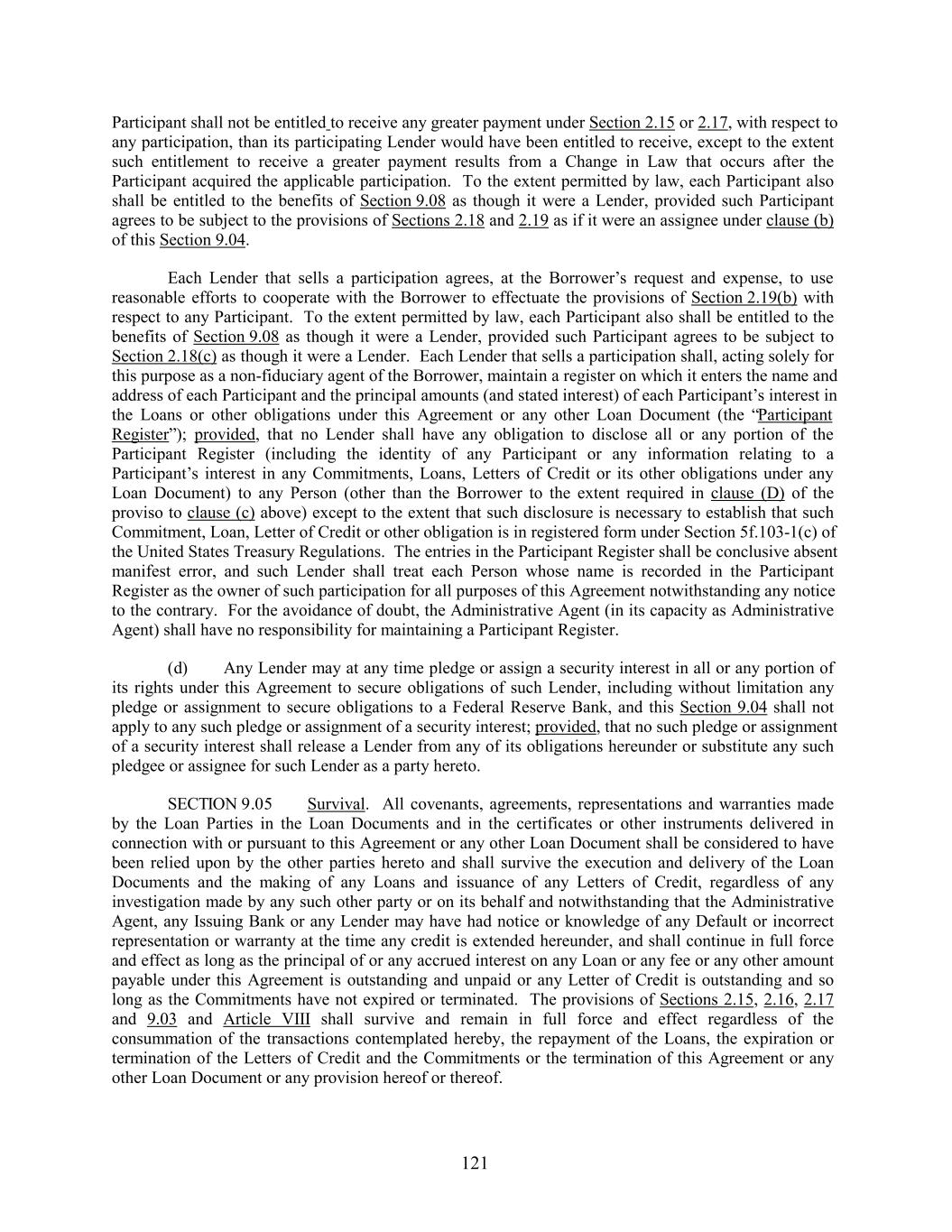 Participant shall not be entitled to receive any greater payment under Section 2.15 or 2.17, with respect to any participation, than its participating Lender would have been entitled to receive, except to the extent such entitlement to receive a greater payment results from a Change in Law that occurs after the Participant acquired the applicable participation. To the extent permitted by law, each Participant also shall be entitled to the benefits of Section 9.08 as though it were a Lender, provided such Participant agrees to be subject to the provisions of Sections 2.18 and 2.19 as if it were an assignee under clause (b) of this Section 9.04. Each Lender that sells a participation agrees, at the Borrower’s request and expense, to use reasonable efforts to cooperate with the Borrower to effectuate the provisions of Section 2.19(b) with respect to any Participant. To the extent permitted by law, each Participant also shall be entitled to the benefits of Section 9.08 as though it were a Lender, provided such Participant agrees to be subject to Section 2.18(c) as though it were a Lender. Each Lender that sells a participation shall, acting solely for this purpose as a non-fiduciary agent of the Borrower, maintain a register on which it enters the name and address of each Participant and the principal amounts (and stated interest) of each Participant’s interest in the Loans or other obligations under this Agreement or any other Loan Document (the “Participant Register”); provided, that no Lender shall have any obligation to disclose all or any portion of the Participant Register (including the identity of any Participant or any information relating to a Participant’s interest in any Commitments, Loans, Letters of Credit or its other obligations under any Loan Document) to any Person (other than the Borrower to the extent required in clause (D) of the proviso to clause (c) above) except to the extent that such disclosure is necessary to establish that such Commitment, Loan, Letter of Credit or other obligation is in registered form under Section 5f.103-1(c) of the United States Treasury Regulations. The entries in the Participant Register shall be conclusive absent manifest error, and such Lender shall treat each Person whose name is recorded in the Participant Register as the owner of such participation for all purposes of this Agreement notwithstanding any notice to the contrary. For the avoidance of doubt, the Administrative Agent (in its capacity as Administrative Agent) shall have no responsibility for maintaining a Participant Register. (d) Any Lender may at any time pledge or assign a security interest in all or any portion of its rights under this Agreement to secure obligations of such Lender, including without limitation any pledge or assignment to secure obligations to a Federal Reserve Bank, and this Section 9.04 shall not apply to any such pledge or assignment of a security interest; provided, that no such pledge or assignment of a security interest shall release a Lender from any of its obligations hereunder or substitute any such pledgee or assignee for such Lender as a party hereto. SECTION 9.05 Survival. All covenants, agreements, representations and warranties made by the Loan Parties in the Loan Documents and in the certificates or other instruments delivered in connection with or pursuant to this Agreement or any other Loan Document shall be considered to have been relied upon by the other parties hereto and shall survive the execution and delivery of the Loan Documents and the making of any Loans and issuance of any Letters of Credit, regardless of any investigation made by any such other party or on its behalf and notwithstanding that the Administrative Agent, any Issuing Bank or any Lender may have had notice or knowledge of any Default or incorrect representation or warranty at the time any credit is extended hereunder, and shall continue in full force and effect as long as the principal of or any accrued interest on any Loan or any fee or any other amount payable under this Agreement is outstanding and unpaid or any Letter of Credit is outstanding and so long as the Commitments have not expired or terminated. The provisions of Sections 2.15, 2.16, 2.17 and 9.03 and Article VIII shall survive and remain in full force and effect regardless of the consummation of the transactions contemplated hereby, the repayment of the Loans, the expiration or termination of the Letters of Credit and the Commitments or the termination of this Agreement or any other Loan Document or any provision hereof or thereof. 121