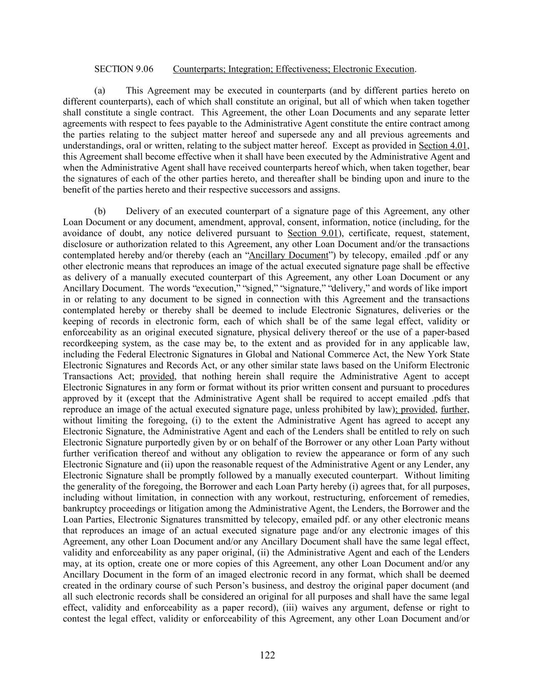 SECTION 9.06 Counterparts; Integration; Effectiveness; Electronic Execution. (a) This Agreement may be executed in counterparts (and by different parties hereto on different counterparts), each of which shall constitute an original, but all of which when taken together shall constitute a single contract. This Agreement, the other Loan Documents and any separate letter agreements with respect to fees payable to the Administrative Agent constitute the entire contract among the parties relating to the subject matter hereof and supersede any and all previous agreements and understandings, oral or written, relating to the subject matter hereof. Except as provided in Section 4.01, this Agreement shall become effective when it shall have been executed by the Administrative Agent and when the Administrative Agent shall have received counterparts hereof which, when taken together, bear the signatures of each of the other parties hereto, and thereafter shall be binding upon and inure to the benefit of the parties hereto and their respective successors and assigns. (b) Delivery of an executed counterpart of a signature page of this Agreement, any other Loan Document or any document, amendment, approval, consent, information, notice (including, for the avoidance of doubt, any notice delivered pursuant to Section 9.01), certificate, request, statement, disclosure or authorization related to this Agreement, any other Loan Document and/or the transactions contemplated hereby and/or thereby (each an “Ancillary Document”) by telecopy, emailed .pdf or any other electronic means that reproduces an image of the actual executed signature page shall be effective as delivery of a manually executed counterpart of this Agreement, any other Loan Document or any Ancillary Document. The words “execution,” “signed,” “signature,” “delivery,” and words of like import in or relating to any document to be signed in connection with this Agreement and the transactions contemplated hereby or thereby shall be deemed to include Electronic Signatures, deliveries or the keeping of records in electronic form, each of which shall be of the same legal effect, validity or enforceability as an original executed signature, physical delivery thereof or the use of a paper-based recordkeeping system, as the case may be, to the extent and as provided for in any applicable law, including the Federal Electronic Signatures in Global and National Commerce Act, the New York State Electronic Signatures and Records Act, or any other similar state laws based on the Uniform Electronic Transactions Act; provided, that nothing herein shall require the Administrative Agent to accept Electronic Signatures in any form or format without its prior written consent and pursuant to procedures approved by it (except that the Administrative Agent shall be required to accept emailed .pdfs that reproduce an image of the actual executed signature page, unless prohibited by law); provided, further, without limiting the foregoing, (i) to the extent the Administrative Agent has agreed to accept any Electronic Signature, the Administrative Agent and each of the Lenders shall be entitled to rely on such Electronic Signature purportedly given by or on behalf of the Borrower or any other Loan Party without further verification thereof and without any obligation to review the appearance or form of any such Electronic Signature and (ii) upon the reasonable request of the Administrative Agent or any Lender, any Electronic Signature shall be promptly followed by a manually executed counterpart. Without limiting the generality of the foregoing, the Borrower and each Loan Party hereby (i) agrees that, for all purposes, including without limitation, in connection with any workout, restructuring, enforcement of remedies, bankruptcy proceedings or litigation among the Administrative Agent, the Lenders, the Borrower and the Loan Parties, Electronic Signatures transmitted by telecopy, emailed pdf. or any other electronic means that reproduces an image of an actual executed signature page and/or any electronic images of this Agreement, any other Loan Document and/or any Ancillary Document shall have the same legal effect, validity and enforceability as any paper original, (ii) the Administrative Agent and each of the Lenders may, at its option, create one or more copies of this Agreement, any other Loan Document and/or any Ancillary Document in the form of an imaged electronic record in any format, which shall be deemed created in the ordinary course of such Person’s business, and destroy the original paper document (and all such electronic records shall be considered an original for all purposes and shall have the same legal effect, validity and enforceability as a paper record), (iii) waives any argument, defense or right to contest the legal effect, validity or enforceability of this Agreement, any other Loan Document and/or 122