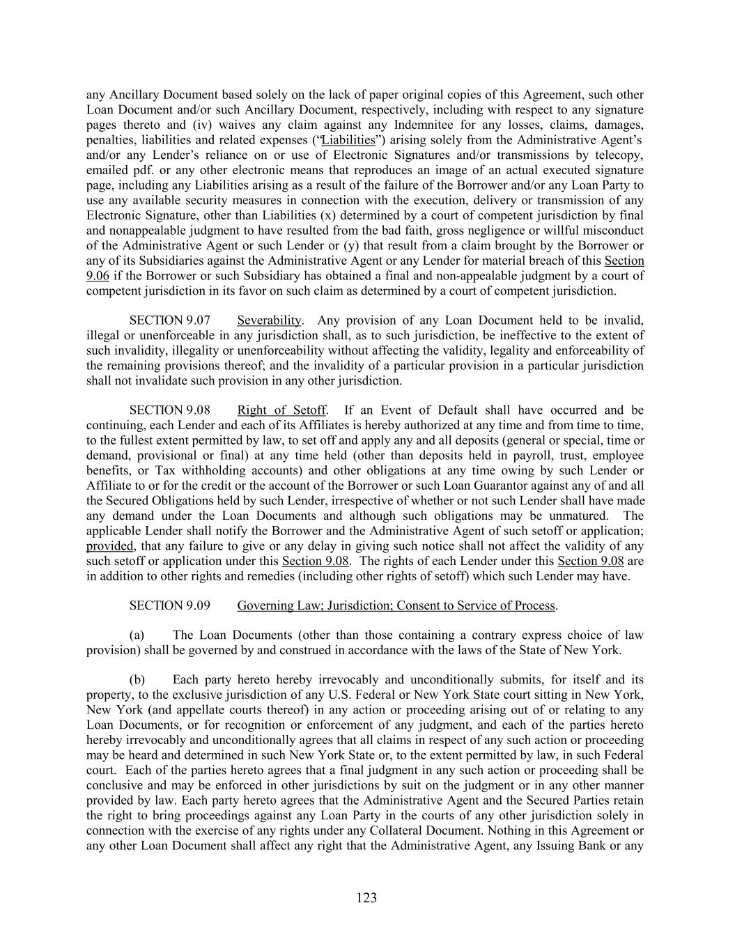 any Ancillary Document based solely on the lack of paper original copies of this Agreement, such other Loan Document and/or such Ancillary Document, respectively, including with respect to any signature pages thereto and (iv) waives any claim against any Indemnitee for any losses, claims, damages, penalties, liabilities and related expenses (“Liabilities”) arising solely from the Administrative Agent’s and/or any Lender’s reliance on or use of Electronic Signatures and/or transmissions by telecopy, emailed pdf. or any other electronic means that reproduces an image of an actual executed signature page, including any Liabilities arising as a result of the failure of the Borrower and/or any Loan Party to use any available security measures in connection with the execution, delivery or transmission of any Electronic Signature, other than Liabilities (x) determined by a court of competent jurisdiction by final and nonappealable judgment to have resulted from the bad faith, gross negligence or willful misconduct of the Administrative Agent or such Lender or (y) that result from a claim brought by the Borrower or any of its Subsidiaries against the Administrative Agent or any Lender for material breach of this Section 9.06 if the Borrower or such Subsidiary has obtained a final and non-appealable judgment by a court of competent jurisdiction in its favor on such claim as determined by a court of competent jurisdiction. SECTION 9.07 Severability. Any provision of any Loan Document held to be invalid, illegal or unenforceable in any jurisdiction shall, as to such jurisdiction, be ineffective to the extent of such invalidity, illegality or unenforceability without affecting the validity, legality and enforceability of the remaining provisions thereof; and the invalidity of a particular provision in a particular jurisdiction shall not invalidate such provision in any other jurisdiction. SECTION 9.08 Right of Setoff. If an Event of Default shall have occurred and be continuing, each Lender and each of its Affiliates is hereby authorized at any time and from time to time, to the fullest extent permitted by law, to set off and apply any and all deposits (general or special, time or demand, provisional or final) at any time held (other than deposits held in payroll, trust, employee benefits, or Tax withholding accounts) and other obligations at any time owing by such Lender or Affiliate to or for the credit or the account of the Borrower or such Loan Guarantor against any of and all the Secured Obligations held by such Lender, irrespective of whether or not such Lender shall have made any demand under the Loan Documents and although such obligations may be unmatured. The applicable Lender shall notify the Borrower and the Administrative Agent of such setoff or application; provided, that any failure to give or any delay in giving such notice shall not affect the validity of any such setoff or application under this Section 9.08. The rights of each Lender under this Section 9.08 are in addition to other rights and remedies (including other rights of setoff) which such Lender may have. SECTION 9.09 Governing Law; Jurisdiction; Consent to Service of Process. (a) The Loan Documents (other than those containing a contrary express choice of law provision) shall be governed by and construed in accordance with the laws of the State of New York. (b) Each party hereto hereby irrevocably and unconditionally submits, for itself and its property, to the exclusive jurisdiction of any U.S. Federal or New York State court sitting in New York, New York (and appellate courts thereof) in any action or proceeding arising out of or relating to any Loan Documents, or for recognition or enforcement of any judgment, and each of the parties hereto hereby irrevocably and unconditionally agrees that all claims in respect of any such action or proceeding may be heard and determined in such New York State or, to the extent permitted by law, in such Federal court. Each of the parties hereto agrees that a final judgment in any such action or proceeding shall be conclusive and may be enforced in other jurisdictions by suit on the judgment or in any other manner provided by law. Each party hereto agrees that the Administrative Agent and the Secured Parties retain the right to bring proceedings against any Loan Party in the courts of any other jurisdiction solely in connection with the exercise of any rights under any Collateral Document. Nothing in this Agreement or any other Loan Document shall affect any right that the Administrative Agent, any Issuing Bank or any 123