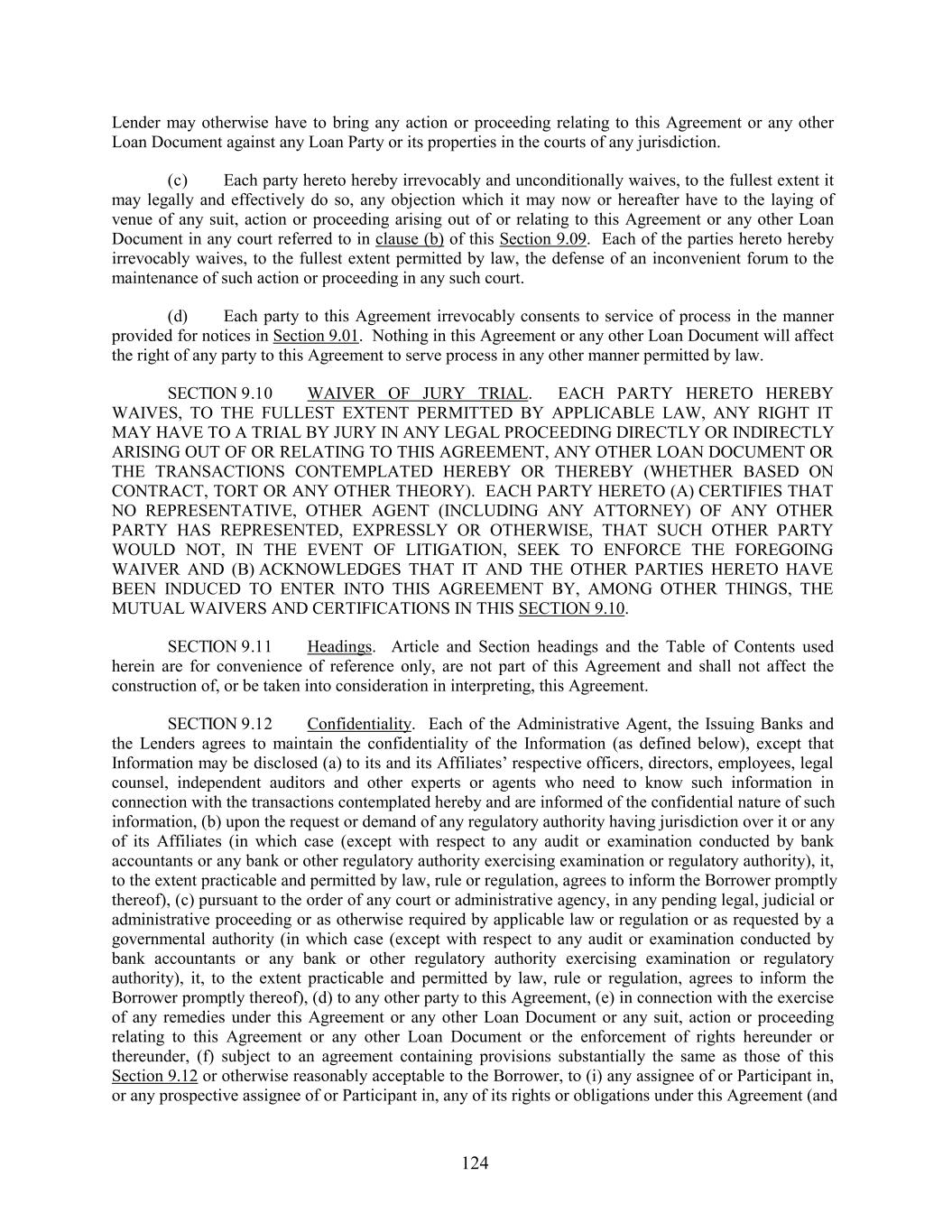 Lender may otherwise have to bring any action or proceeding relating to this Agreement or any other Loan Document against any Loan Party or its properties in the courts of any jurisdiction. (c) Each party hereto hereby irrevocably and unconditionally waives, to the fullest extent it may legally and effectively do so, any objection which it may now or hereafter have to the laying of venue of any suit, action or proceeding arising out of or relating to this Agreement or any other Loan Document in any court referred to in clause (b) of this Section 9.09. Each of the parties hereto hereby irrevocably waives, to the fullest extent permitted by law, the defense of an inconvenient forum to the maintenance of such action or proceeding in any such court. (d) Each party to this Agreement irrevocably consents to service of process in the manner provided for notices in Section 9.01. Nothing in this Agreement or any other Loan Document will affect the right of any party to this Agreement to serve process in any other manner permitted by law. SECTION 9.10 WAIVER OF JURY TRIAL. EACH PARTY HERETO HEREBY WAIVES, TO THE FULLEST EXTENT PERMITTED BY APPLICABLE LAW, ANY RIGHT IT MAY HAVE TO A TRIAL BY JURY IN ANY LEGAL PROCEEDING DIRECTLY OR INDIRECTLY ARISING OUT OF OR RELATING TO THIS AGREEMENT, ANY OTHER LOAN DOCUMENT OR THE TRANSACTIONS CONTEMPLATED HEREBY OR THEREBY (WHETHER BASED ON CONTRACT, TORT OR ANY OTHER THEORY). EACH PARTY HERETO (A) CERTIFIES THAT NO REPRESENTATIVE, OTHER AGENT (INCLUDING ANY ATTORNEY) OF ANY OTHER PARTY HAS REPRESENTED, EXPRESSLY OR OTHERWISE, THAT SUCH OTHER PARTY WOULD NOT, IN THE EVENT OF LITIGATION, SEEK TO ENFORCE THE FOREGOING WAIVER AND (B) ACKNOWLEDGES THAT IT AND THE OTHER PARTIES HERETO HAVE BEEN INDUCED TO ENTER INTO THIS AGREEMENT BY, AMONG OTHER THINGS, THE MUTUAL WAIVERS AND CERTIFICATIONS IN THIS SECTION 9.10. SECTION 9.11 Headings. Article and Section headings and the Table of Contents used herein are for convenience of reference only, are not part of this Agreement and shall not affect the construction of, or be taken into consideration in interpreting, this Agreement. SECTION 9.12 Confidentiality. Each of the Administrative Agent, the Issuing Banks and the Lenders agrees to maintain the confidentiality of the Information (as defined below), except that Information may be disclosed (a) to its and its Affiliates’ respective officers, directors, employees, legal counsel, independent auditors and other experts or agents who need to know such information in connection with the transactions contemplated hereby and are informed of the confidential nature of such information, (b) upon the request or demand of any regulatory authority having jurisdiction over it or any of its Affiliates (in which case (except with respect to any audit or examination conducted by bank accountants or any bank or other regulatory authority exercising examination or regulatory authority), it, to the extent practicable and permitted by law, rule or regulation, agrees to inform the Borrower promptly thereof), (c) pursuant to the order of any court or administrative agency, in any pending legal, judicial or administrative proceeding or as otherwise required by applicable law or regulation or as requested by a governmental authority (in which case (except with respect to any audit or examination conducted by bank accountants or any bank or other regulatory authority exercising examination or regulatory authority), it, to the extent practicable and permitted by law, rule or regulation, agrees to inform the Borrower promptly thereof), (d) to any other party to this Agreement, (e) in connection with the exercise of any remedies under this Agreement or any other Loan Document or any suit, action or proceeding relating to this Agreement or any other Loan Document or the enforcement of rights hereunder or thereunder, (f) subject to an agreement containing provisions substantially the same as those of this Section 9.12 or otherwise reasonably acceptable to the Borrower, to (i) any assignee of or Participant in, or any prospective assignee of or Participant in, any of its rights or obligations under this Agreement (and 124