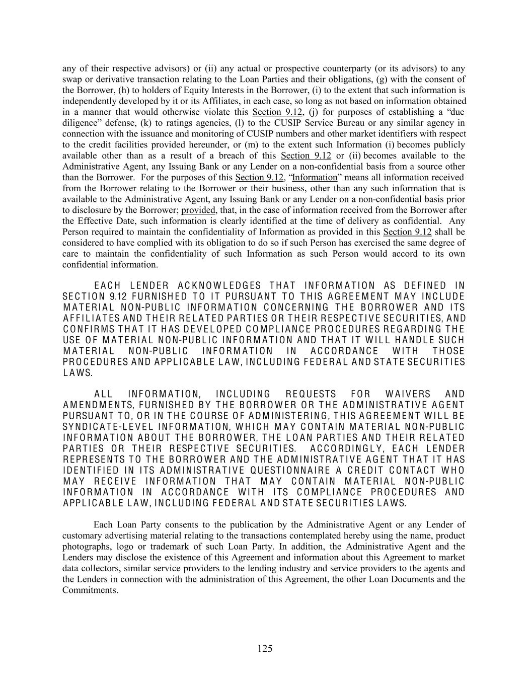 any of their respective advisors) or (ii) any actual or prospective counterparty (or its advisors) to any swap or derivative transaction relating to the Loan Parties and their obligations, (g) with the consent of the Borrower, (h) to holders of Equity Interests in the Borrower, (i) to the extent that such information is independently developed by it or its Affiliates, in each case, so long as not based on information obtained in a manner that would otherwise violate this Section 9.12, (j) for purposes of establishing a “due diligence” defense, (k) to ratings agencies, (l) to the CUSIP Service Bureau or any similar agency in connection with the issuance and monitoring of CUSIP numbers and other market identifiers with respect to the credit facilities provided hereunder, or (m) to the extent such Information (i) becomes publicly available other than as a result of a breach of this Section 9.12 or (ii) becomes available to the Administrative Agent, any Issuing Bank or any Lender on a non-confidential basis from a source other than the Borrower. For the purposes of this Section 9.12, “Information” means all information received from the Borrower relating to the Borrower or their business, other than any such information that is available to the Administrative Agent, any Issuing Bank or any Lender on a non-confidential basis prior to disclosure by the Borrower; provided, that, in the case of information received from the Borrower after the Effective Date, such information is clearly identified at the time of delivery as confidential. Any Person required to maintain the confidentiality of Information as provided in this Section 9.12 shall be considered to have complied with its obligation to do so if such Person has exercised the same degree of care to maintain the confidentiality of such Information as such Person would accord to its own confidential information. E A C H L E ND E R A C K N O W L E D G ES T H A T IN F O R M A T I O N AS D E F IN E D IN SE C T I O N 9.12 F URNISH E D T O I T PURSU A N T T O T H IS A G R E E M E N T M A Y IN C L UD E M A T E RI A L N O N-PUB L I C IN F O R M A T I O N C O N C E RNIN G T H E B O RR O W E R A ND I TS A F F I L I A T ES A ND T H E IR R E L A T E D PA R T I ES O R T H E IR R ESPE C T I V E SE C URI T I ES, A ND C O N F IR MS T H A T I T H AS D E V E L OPE D C O MPL I A N C E PR O C E DUR ES R E G A RDIN G T H E USE O F M A T E RI A L N O N-PUB L I C IN F O R M A T I O N A ND T H A T I T W I L L H A ND L E SU C H M A T E RI A L N O N-PUB L I C IN F O R M A T I O N IN A C C O RD A N C E W I T H T H OSE PR O C E DUR ES A ND APPL I C A B L E L A W , IN C L UDIN G F E D E R A L A ND ST A T E SE C URI T I ES L A WS. A L L IN F O R M A T I O N , IN C L UDIN G R E Q U ESTS F O R W A I V E RS A ND A M E ND M E N TS, F URNISH E D B Y T H E B O RR O W E R O R T H E A D M INIST R A T I V E A G E N T PURSU A N T T O , O R IN T H E C O URSE O F A D M INIST E RIN G , T H IS A G R E E M E N T W I L L B E SY NDI C A T E-L E V E L IN F O R M A T I O N , W H I C H M A Y C O N T A IN M A T E RI A L N O N-PUB L I C IN F O R M A T I O N A B O U T T H E B O RR O W E R , T H E L O A N PA R T I ES A ND T H E IR R E L A T E D PA R T I ES O R T H E IR R ESPE C T I V E SE C URI T I ES. A C C O RDIN G L Y , E A C H L E ND E R R EPR ESE N TS T O T H E B O RR O W E R A ND T H E A D M INIST R A T I V E A G E N T T H A T I T H AS ID E N T I F I E D IN I TS A D M INIST R A T I V E Q U EST I O NN A IR E A C R E DI T C O N T A C T W H O M A Y R E C E I V E IN F O R M A T I O N T H A T M A Y C O N T A IN M A T E RI A L N O N-PUB L I C IN F O R M A T I O N IN A C C O RD A N C E W I T H I TS C O MPL I A N C E PR O C E DUR ES A ND APPL I C A B L E L A W , IN C L UDIN G F E D E R A L A ND ST A T E SE C URI T I ES L A WS. Each Loan Party consents to the publication by the Administrative Agent or any Lender of customary advertising material relating to the transactions contemplated hereby using the name, product photographs, logo or trademark of such Loan Party. In addition, the Administrative Agent and the Lenders may disclose the existence of this Agreement and information about this Agreement to market data collectors, similar service providers to the lending industry and service providers to the agents and the Lenders in connection with the administration of this Agreement, the other Loan Documents and the Commitments. 125