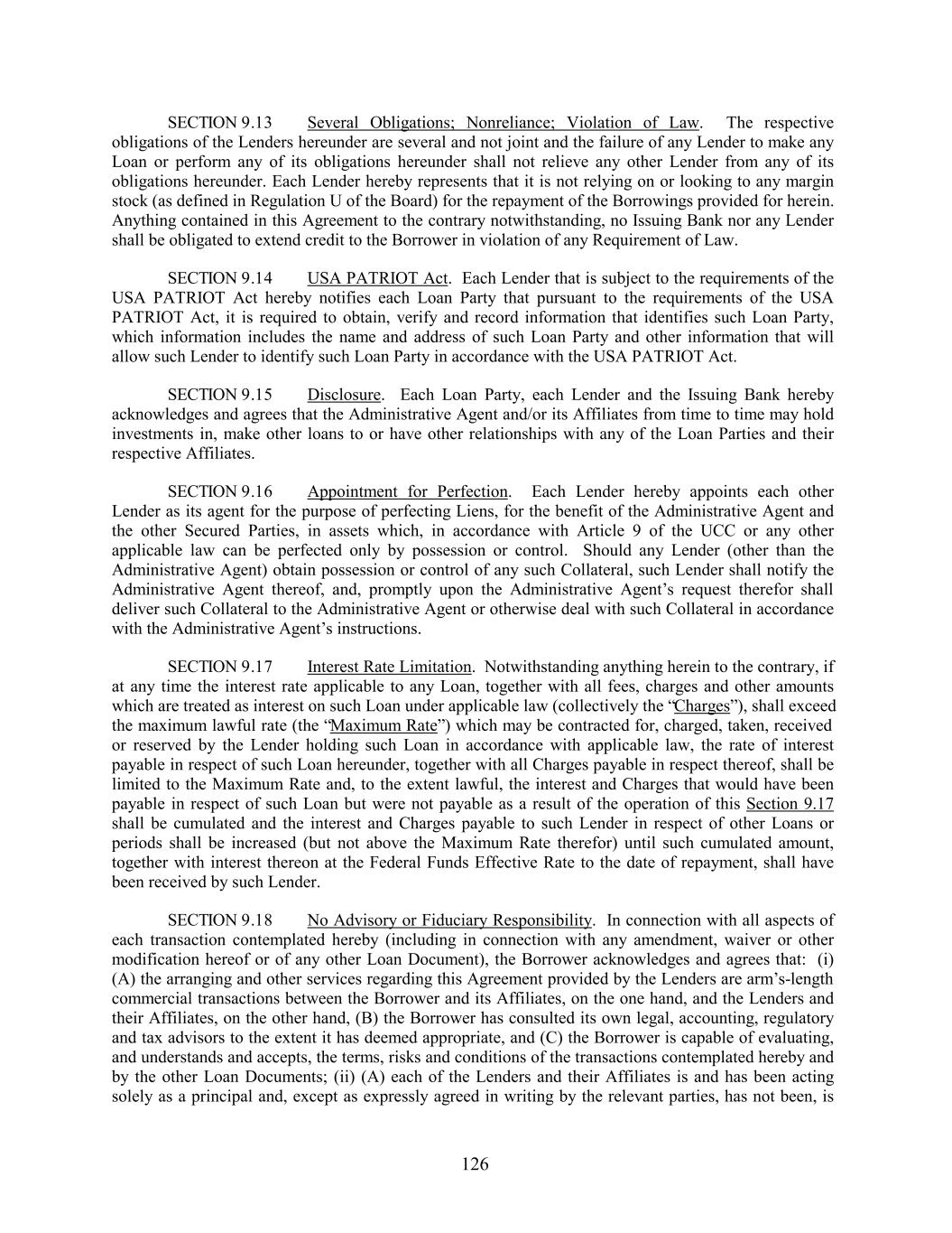 SECTION 9.13 Several Obligations; Nonreliance; Violation of Law. The respective obligations of the Lenders hereunder are several and not joint and the failure of any Lender to make any Loan or perform any of its obligations hereunder shall not relieve any other Lender from any of its obligations hereunder. Each Lender hereby represents that it is not relying on or looking to any margin stock (as defined in Regulation U of the Board) for the repayment of the Borrowings provided for herein. Anything contained in this Agreement to the contrary notwithstanding, no Issuing Bank nor any Lender shall be obligated to extend credit to the Borrower in violation of any Requirement of Law. SECTION 9.14 USA PATRIOT Act. Each Lender that is subject to the requirements of the USA PATRIOT Act hereby notifies each Loan Party that pursuant to the requirements of the USA PATRIOT Act, it is required to obtain, verify and record information that identifies such Loan Party, which information includes the name and address of such Loan Party and other information that will allow such Lender to identify such Loan Party in accordance with the USA PATRIOT Act. SECTION 9.15 Disclosure. Each Loan Party, each Lender and the Issuing Bank hereby acknowledges and agrees that the Administrative Agent and/or its Affiliates from time to time may hold investments in, make other loans to or have other relationships with any of the Loan Parties and their respective Affiliates. SECTION 9.16 Appointment for Perfection. Each Lender hereby appoints each other Lender as its agent for the purpose of perfecting Liens, for the benefit of the Administrative Agent and the other Secured Parties, in assets which, in accordance with Article 9 of the UCC or any other applicable law can be perfected only by possession or control. Should any Lender (other than the Administrative Agent) obtain possession or control of any such Collateral, such Lender shall notify the Administrative Agent thereof, and, promptly upon the Administrative Agent’s request therefor shall deliver such Collateral to the Administrative Agent or otherwise deal with such Collateral in accordance with the Administrative Agent’s instructions. SECTION 9.17 Interest Rate Limitation. Notwithstanding anything herein to the contrary, if at any time the interest rate applicable to any Loan, together with all fees, charges and other amounts which are treated as interest on such Loan under applicable law (collectively the “Charges”), shall exceed the maximum lawful rate (the “Maximum Rate”) which may be contracted for, charged, taken, received or reserved by the Lender holding such Loan in accordance with applicable law, the rate of interest payable in respect of such Loan hereunder, together with all Charges payable in respect thereof, shall be limited to the Maximum Rate and, to the extent lawful, the interest and Charges that would have been payable in respect of such Loan but were not payable as a result of the operation of this Section 9.17 shall be cumulated and the interest and Charges payable to such Lender in respect of other Loans or periods shall be increased (but not above the Maximum Rate therefor) until such cumulated amount, together with interest thereon at the Federal Funds Effective Rate to the date of repayment, shall have been received by such Lender. SECTION 9.18 No Advisory or Fiduciary Responsibility. In connection with all aspects of each transaction contemplated hereby (including in connection with any amendment, waiver or other modification hereof or of any other Loan Document), the Borrower acknowledges and agrees that: (i) (A) the arranging and other services regarding this Agreement provided by the Lenders are arm’s-length commercial transactions between the Borrower and its Affiliates, on the one hand, and the Lenders and their Affiliates, on the other hand, (B) the Borrower has consulted its own legal, accounting, regulatory and tax advisors to the extent it has deemed appropriate, and (C) the Borrower is capable of evaluating, and understands and accepts, the terms, risks and conditions of the transactions contemplated hereby and by the other Loan Documents; (ii) (A) each of the Lenders and their Affiliates is and has been acting solely as a principal and, except as expressly agreed in writing by the relevant parties, has not been, is 126