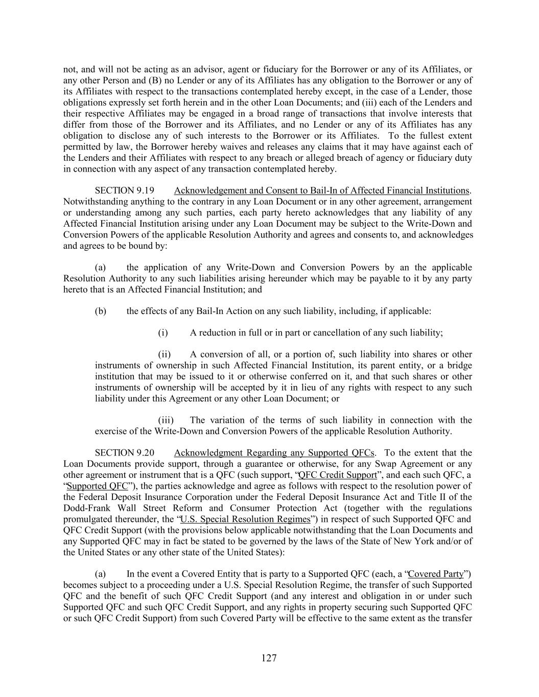 not, and will not be acting as an advisor, agent or fiduciary for the Borrower or any of its Affiliates, or any other Person and (B) no Lender or any of its Affiliates has any obligation to the Borrower or any of its Affiliates with respect to the transactions contemplated hereby except, in the case of a Lender, those obligations expressly set forth herein and in the other Loan Documents; and (iii) each of the Lenders and their respective Affiliates may be engaged in a broad range of transactions that involve interests that differ from those of the Borrower and its Affiliates, and no Lender or any of its Affiliates has any obligation to disclose any of such interests to the Borrower or its Affiliates. To the fullest extent permitted by law, the Borrower hereby waives and releases any claims that it may have against each of the Lenders and their Affiliates with respect to any breach or alleged breach of agency or fiduciary duty in connection with any aspect of any transaction contemplated hereby. SECTION 9.19 Acknowledgement and Consent to Bail-In of Affected Financial Institutions. Notwithstanding anything to the contrary in any Loan Document or in any other agreement, arrangement or understanding among any such parties, each party hereto acknowledges that any liability of any Affected Financial Institution arising under any Loan Document may be subject to the Write-Down and Conversion Powers of the applicable Resolution Authority and agrees and consents to, and acknowledges and agrees to be bound by: (a) the application of any Write-Down and Conversion Powers by an the applicable Resolution Authority to any such liabilities arising hereunder which may be payable to it by any party hereto that is an Affected Financial Institution; and (b) the effects of any Bail-In Action on any such liability, including, if applicable: (i) A reduction in full or in part or cancellation of any such liability; (ii) A conversion of all, or a portion of, such liability into shares or other instruments of ownership in such Affected Financial Institution, its parent entity, or a bridge institution that may be issued to it or otherwise conferred on it, and that such shares or other instruments of ownership will be accepted by it in lieu of any rights with respect to any such liability under this Agreement or any other Loan Document; or (iii) The variation of the terms of such liability in connection with the exercise of the Write-Down and Conversion Powers of the applicable Resolution Authority. SECTION 9.20 Acknowledgment Regarding any Supported QFCs. To the extent that the Loan Documents provide support, through a guarantee or otherwise, for any Swap Agreement or any other agreement or instrument that is a QFC (such support, “QFC Credit Support”, and each such QFC, a “Supported QFC”), the parties acknowledge and agree as follows with respect to the resolution power of the Federal Deposit Insurance Corporation under the Federal Deposit Insurance Act and Title II of the Dodd-Frank Wall Street Reform and Consumer Protection Act (together with the regulations promulgated thereunder, the “U.S. Special Resolution Regimes”) in respect of such Supported QFC and QFC Credit Support (with the provisions below applicable notwithstanding that the Loan Documents and any Supported QFC may in fact be stated to be governed by the laws of the State of New York and/or of the United States or any other state of the United States): (a) In the event a Covered Entity that is party to a Supported QFC (each, a “Covered Party”) becomes subject to a proceeding under a U.S. Special Resolution Regime, the transfer of such Supported QFC and the benefit of such QFC Credit Support (and any interest and obligation in or under such Supported QFC and such QFC Credit Support, and any rights in property securing such Supported QFC or such QFC Credit Support) from such Covered Party will be effective to the same extent as the transfer 127