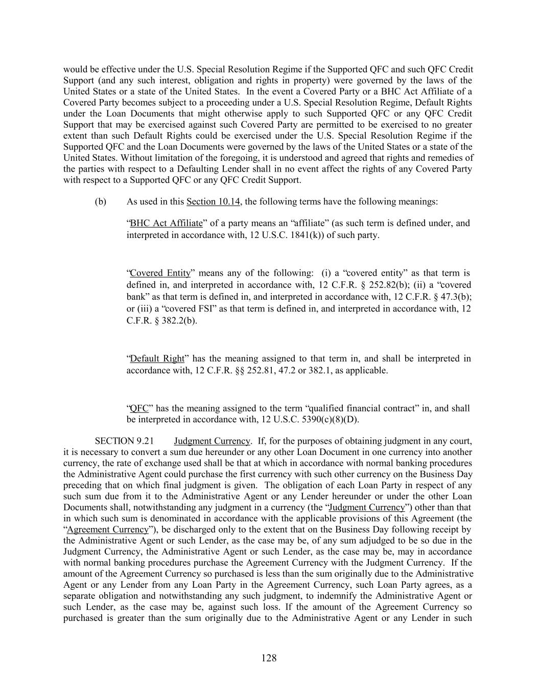 would be effective under the U.S. Special Resolution Regime if the Supported QFC and such QFC Credit Support (and any such interest, obligation and rights in property) were governed by the laws of the United States or a state of the United States. In the event a Covered Party or a BHC Act Affiliate of a Covered Party becomes subject to a proceeding under a U.S. Special Resolution Regime, Default Rights under the Loan Documents that might otherwise apply to such Supported QFC or any QFC Credit Support that may be exercised against such Covered Party are permitted to be exercised to no greater extent than such Default Rights could be exercised under the U.S. Special Resolution Regime if the Supported QFC and the Loan Documents were governed by the laws of the United States or a state of the United States. Without limitation of the foregoing, it is understood and agreed that rights and remedies of the parties with respect to a Defaulting Lender shall in no event affect the rights of any Covered Party with respect to a Supported QFC or any QFC Credit Support. (b) As used in this Section 10.14, the following terms have the following meanings: “BHC Act Affiliate” of a party means an “affiliate” (as such term is defined under, and interpreted in accordance with, 12 U.S.C. 1841(k)) of such party. “Covered Entity” means any of the following: (i) a “covered entity” as that term is defined in, and interpreted in accordance with, 12 C.F.R. § 252.82(b); (ii) a “covered bank” as that term is defined in, and interpreted in accordance with, 12 C.F.R. § 47.3(b); or (iii) a “covered FSI” as that term is defined in, and interpreted in accordance with, 12 C.F.R. § 382.2(b). “Default Right” has the meaning assigned to that term in, and shall be interpreted in accordance with, 12 C.F.R. §§ 252.81, 47.2 or 382.1, as applicable. “QFC” has the meaning assigned to the term “qualified financial contract” in, and shall be interpreted in accordance with, 12 U.S.C. 5390(c)(8)(D). SECTION 9.21 Judgment Currency. If, for the purposes of obtaining judgment in any court, it is necessary to convert a sum due hereunder or any other Loan Document in one currency into another currency, the rate of exchange used shall be that at which in accordance with normal banking procedures the Administrative Agent could purchase the first currency with such other currency on the Business Day preceding that on which final judgment is given. The obligation of each Loan Party in respect of any such sum due from it to the Administrative Agent or any Lender hereunder or under the other Loan Documents shall, notwithstanding any judgment in a currency (the “Judgment Currency”) other than that in which such sum is denominated in accordance with the applicable provisions of this Agreement (the “Agreement Currency”), be discharged only to the extent that on the Business Day following receipt by the Administrative Agent or such Lender, as the case may be, of any sum adjudged to be so due in the Judgment Currency, the Administrative Agent or such Lender, as the case may be, may in accordance with normal banking procedures purchase the Agreement Currency with the Judgment Currency. If the amount of the Agreement Currency so purchased is less than the sum originally due to the Administrative Agent or any Lender from any Loan Party in the Agreement Currency, such Loan Party agrees, as a separate obligation and notwithstanding any such judgment, to indemnify the Administrative Agent or such Lender, as the case may be, against such loss. If the amount of the Agreement Currency so purchased is greater than the sum originally due to the Administrative Agent or any Lender in such 128