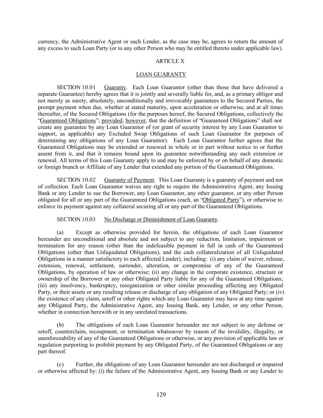 currency, the Administrative Agent or such Lender, as the case may be, agrees to return the amount of any excess to such Loan Party (or to any other Person who may be entitled thereto under applicable law). ARTICLE X LOAN GUARANTY SECTION 10.01 Guaranty. Each Loan Guarantor (other than those that have delivered a separate Guarantee) hereby agrees that it is jointly and severally liable for, and, as a primary obligor and not merely as surety, absolutely, unconditionally and irrevocably guarantees to the Secured Parties, the prompt payment when due, whether at stated maturity, upon acceleration or otherwise, and at all times thereafter, of the Secured Obligations (for the purposes hereof, the Secured Obligations, collectively the “Guaranteed Obligations”; provided, however, that the definition of “Guaranteed Obligations” shall not create any guarantee by any Loan Guarantor of (or grant of security interest by any Loan Guarantor to support, as applicable) any Excluded Swap Obligations of such Loan Guarantor for purposes of determining any obligations of any Loan Guarantor). Each Loan Guarantor further agrees that the Guaranteed Obligations may be extended or renewed in whole or in part without notice to or further assent from it, and that it remains bound upon its guarantee notwithstanding any such extension or renewal. All terms of this Loan Guaranty apply to and may be enforced by or on behalf of any domestic or foreign branch or Affiliate of any Lender that extended any portion of the Guaranteed Obligations. SECTION 10.02 Guaranty of Payment. This Loan Guaranty is a guaranty of payment and not of collection. Each Loan Guarantor waives any right to require the Administrative Agent, any Issuing Bank or any Lender to sue the Borrower, any Loan Guarantor, any other guarantor, or any other Person obligated for all or any part of the Guaranteed Obligations (each, an “Obligated Party”), or otherwise to enforce its payment against any collateral securing all or any part of the Guaranteed Obligations. SECTION 10.03 No Discharge or Diminishment of Loan Guaranty. (a) Except as otherwise provided for herein, the obligations of each Loan Guarantor hereunder are unconditional and absolute and not subject to any reduction, limitation, impairment or termination for any reason (other than the indefeasible payment in full in cash of the Guaranteed Obligations (other than Unliquidated Obligations), and the cash collateralization of all Unliquidated Obligations in a manner satisfactory to each affected Lender), including: (i) any claim of waiver, release, extension, renewal, settlement, surrender, alteration, or compromise of any of the Guaranteed Obligations, by operation of law or otherwise; (ii) any change in the corporate existence, structure or ownership of the Borrower or any other Obligated Party liable for any of the Guaranteed Obligations; (iii) any insolvency, bankruptcy, reorganization or other similar proceeding affecting any Obligated Party, or their assets or any resulting release or discharge of any obligation of any Obligated Party; or (iv) the existence of any claim, setoff or other rights which any Loan Guarantor may have at any time against any Obligated Party, the Administrative Agent, any Issuing Bank, any Lender, or any other Person, whether in connection herewith or in any unrelated transactions. (b) The obligations of each Loan Guarantor hereunder are not subject to any defense or setoff, counterclaim, recoupment, or termination whatsoever by reason of the invalidity, illegality, or unenforceability of any of the Guaranteed Obligations or otherwise, or any provision of applicable law or regulation purporting to prohibit payment by any Obligated Party, of the Guaranteed Obligations or any part thereof. (c) Further, the obligations of any Loan Guarantor hereunder are not discharged or impaired or otherwise affected by: (i) the failure of the Administrative Agent, any Issuing Bank or any Lender to 129