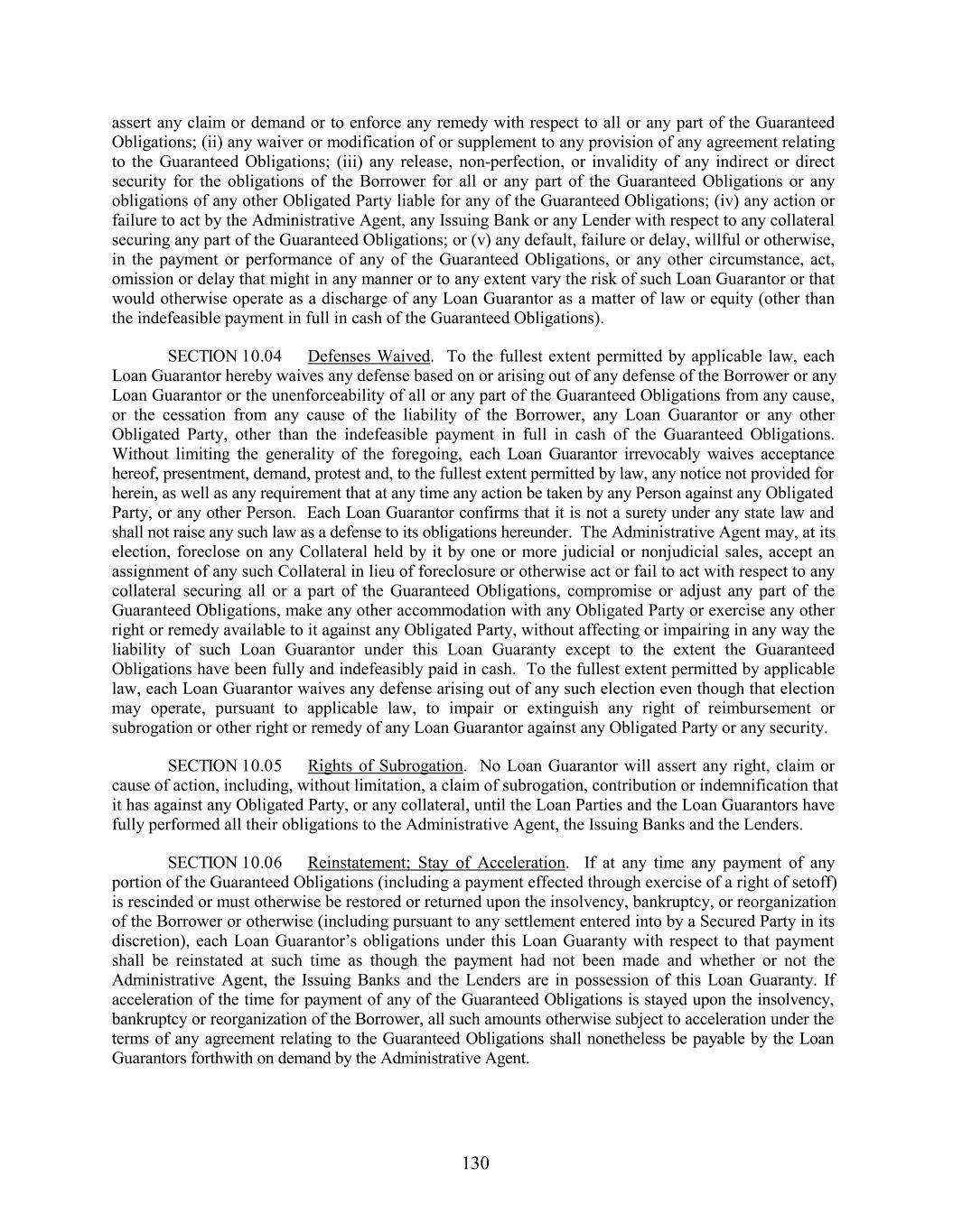 assert any claim or demand or to enforce any remedy with respect to all or any part of the Guaranteed Obligations; (ii) any waiver or modification of or supplement to any provision of any agreement relating to the Guaranteed Obligations; (iii) any release, non-perfection, or invalidity of any indirect or direct security for the obligations of the Borrower for all or any part of the Guaranteed Obligations or any obligations of any other Obligated Party liable for any of the Guaranteed Obligations; (iv) any action or failure to act by the Administrative Agent, any Issuing Bank or any Lender with respect to any collateral securing any part of the Guaranteed Obligations; or (v) any default, failure or delay, willful or otherwise, in the payment or performance of any of the Guaranteed Obligations, or any other circumstance, act, omission or delay that might in any manner or to any extent vary the risk of such Loan Guarantor or that would otherwise operate as a discharge of any Loan Guarantor as a matter of law or equity (other than the indefeasible payment in full in cash of the Guaranteed Obligations). SECTION 10.04 Defenses Waived. To the fullest extent permitted by applicable law, each Loan Guarantor hereby waives any defense based on or arising out of any defense of the Borrower or any Loan Guarantor or the unenforceability of all or any part of the Guaranteed Obligations from any cause, or the cessation from any cause of the liability of the Borrower, any Loan Guarantor or any other Obligated Party, other than the indefeasible payment in full in cash of the Guaranteed Obligations. Without limiting the generality of the foregoing, each Loan Guarantor irrevocably waives acceptance hereof, presentment, demand, protest and, to the fullest extent permitted by law, any notice not provided for herein, as well as any requirement that at any time any action be taken by any Person against any Obligated Party, or any other Person. Each Loan Guarantor confirms that it is not a surety under any state law and shall not raise any such law as a defense to its obligations hereunder. The Administrative Agent may, at its election, foreclose on any Collateral held by it by one or more judicial or nonjudicial sales, accept an assignment of any such Collateral in lieu of foreclosure or otherwise act or fail to act with respect to any collateral securing all or a part of the Guaranteed Obligations, compromise or adjust any part of the Guaranteed Obligations, make any other accommodation with any Obligated Party or exercise any other right or remedy available to it against any Obligated Party, without affecting or impairing in any way the liability of such Loan Guarantor under this Loan Guaranty except to the extent the Guaranteed Obligations have been fully and indefeasibly paid in cash. To the fullest extent permitted by applicable law, each Loan Guarantor waives any defense arising out of any such election even though that election may operate, pursuant to applicable law, to impair or extinguish any right of reimbursement or subrogation or other right or remedy of any Loan Guarantor against any Obligated Party or any security. SECTION 10.05 Rights of Subrogation. No Loan Guarantor will assert any right, claim or cause of action, including, without limitation, a claim of subrogation, contribution or indemnification that it has against any Obligated Party, or any collateral, until the Loan Parties and the Loan Guarantors have fully performed all their obligations to the Administrative Agent, the Issuing Banks and the Lenders. SECTION 10.06 Reinstatement; Stay of Acceleration. If at any time any payment of any portion of the Guaranteed Obligations (including a payment effected through exercise of a right of setoff) is rescinded or must otherwise be restored or returned upon the insolvency, bankruptcy, or reorganization of the Borrower or otherwise (including pursuant to any settlement entered into by a Secured Party in its discretion), each Loan Guarantor’s obligations under this Loan Guaranty with respect to that payment shall be reinstated at such time as though the payment had not been made and whether or not the Administrative Agent, the Issuing Banks and the Lenders are in possession of this Loan Guaranty. If acceleration of the time for payment of any of the Guaranteed Obligations is stayed upon the insolvency, bankruptcy or reorganization of the Borrower, all such amounts otherwise subject to acceleration under the terms of any agreement relating to the Guaranteed Obligations shall nonetheless be payable by the Loan Guarantors forthwith on demand by the Administrative Agent. 130