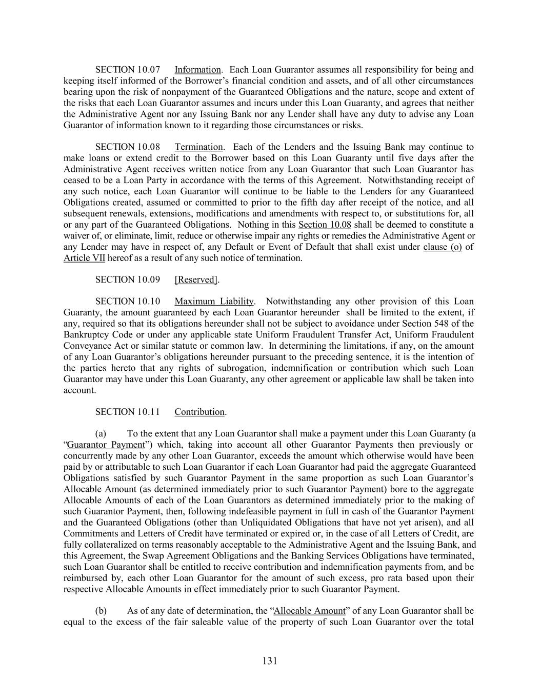 SECTION 10.07 Information. Each Loan Guarantor assumes all responsibility for being and keeping itself informed of the Borrower’s financial condition and assets, and of all other circumstances bearing upon the risk of nonpayment of the Guaranteed Obligations and the nature, scope and extent of the risks that each Loan Guarantor assumes and incurs under this Loan Guaranty, and agrees that neither the Administrative Agent nor any Issuing Bank nor any Lender shall have any duty to advise any Loan Guarantor of information known to it regarding those circumstances or risks. SECTION 10.08 Termination. Each of the Lenders and the Issuing Bank may continue to make loans or extend credit to the Borrower based on this Loan Guaranty until five days after the Administrative Agent receives written notice from any Loan Guarantor that such Loan Guarantor has ceased to be a Loan Party in accordance with the terms of this Agreement. Notwithstanding receipt of any such notice, each Loan Guarantor will continue to be liable to the Lenders for any Guaranteed Obligations created, assumed or committed to prior to the fifth day after receipt of the notice, and all subsequent renewals, extensions, modifications and amendments with respect to, or substitutions for, all or any part of the Guaranteed Obligations. Nothing in this Section 10.08 shall be deemed to constitute a waiver of, or eliminate, limit, reduce or otherwise impair any rights or remedies the Administrative Agent or any Lender may have in respect of, any Default or Event of Default that shall exist under clause (o) of Article VII hereof as a result of any such notice of termination. SECTION 10.09 [Reserved]. SECTION 10.10 Maximum Liability. Notwithstanding any other provision of this Loan Guaranty, the amount guaranteed by each Loan Guarantor hereunder shall be limited to the extent, if any, required so that its obligations hereunder shall not be subject to avoidance under Section 548 of the Bankruptcy Code or under any applicable state Uniform Fraudulent Transfer Act, Uniform Fraudulent Conveyance Act or similar statute or common law. In determining the limitations, if any, on the amount of any Loan Guarantor’s obligations hereunder pursuant to the preceding sentence, it is the intention of the parties hereto that any rights of subrogation, indemnification or contribution which such Loan Guarantor may have under this Loan Guaranty, any other agreement or applicable law shall be taken into account. SECTION 10.11 Contribution. (a) To the extent that any Loan Guarantor shall make a payment under this Loan Guaranty (a “Guarantor Payment”) which, taking into account all other Guarantor Payments then previously or concurrently made by any other Loan Guarantor, exceeds the amount which otherwise would have been paid by or attributable to such Loan Guarantor if each Loan Guarantor had paid the aggregate Guaranteed Obligations satisfied by such Guarantor Payment in the same proportion as such Loan Guarantor’s Allocable Amount (as determined immediately prior to such Guarantor Payment) bore to the aggregate Allocable Amounts of each of the Loan Guarantors as determined immediately prior to the making of such Guarantor Payment, then, following indefeasible payment in full in cash of the Guarantor Payment and the Guaranteed Obligations (other than Unliquidated Obligations that have not yet arisen), and all Commitments and Letters of Credit have terminated or expired or, in the case of all Letters of Credit, are fully collateralized on terms reasonably acceptable to the Administrative Agent and the Issuing Bank, and this Agreement, the Swap Agreement Obligations and the Banking Services Obligations have terminated, such Loan Guarantor shall be entitled to receive contribution and indemnification payments from, and be reimbursed by, each other Loan Guarantor for the amount of such excess, pro rata based upon their respective Allocable Amounts in effect immediately prior to such Guarantor Payment. (b) As of any date of determination, the “Allocable Amount” of any Loan Guarantor shall be equal to the excess of the fair saleable value of the property of such Loan Guarantor over the total 131