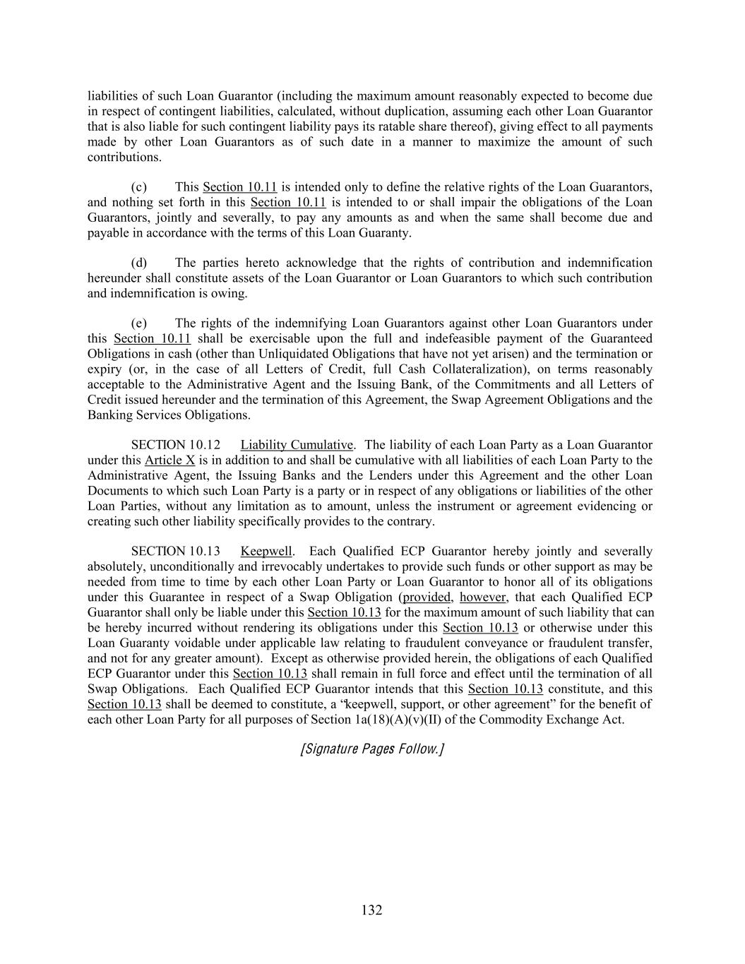 liabilities of such Loan Guarantor (including the maximum amount reasonably expected to become due in respect of contingent liabilities, calculated, without duplication, assuming each other Loan Guarantor that is also liable for such contingent liability pays its ratable share thereof), giving effect to all payments made by other Loan Guarantors as of such date in a manner to maximize the amount of such contributions. (c) This Section 10.11 is intended only to define the relative rights of the Loan Guarantors, and nothing set forth in this Section 10.11 is intended to or shall impair the obligations of the Loan Guarantors, jointly and severally, to pay any amounts as and when the same shall become due and payable in accordance with the terms of this Loan Guaranty. (d) The parties hereto acknowledge that the rights of contribution and indemnification hereunder shall constitute assets of the Loan Guarantor or Loan Guarantors to which such contribution and indemnification is owing. (e) The rights of the indemnifying Loan Guarantors against other Loan Guarantors under this Section 10.11 shall be exercisable upon the full and indefeasible payment of the Guaranteed Obligations in cash (other than Unliquidated Obligations that have not yet arisen) and the termination or expiry (or, in the case of all Letters of Credit, full Cash Collateralization), on terms reasonably acceptable to the Administrative Agent and the Issuing Bank, of the Commitments and all Letters of Credit issued hereunder and the termination of this Agreement, the Swap Agreement Obligations and the Banking Services Obligations. SECTION 10.12 Liability Cumulative. The liability of each Loan Party as a Loan Guarantor under this Article X is in addition to and shall be cumulative with all liabilities of each Loan Party to the Administrative Agent, the Issuing Banks and the Lenders under this Agreement and the other Loan Documents to which such Loan Party is a party or in respect of any obligations or liabilities of the other Loan Parties, without any limitation as to amount, unless the instrument or agreement evidencing or creating such other liability specifically provides to the contrary. SECTION 10.13 Keepwell. Each Qualified ECP Guarantor hereby jointly and severally absolutely, unconditionally and irrevocably undertakes to provide such funds or other support as may be needed from time to time by each other Loan Party or Loan Guarantor to honor all of its obligations under this Guarantee in respect of a Swap Obligation (provided, however, that each Qualified ECP Guarantor shall only be liable under this Section 10.13 for the maximum amount of such liability that can be hereby incurred without rendering its obligations under this Section 10.13 or otherwise under this Loan Guaranty voidable under applicable law relating to fraudulent conveyance or fraudulent transfer, and not for any greater amount). Except as otherwise provided herein, the obligations of each Qualified ECP Guarantor under this Section 10.13 shall remain in full force and effect until the termination of all Swap Obligations. Each Qualified ECP Guarantor intends that this Section 10.13 constitute, and this Section 10.13 shall be deemed to constitute, a “keepwell, support, or other agreement” for the benefit of each other Loan Party for all purposes of Section 1a(18)(A)(v)(II) of the Commodity Exchange Act. [Signature Pages Follow.] 132