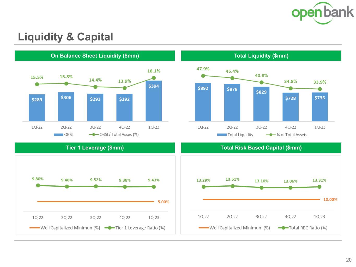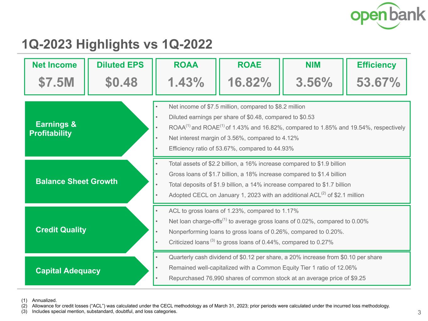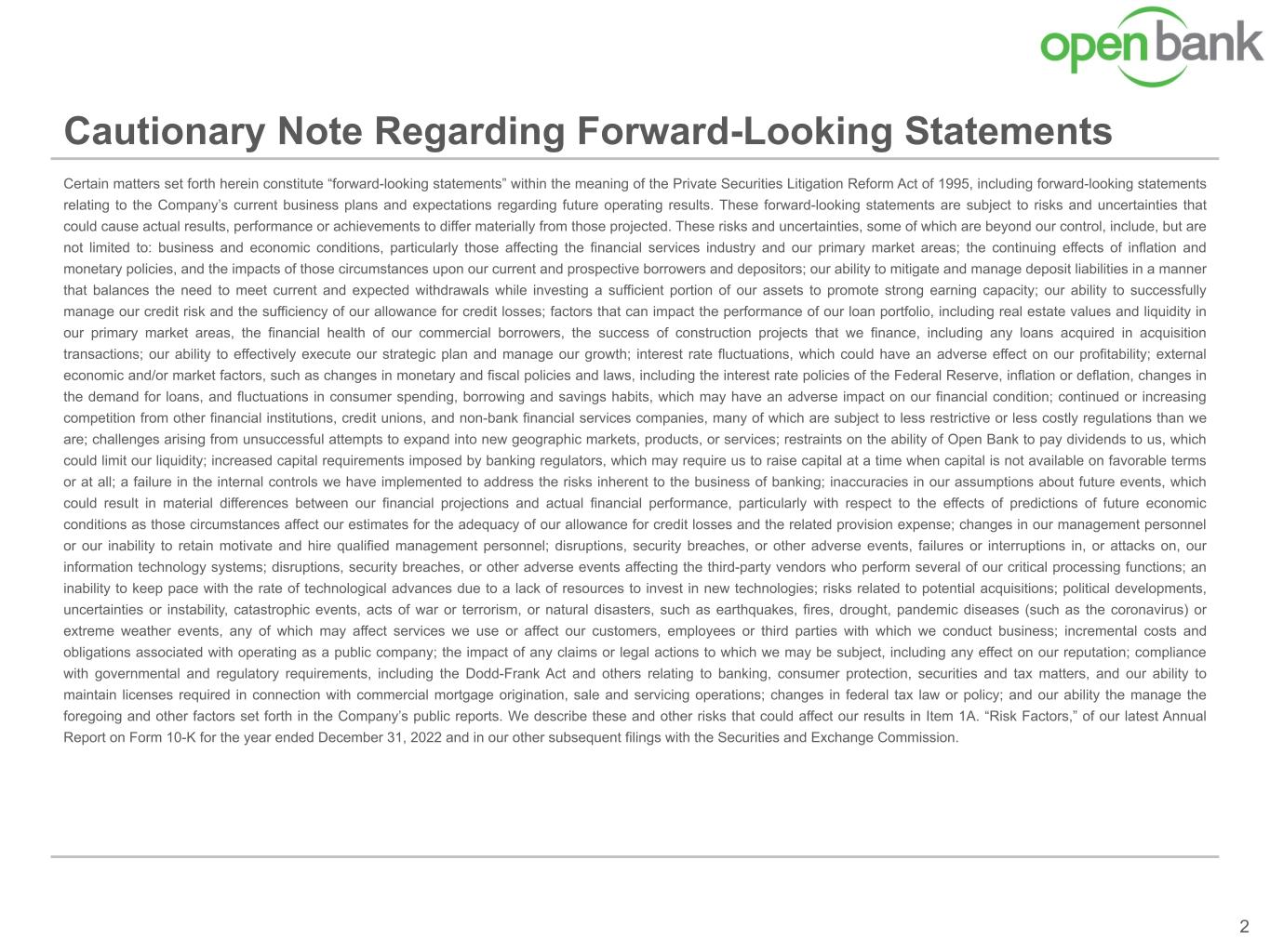 Certain matters set forth herein constitute “forward-looking statements” within the meaning of the Private Securities Litigation Reform Act of 1995, including forward-looking statements relating to the Company’s current business plans and expectations regarding future operating results. These forward-looking statements are subject to risks and uncertainties that could cause actual results, performance or achievements to differ materially from those projected. These risks and uncertainties, some of which are beyond our control, include, but are not limited to: business and economic conditions, particularly those affecting the financial services industry and our primary market areas; the continuing effects of inflation and monetary policies, and the impacts of those circumstances upon our current and prospective borrowers and depositors; our ability to mitigate and manage deposit liabilities in a manner that balances the need to meet current and expected withdrawals while investing a sufficient portion of our assets to promote strong earning capacity; our ability to successfully manage our credit risk and the sufficiency of our allowance for credit losses; factors that can impact the performance of our loan portfolio, including real estate values and liquidity in our primary market areas, the financial health of our commercial borrowers, the success of construction projects that we finance, including any loans acquired in acquisition transactions; our ability to effectively execute our strategic plan and manage our growth; interest rate fluctuations, which could have an adverse effect on our profitability; external economic and/or market factors, such as changes in monetary and fiscal policies and laws, including the interest rate policies of the Federal Reserve, inflation or deflation, changes in the demand for loans, and fluctuations in consumer spending, borrowing and savings habits, which may have an adverse impact on our financial condition; continued or increasing competition from other financial institutions, credit unions, and non-bank financial services companies, many of which are subject to less restrictive or less costly regulations than we are; challenges arising from unsuccessful attempts to expand into new geographic markets, products, or services; restraints on the ability of Open Bank to pay dividends to us, which could limit our liquidity; increased capital requirements imposed by banking regulators, which may require us to raise capital at a time when capital is not available on favorable terms or at all; a failure in the internal controls we have implemented to address the risks inherent to the business of banking; inaccuracies in our assumptions about future events, which could result in material differences between our financial projections and actual financial performance, particularly with respect to the effects of predictions of future economic conditions as those circumstances affect our estimates for the adequacy of our allowance for credit losses and the related provision expense; changes in our management personnel or our inability to retain motivate and hire qualified management personnel; disruptions, security breaches, or other adverse events, failures or interruptions in, or attacks on, our information technology systems; disruptions, security breaches, or other adverse events affecting the third-party vendors who perform several of our critical processing functions; an inability to keep pace with the rate of technological advances due to a lack of resources to invest in new technologies; risks related to potential acquisitions; political developments, uncertainties or instability, catastrophic events, acts of war or terrorism, or natural disasters, such as earthquakes, fires, drought, pandemic diseases (such as the coronavirus) or extreme weather events, any of which may affect services we use or affect our customers, employees or third parties with which we conduct business; incremental costs and obligations associated with operating as a public company; the impact of any claims or legal actions to which we may be subject, including any effect on our reputation; compliance with governmental and regulatory requirements, including the Dodd-Frank Act and others relating to banking, consumer protection, securities and tax matters, and our ability to maintain licenses required in connection with commercial mortgage origination, sale and servicing operations; changes in federal tax law or policy; and our ability the manage the foregoing and other factors set forth in the Company’s public reports. We describe these and other risks that could affect our results in Item 1A. “Risk Factors,” of our latest Annual Report on Form 10-K for the year ended December 31, 2022 and in our other subsequent filings with the Securities and Exchange Commission. Cautionary Note Regarding Forward-Looking Statements 2